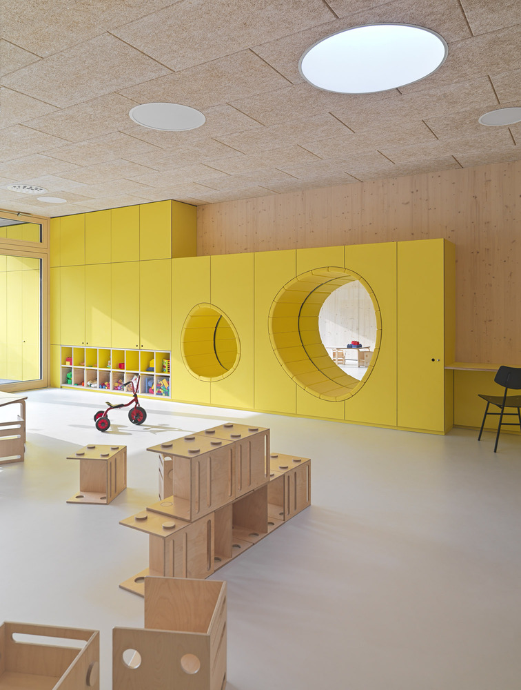 The irregularly shaped façade nooks, soften the building and place children as actors in the living façade everybody wants to play in windows. The building lives through the users and becomes a stage for the everyday life of children, their parents, their teachers, their cooks, and cleaners. The interior of the building shows off its wooden structure as much as possible, to give the interior a contrasting warmth. The interior thick playroom walls allow for storing of daybeds, toys, creations and form playful, upholstered nooks that allow children to peek into the outside world and observe their friends arriving in the morning or their grandparents in the afternoon to pick them up. The main stairs are doubled by a tunnel that only kids can use, to try and beat their parents to the top where a slide that disappears into the floor awaits.
