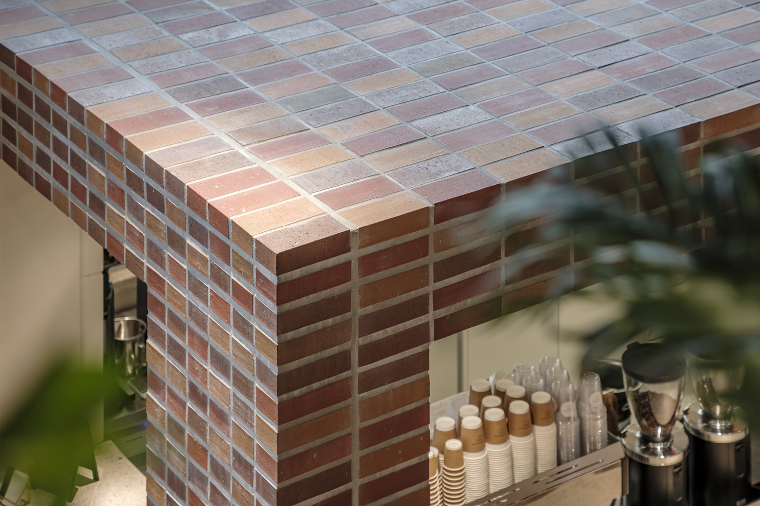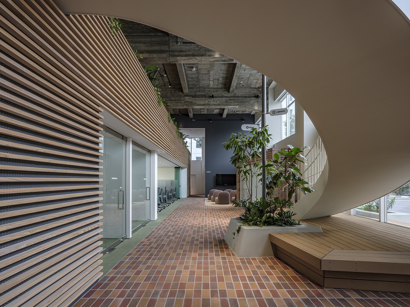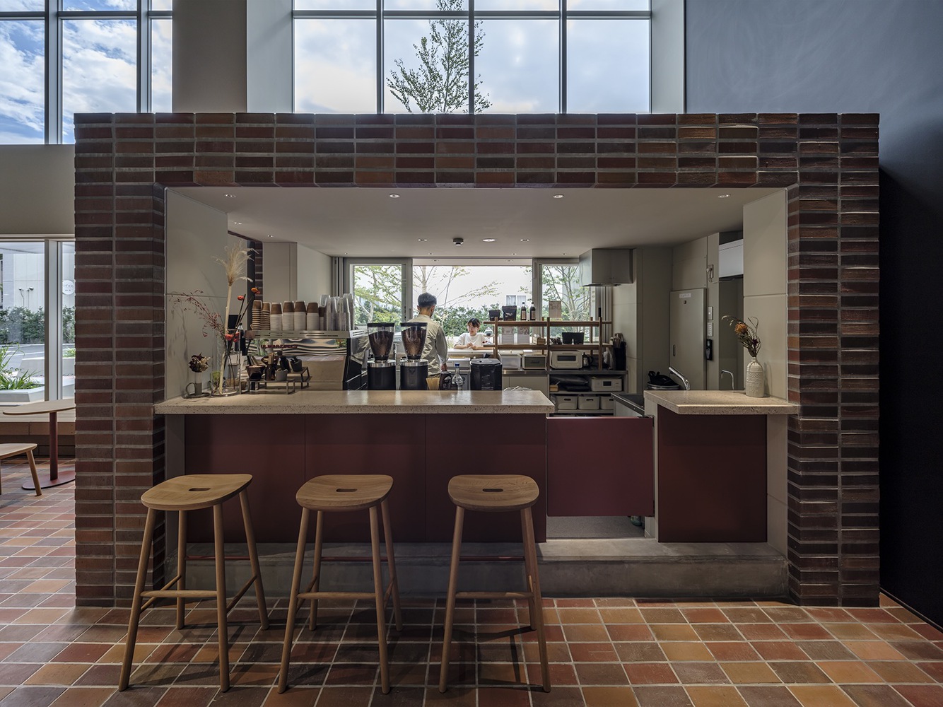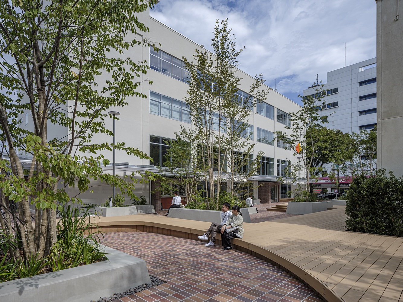 We envisioned the plaza as a "relay point" and a "resting place in the city." Our design offers shade and coolness in Maebashi, a city with intense summer heat, by scattering tall trees throughout the plaza and provides a variety of places using wood decks with moderate differences in elevation. The exterior walls of the two company buildings facing the plaza are covered with eaves, allowing people to continuously stroll through the roofed area from outside the city block to the plaza. The plaza is entirely paved with brick tiles, a common architectural language in Maebashi, creating a sense of continuity with other locations in the city. Irregularly shaped and raised planting strips, planted with tall trees, shrubs, and groundcovers, penetrate the brick tile pavement.