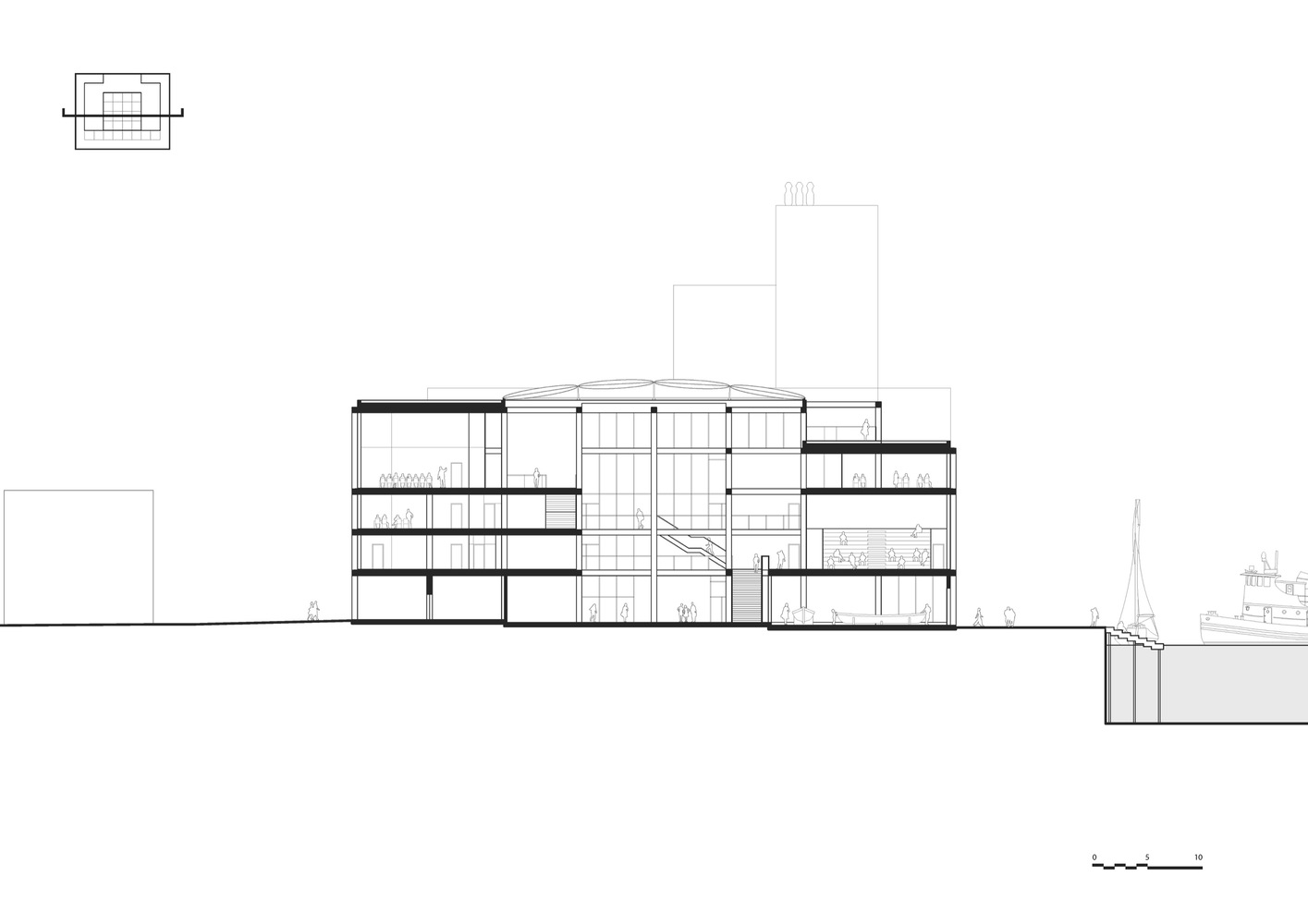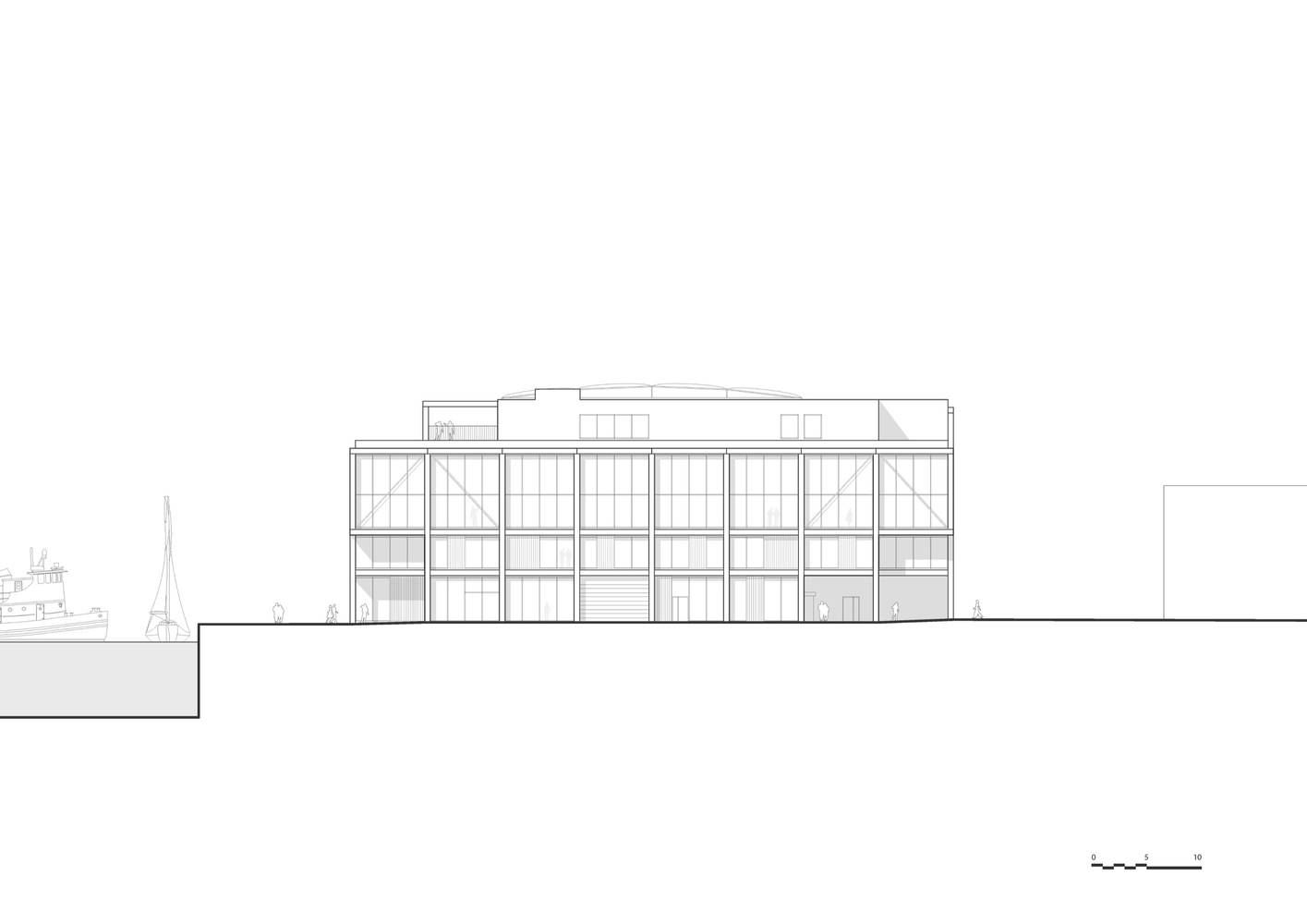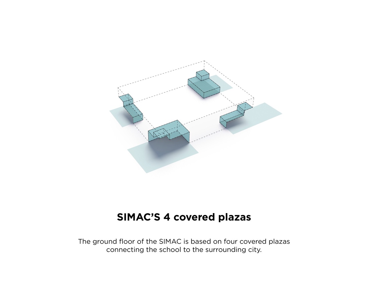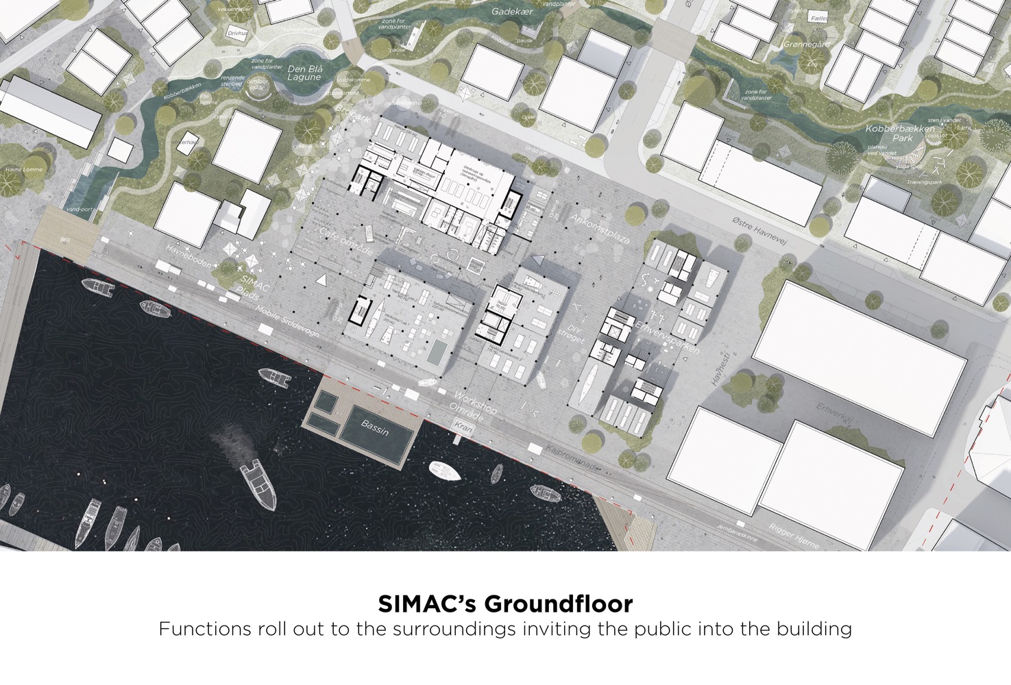 SIMAC is integrated into the course of the harbor promenade and the surrounding urban spaces. The building's floor plan is designed as a cross that forms a corner to four squares and opens up allowing public access to the communal facilities. The quay itself becomes an outdoor laboratory that highlights the school's work and maritime virtues.