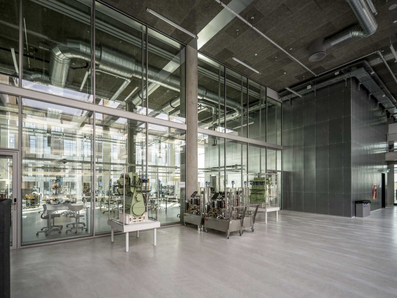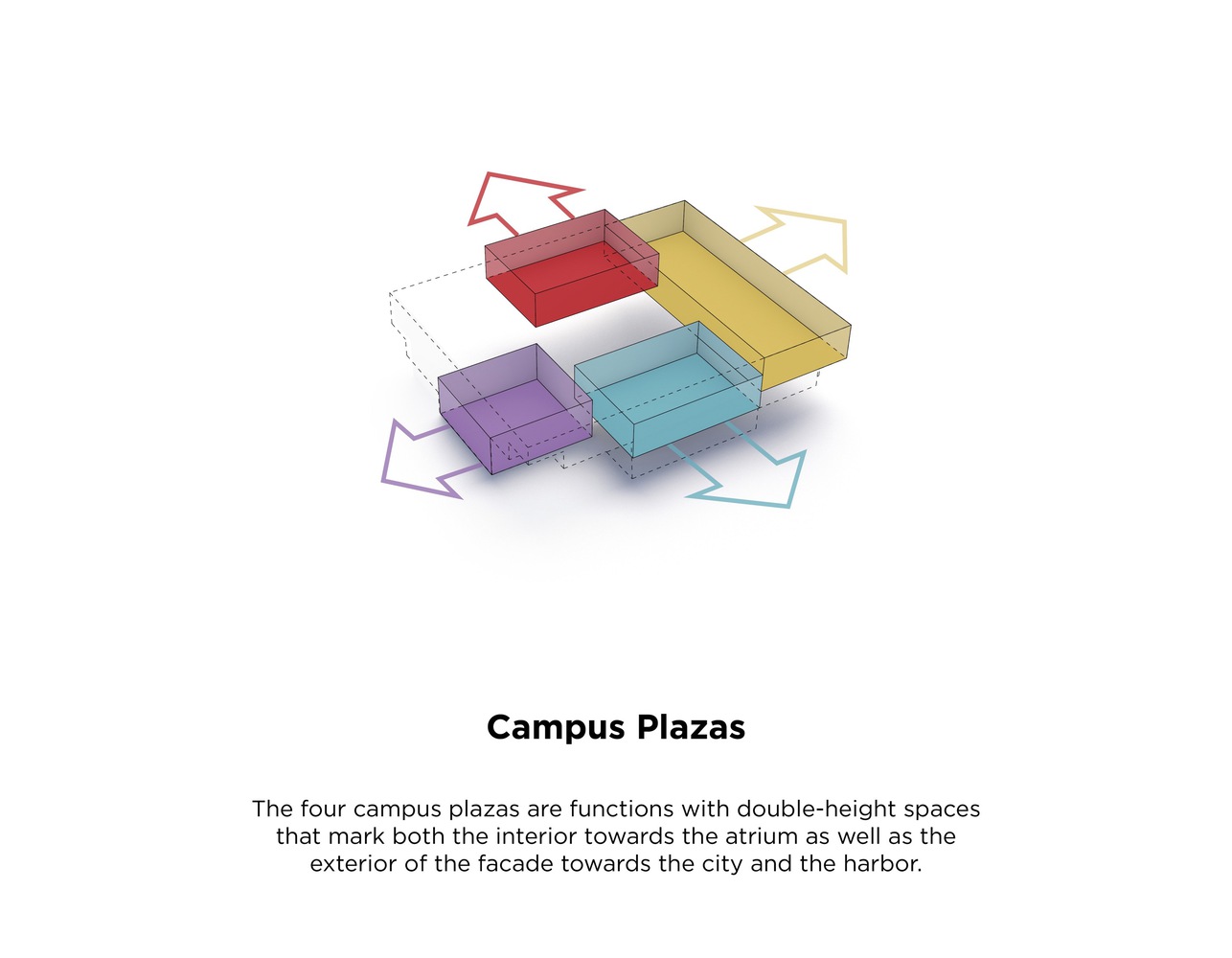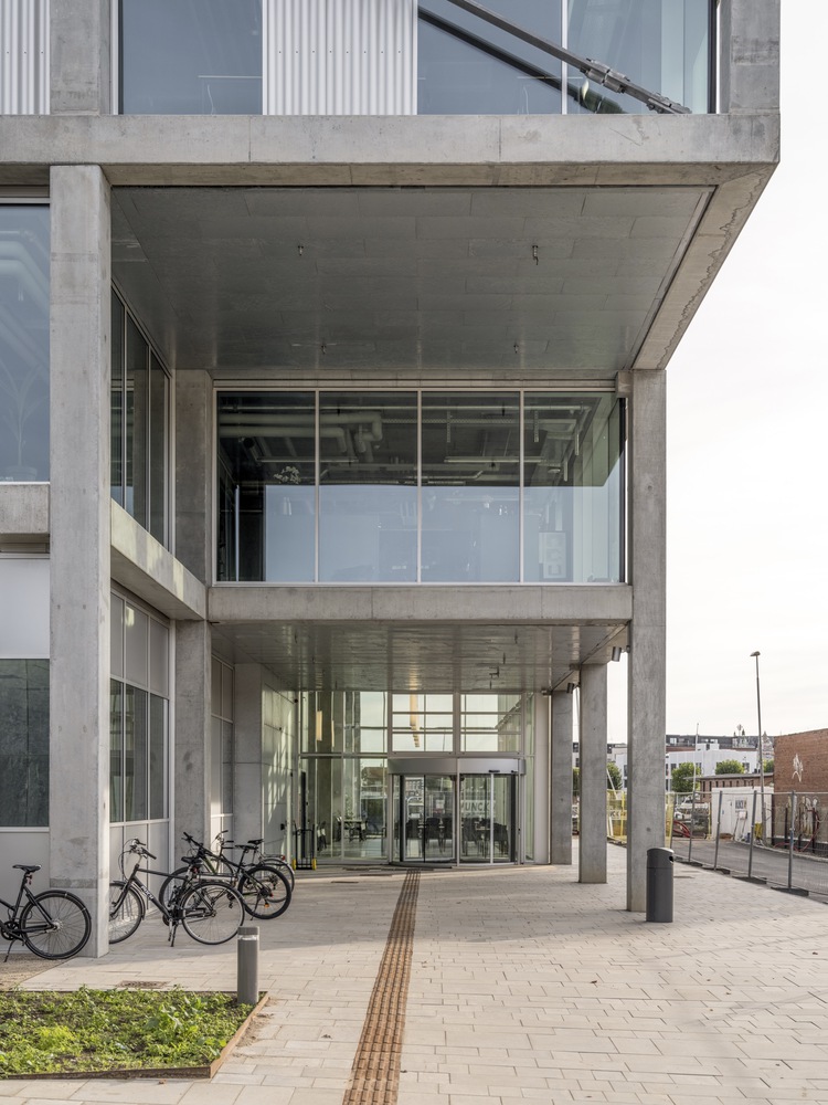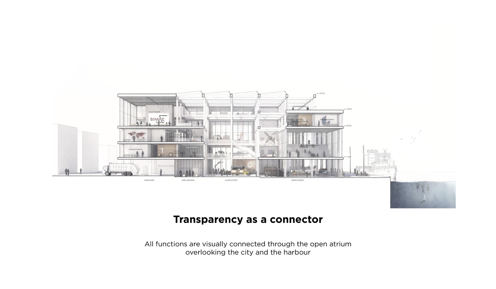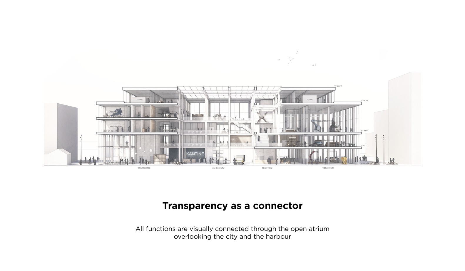 In the center of the building is an atrium that connects the building both visually and logistically across floors. Around the atrium, four double height spaces mark both the interior and exterior of the façade towards the city and the harbor and contain central functions such as a canteen, auditoria, and special workshops.