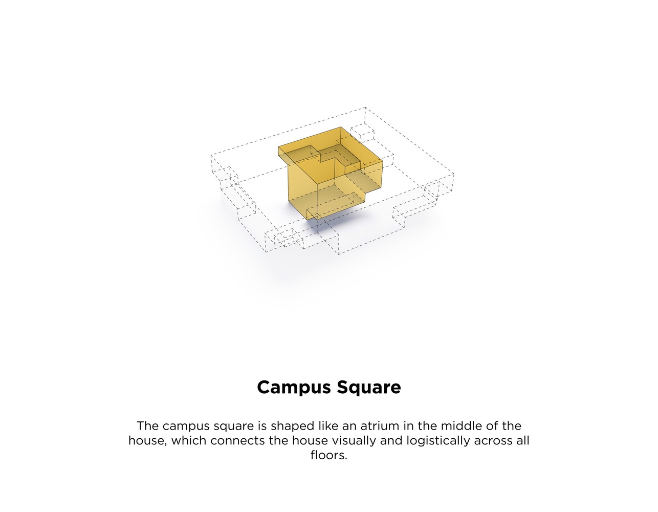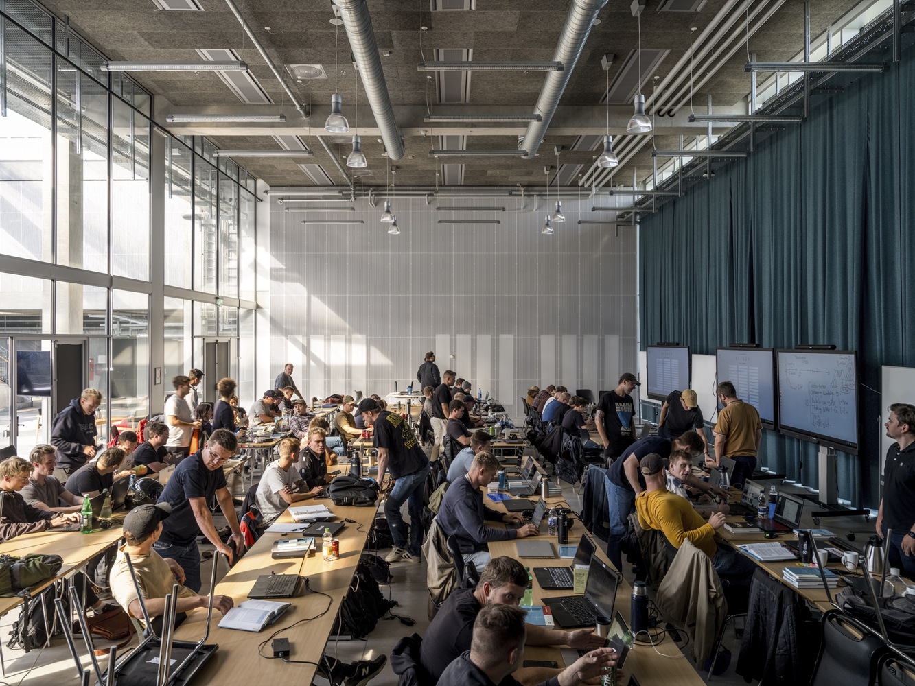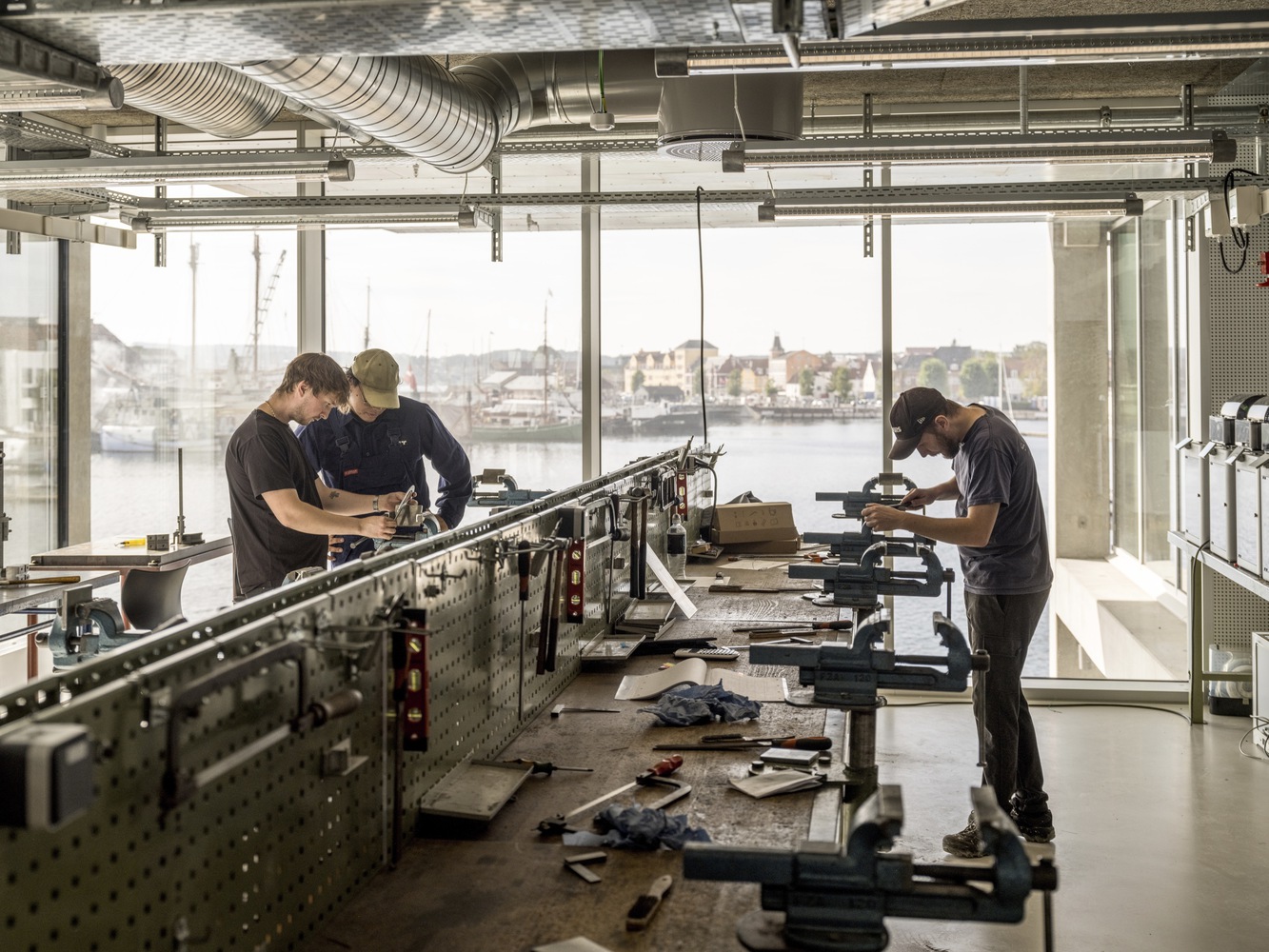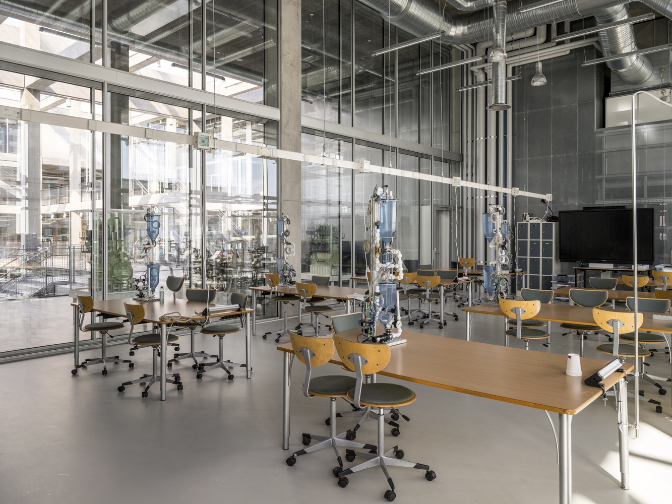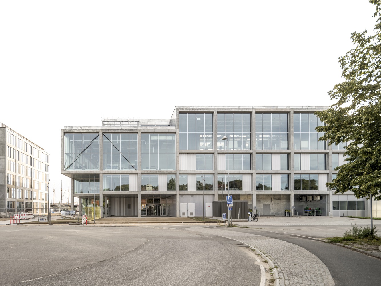 In the center of the building is an atrium that connects the building both visually and logistically across floors. Around the atrium, four double height spaces mark both the interior and exterior of the façade towards the city and the harbor and contain central functions such as a canteen, auditoria, and special workshops.