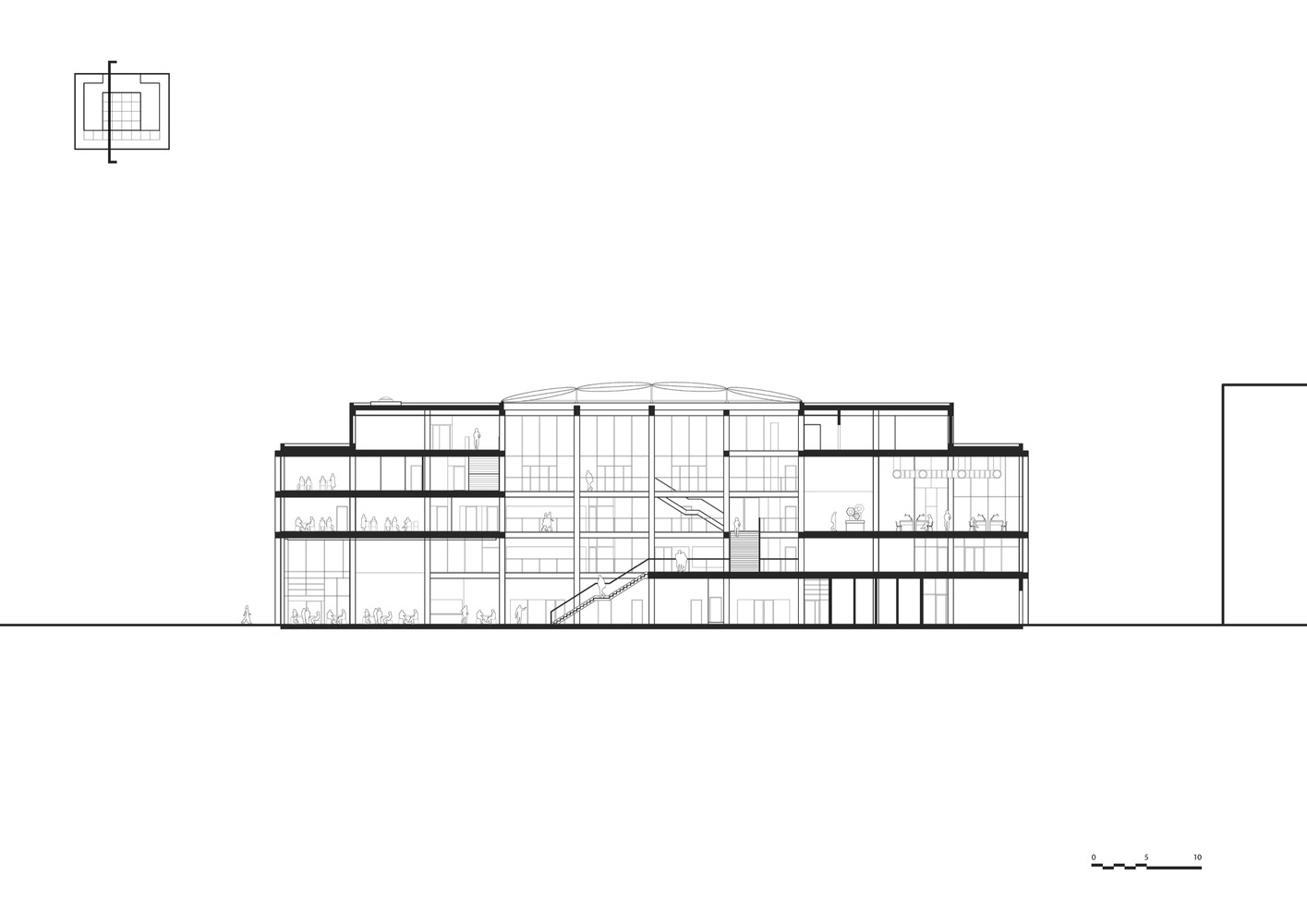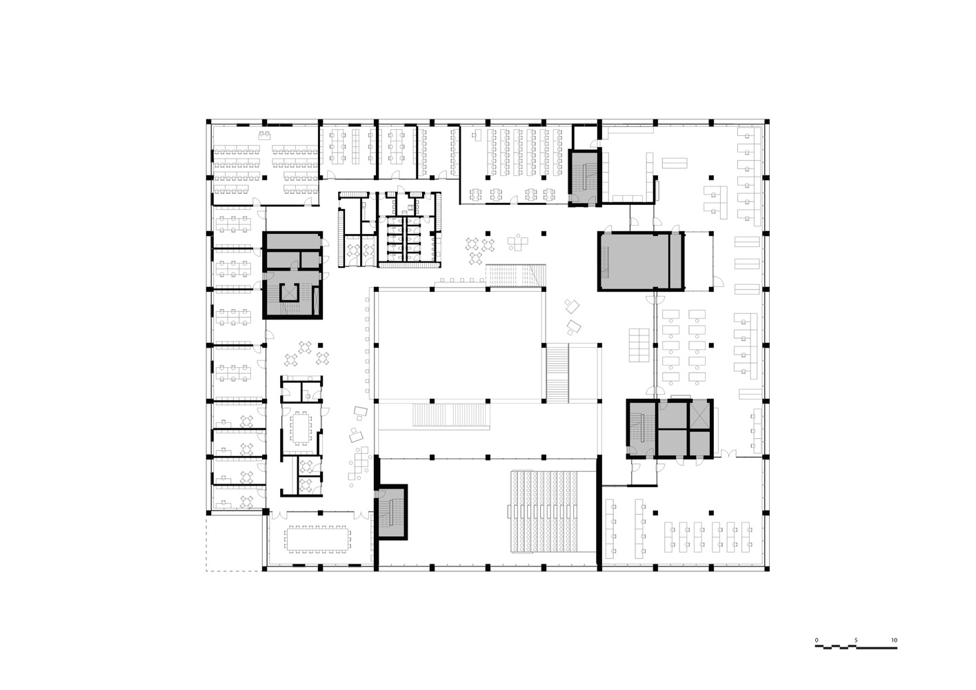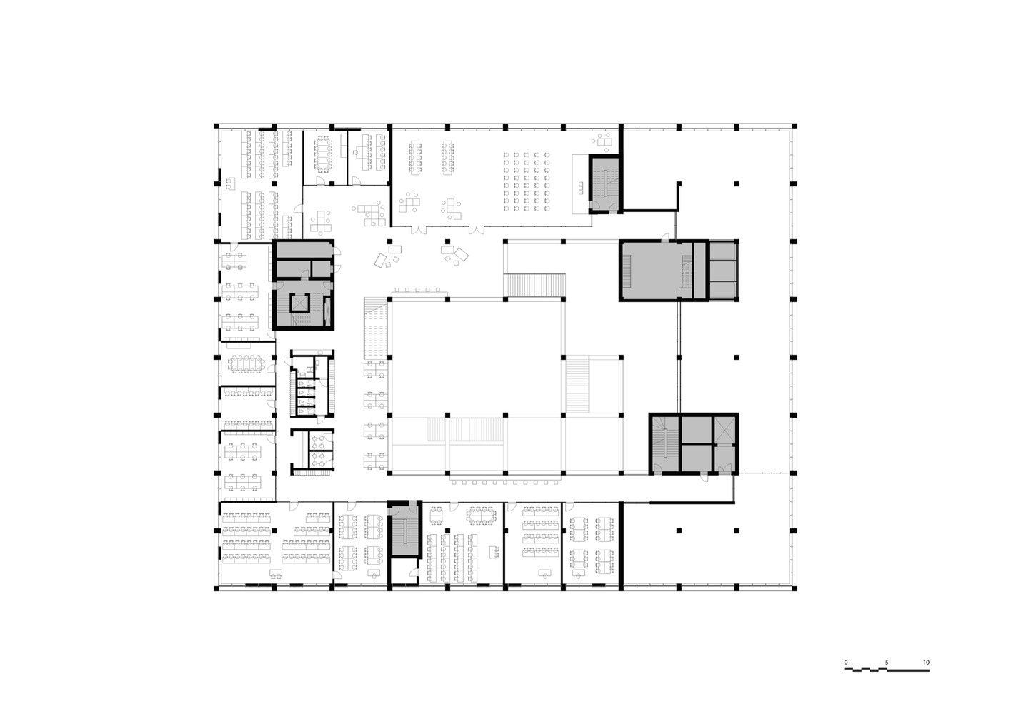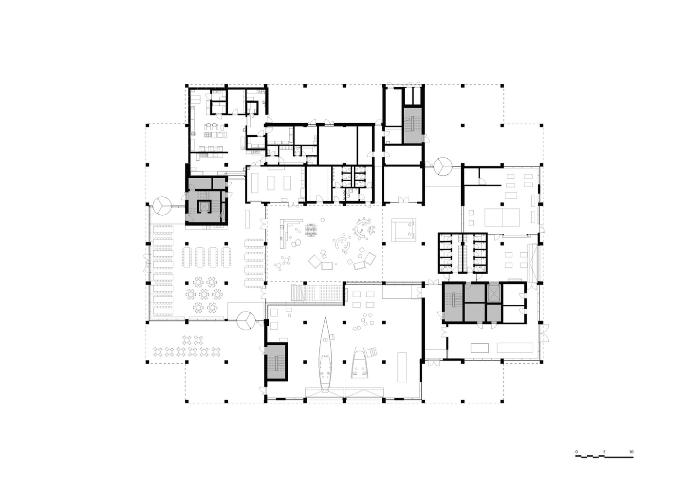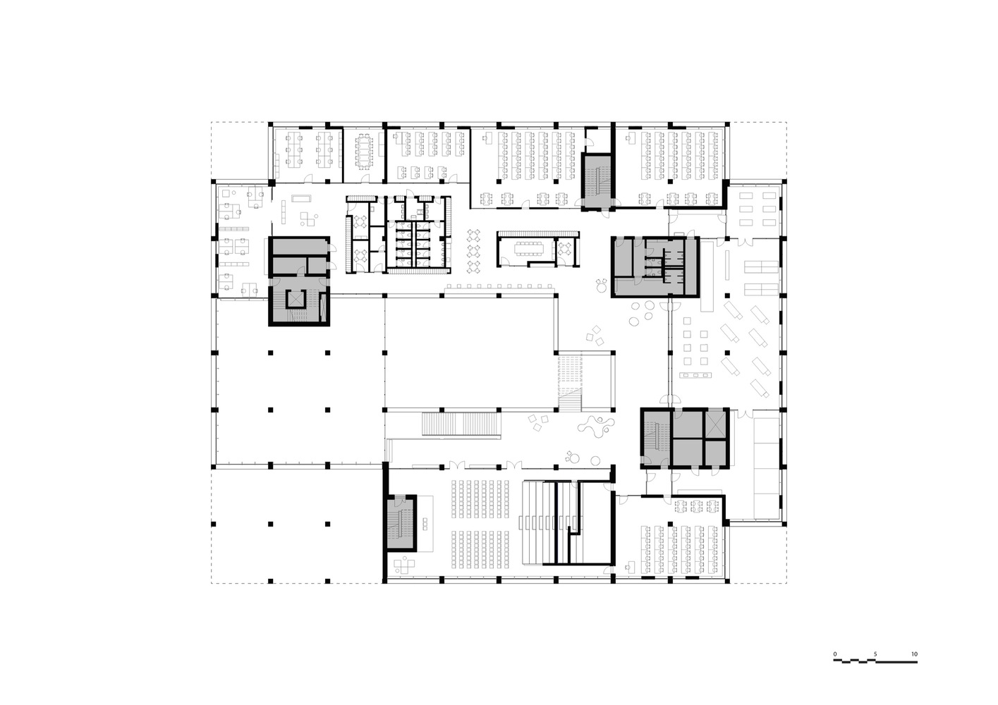 In the center of the building is an atrium that connects the building both visually and logistically across floors. Around the atrium, four double height spaces mark both the interior and exterior of the façade towards the city and the harbor and contain central functions such as a canteen, auditoria, and special workshops.