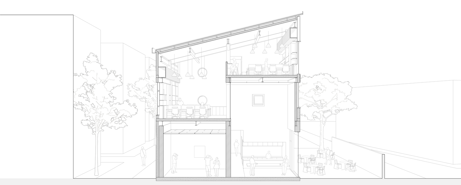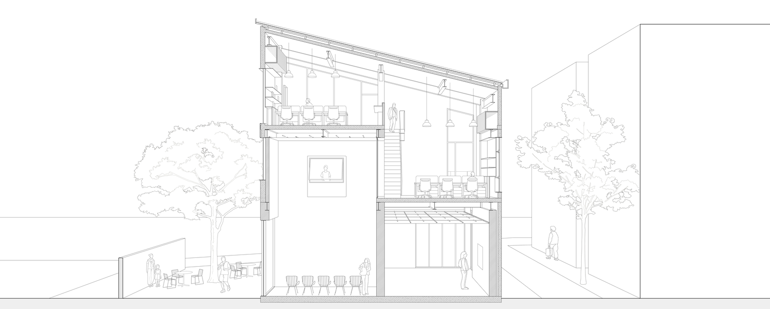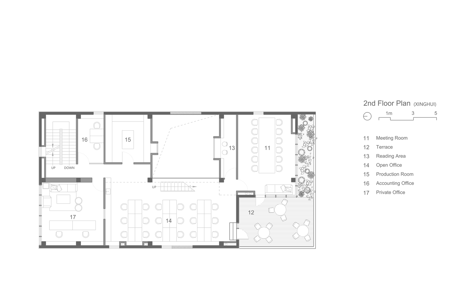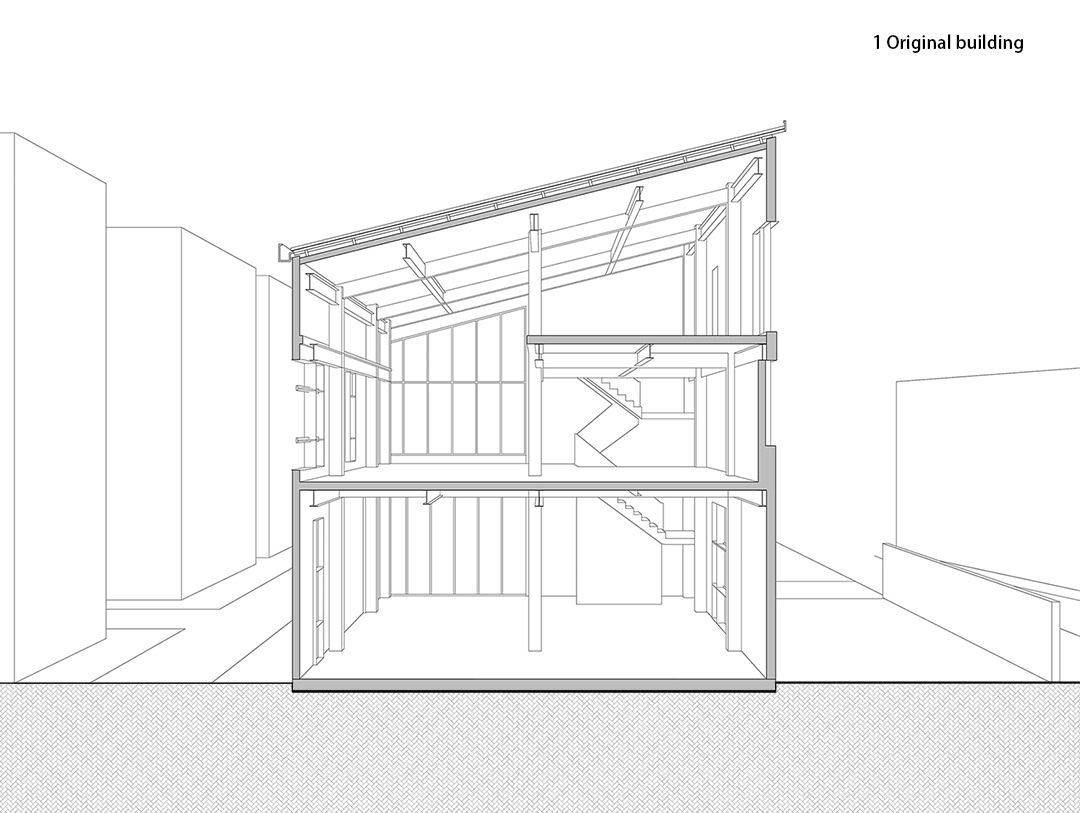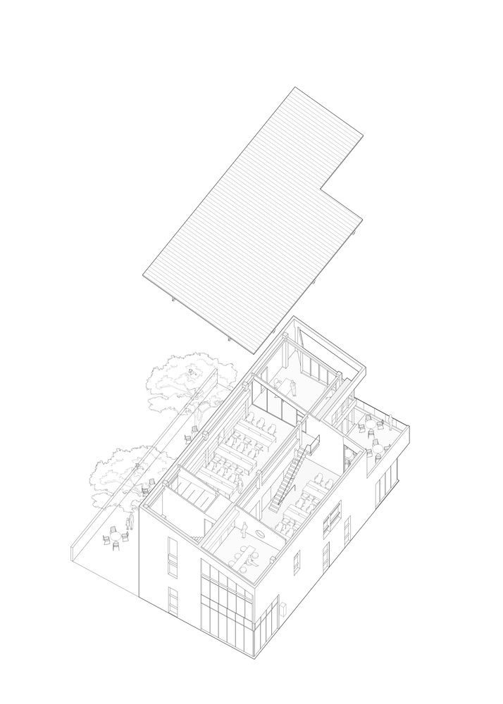 The various scenes of use between floors penetrate into each other through the voids and window openings, making the interior space fluid and three-dimensional. After removing the second-floor slab over the multi functional area, an inner courtyard was released, forming a progressive space with outer garden. The staggered distribution of the inner courtyard and the original overhead space between the second and third floors on the west side allows people in the garden, multi-functional area and open office area to communicate with each other at different heights, and establishes a new spatial order.