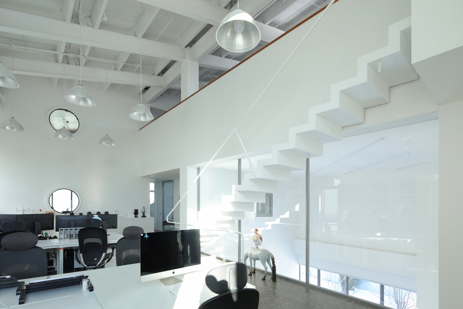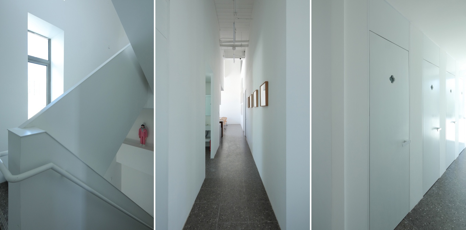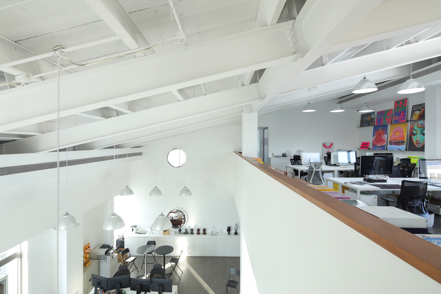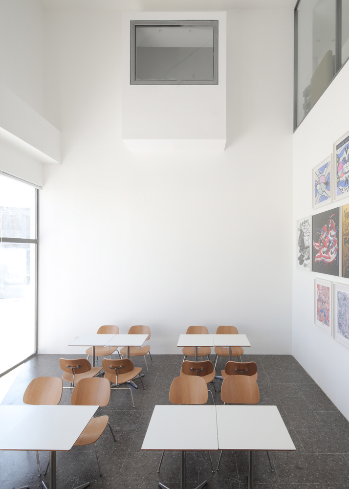 In addition, the multi functional area, as the core space, is not only an extension of the gallery, but also a place for the staff to negotiate, rest and exchange ideas, where a rich variety of office scenarios unfold freely. A lightweight staircase hangs over the open office area on the second floor, serving as a convenient path for employees of the two companies, which is also visible through the inner courtyard. Three frame-like openings surround the top of the multi-functional area, which can be used as a display window for hot toy figures. People going up and down the stairs, working or reading by the window can naturally enter the frame.