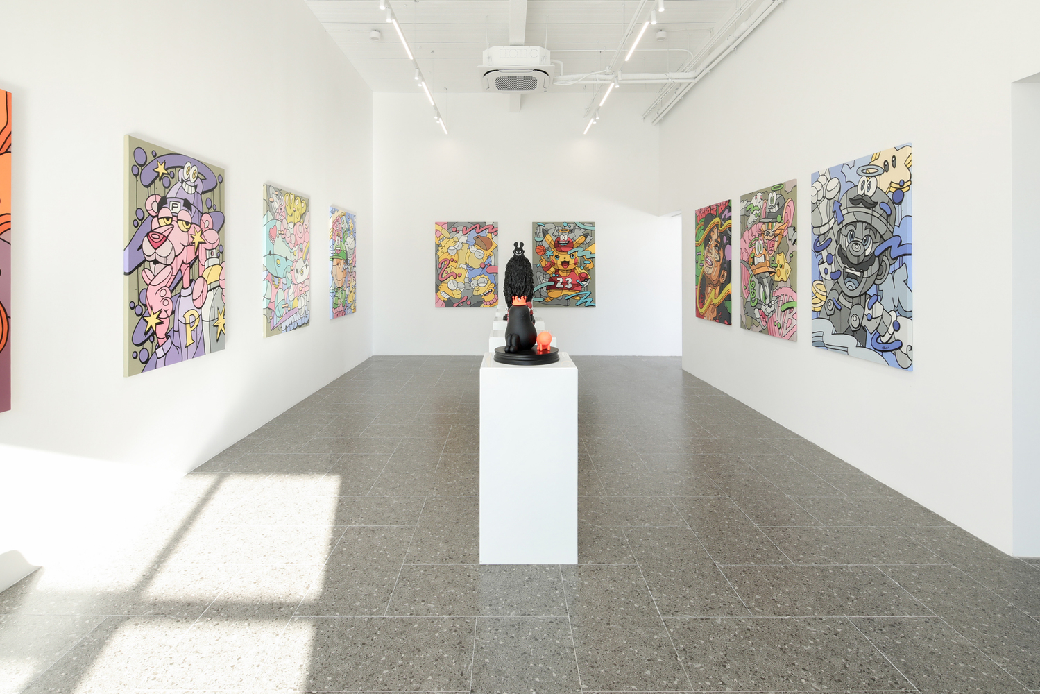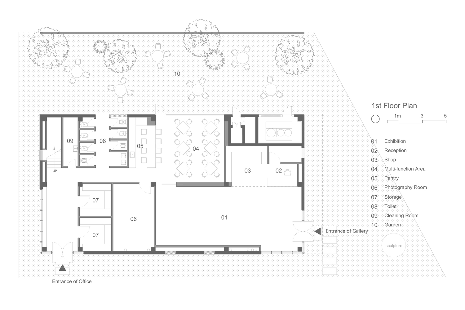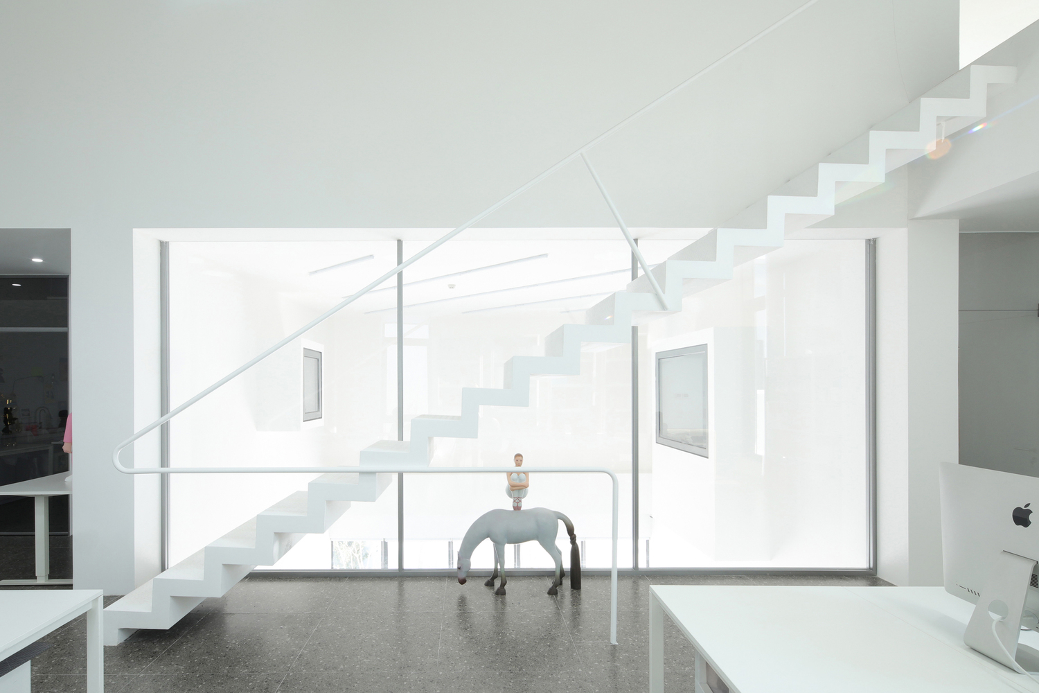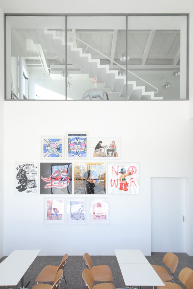 In addition, the multi functional area, as the core space, is not only an extension of the gallery, but also a place for the staff to negotiate, rest and exchange ideas, where a rich variety of office scenarios unfold freely. A lightweight staircase hangs over the open office area on the second floor, serving as a convenient path for employees of the two companies, which is also visible through the inner courtyard. Three frame-like openings surround the top of the multi-functional area, which can be used as a display window for hot toy figures. People going up and down the stairs, working or reading by the window can naturally enter the frame.