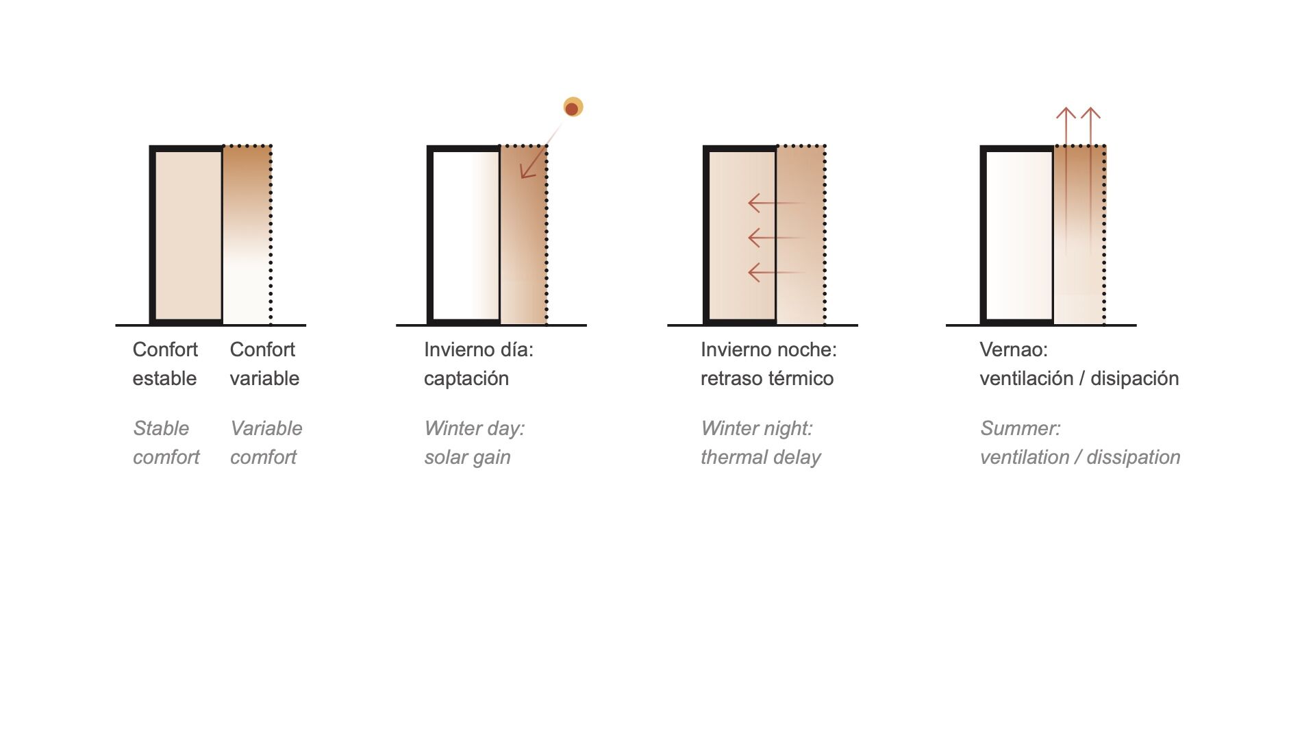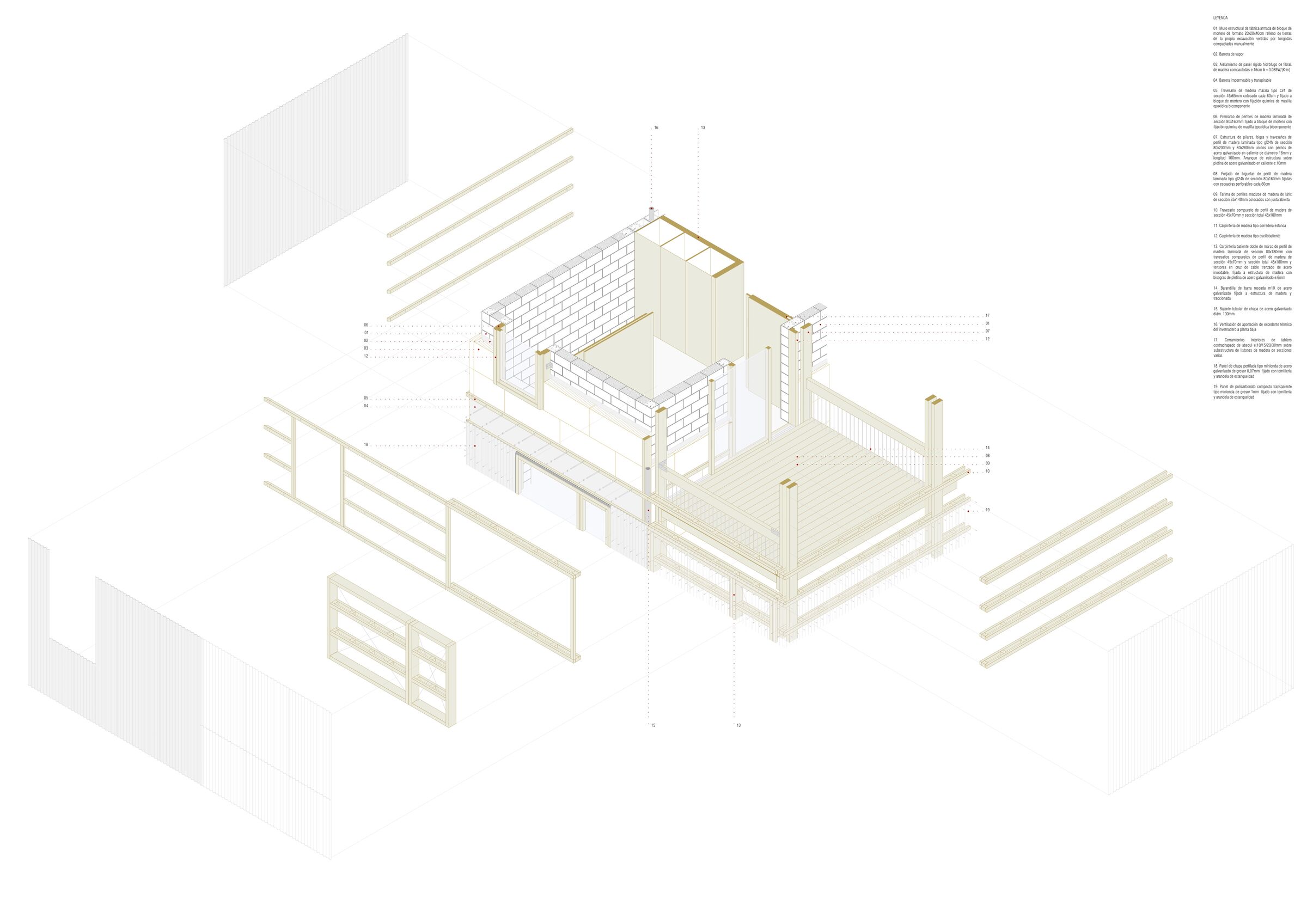 To increase the accumulation of passively captured energy within the winter garden/sunroom, taller11 incorporated construction methods that provide thermal inertia. For several reasons, including budget and speed of execution, the volume that houses the home’s interior spaces — bedrooms and living areas — is constructed from mortar block masonry — the cavities are filled with compacted earth from the site excavation. “This results in a low cost construction system with high thermal inertia and good hygrothermal performance, which at the same time reduces construction waste,” says taller11. (Hygrothermal performance “is determined by the interdependent absorption, desorption and storage of heat and moisture within the building envelope.”)