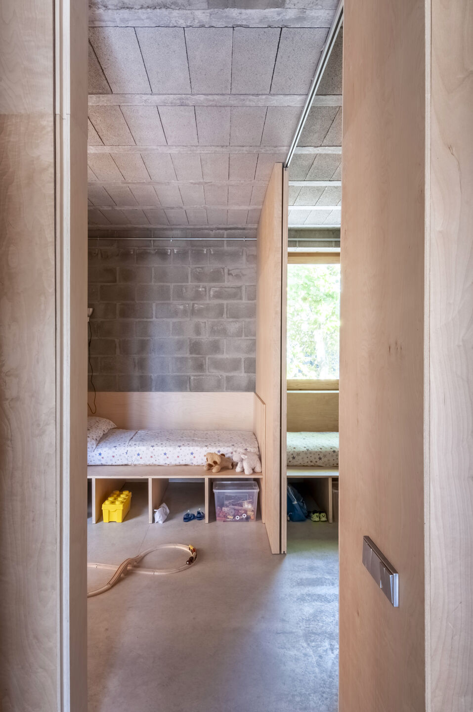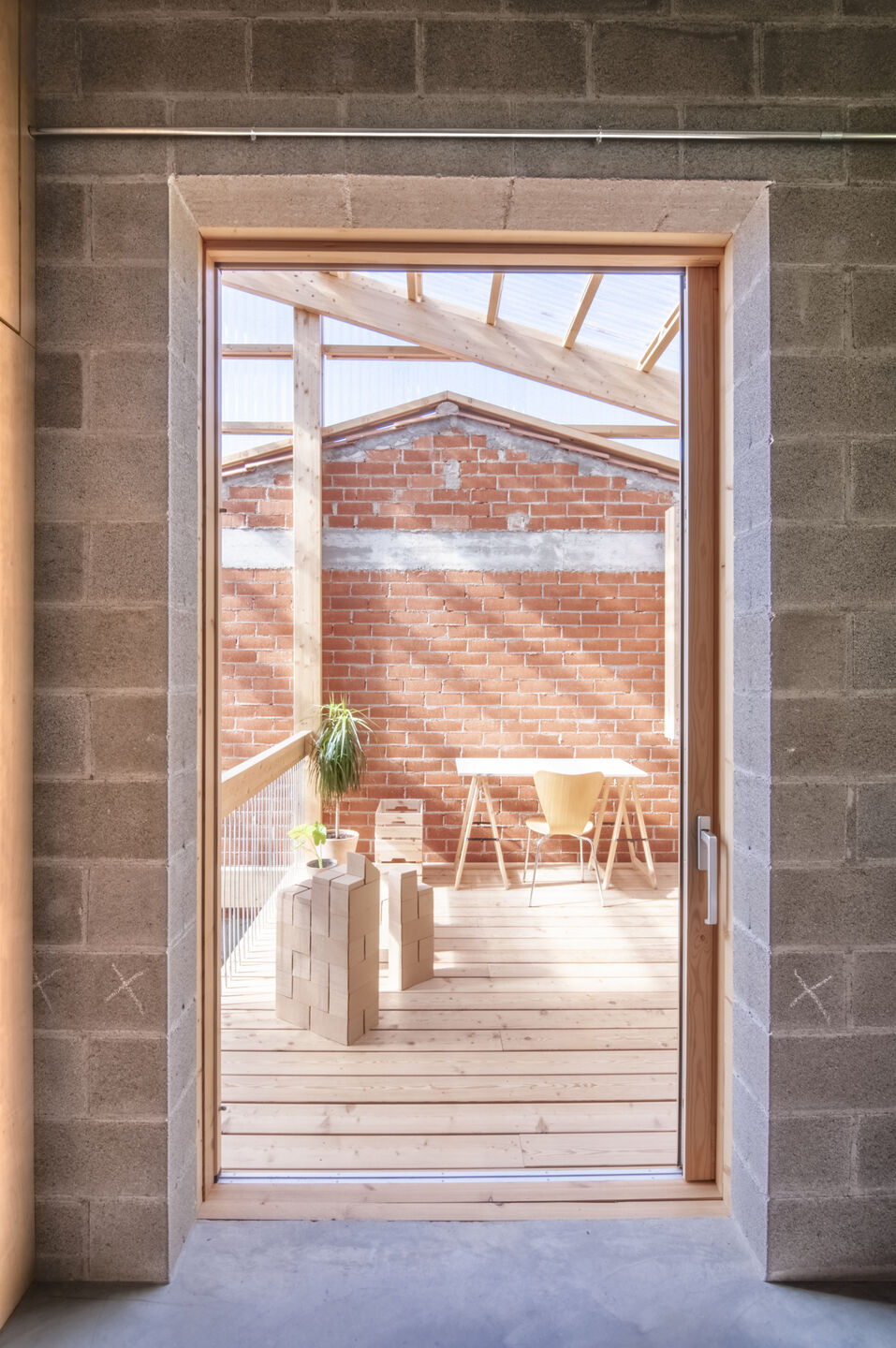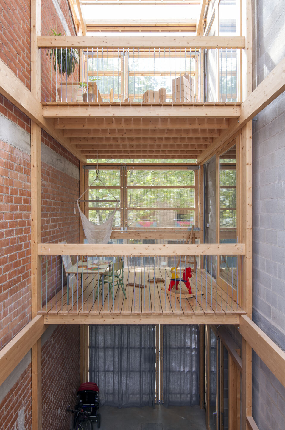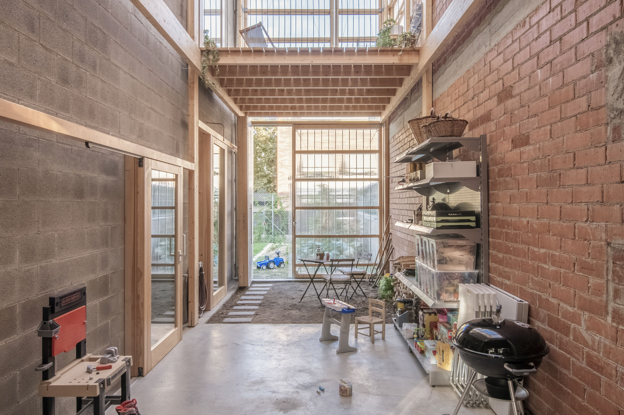 A house of two halves, taller11 placed the bedrooms and living areas in a heated volume of massive mortar block masonry. On the other side of this, the studio created a winter garden/sunroom — a light and transparent volume, built with a wooden frame, that facilitates solar capture. Suspended wood ceilings act as covered balconies, multipurpose spaces to be used for play and relaxation. The intermediate wall between the two halves has not been insulated — this “acts as an accumulator of incident solar radiation, releasing it into the interior at night,” says taller11. The specific thickness of this wall ensures it compensates for any energy loss.