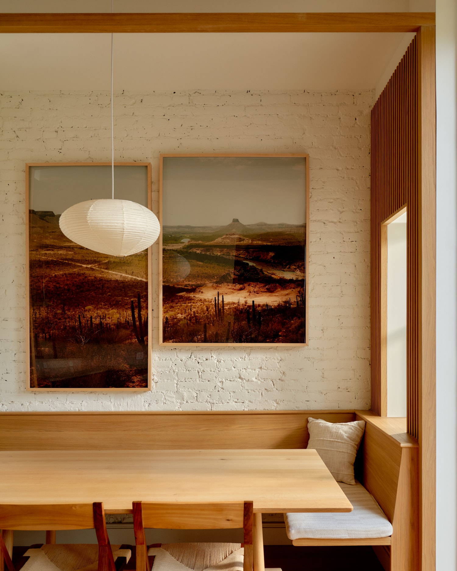 The color palette for the home featured warm whites, complementing the wood tones and creating a welcoming atmosphere. Colorful accents were incorporated at the suggestion of one of the homeowners, who has a design background. This included artworks like Marc Gabor’s ‘Vizcaino Desert Diptych’ from the Tappan Collective in the kitchen and dining area, and photographs inspired by the homeowners’ desert travels in the United States. Materials such as travertine and lime wash were strategically used to enhance the richness of the spaces. Hung’s design philosophy was to create a sense of calm luxury, achieved through the use of unlacquered brass fixtures, custom lighting, and lime wash finishes, all contributing to an atmosphere of clean, organized tranquility.