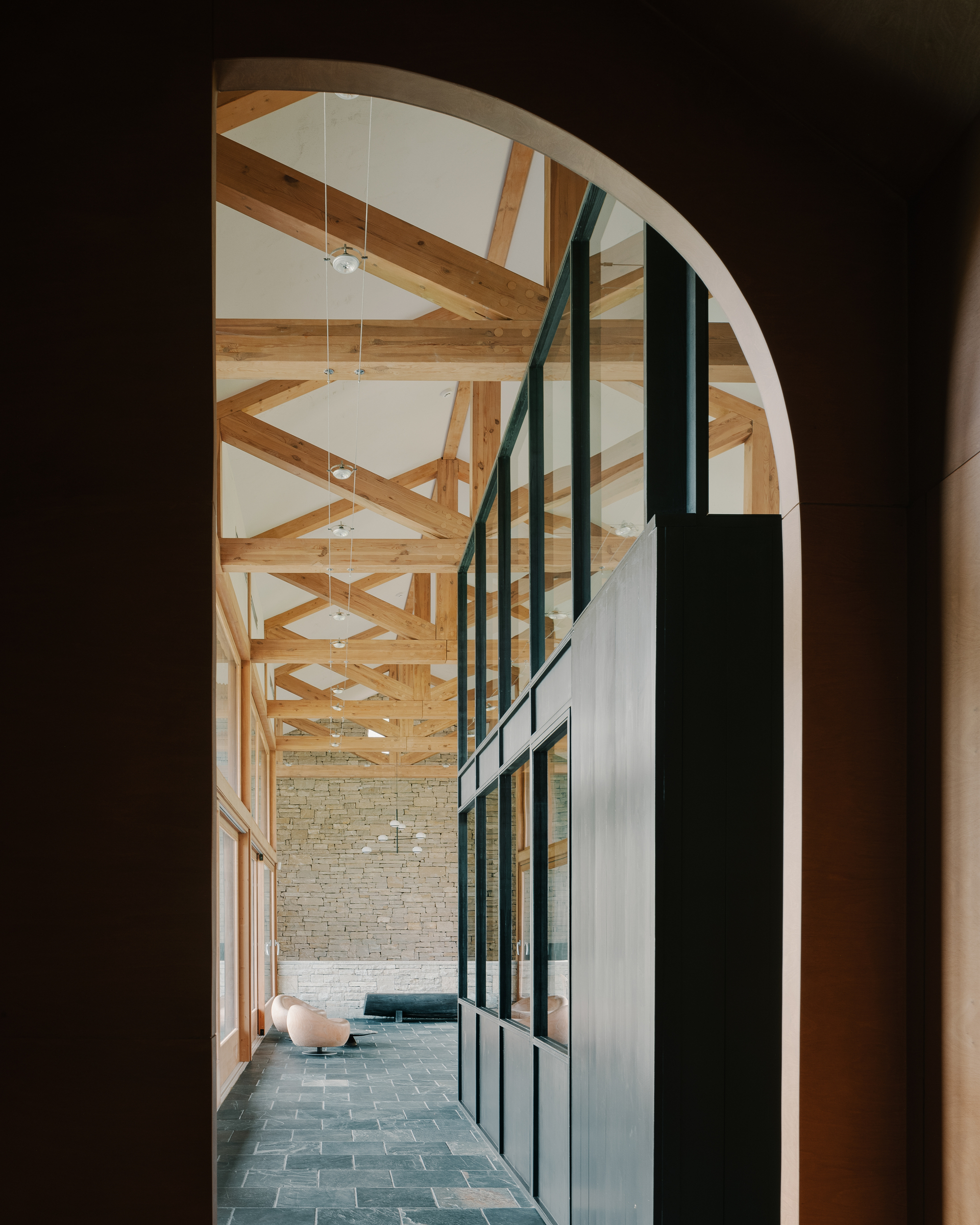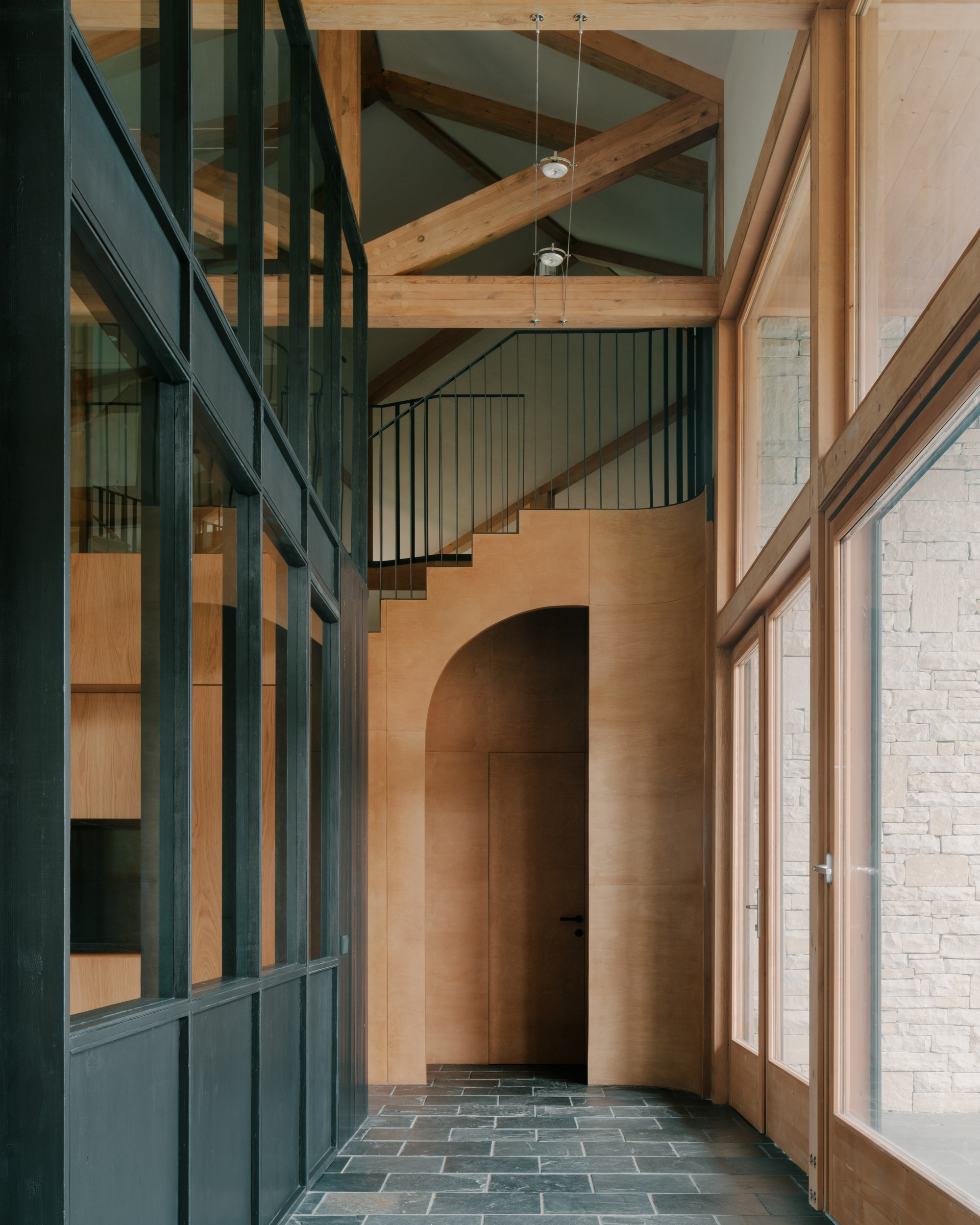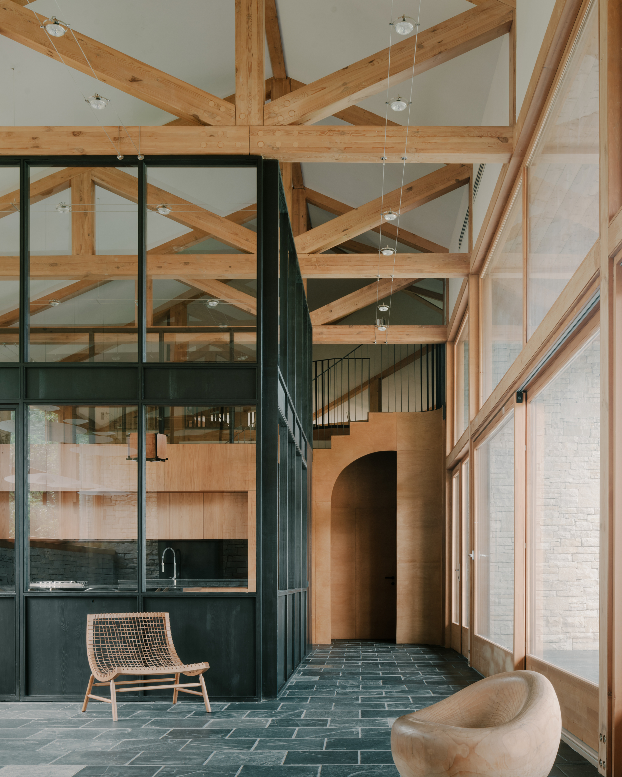 House in Tvaladi is a minimal residence located in Tvaladi, Georgia, designed by NS Studio. This house, a study in architectural harmony, pairs a classic stone façade with modern structural forms. Constructed as a single-story edifice, the house employs a combination of stone and wood. These materials are not merely structural; they play a significant role in defining the interior’s character. The design intentionally blurs the boundaries between the building and its natural surroundings. This is achieved through the use of large windows and openings in the façade, which not only flood the interior with natural light but also visually integrate the house with the landscape outside. Inside, the residence celebrates a juxtaposition of textures and finishes. The design approach carefully balances raw, tactile elements with more refined details, creating a cohesive interior environment. Complementing the main structure is a cellar, positioned perpendicular to the house. This additional element mirrors the primary architectural language, contributing to a unified aesthetic across the property.