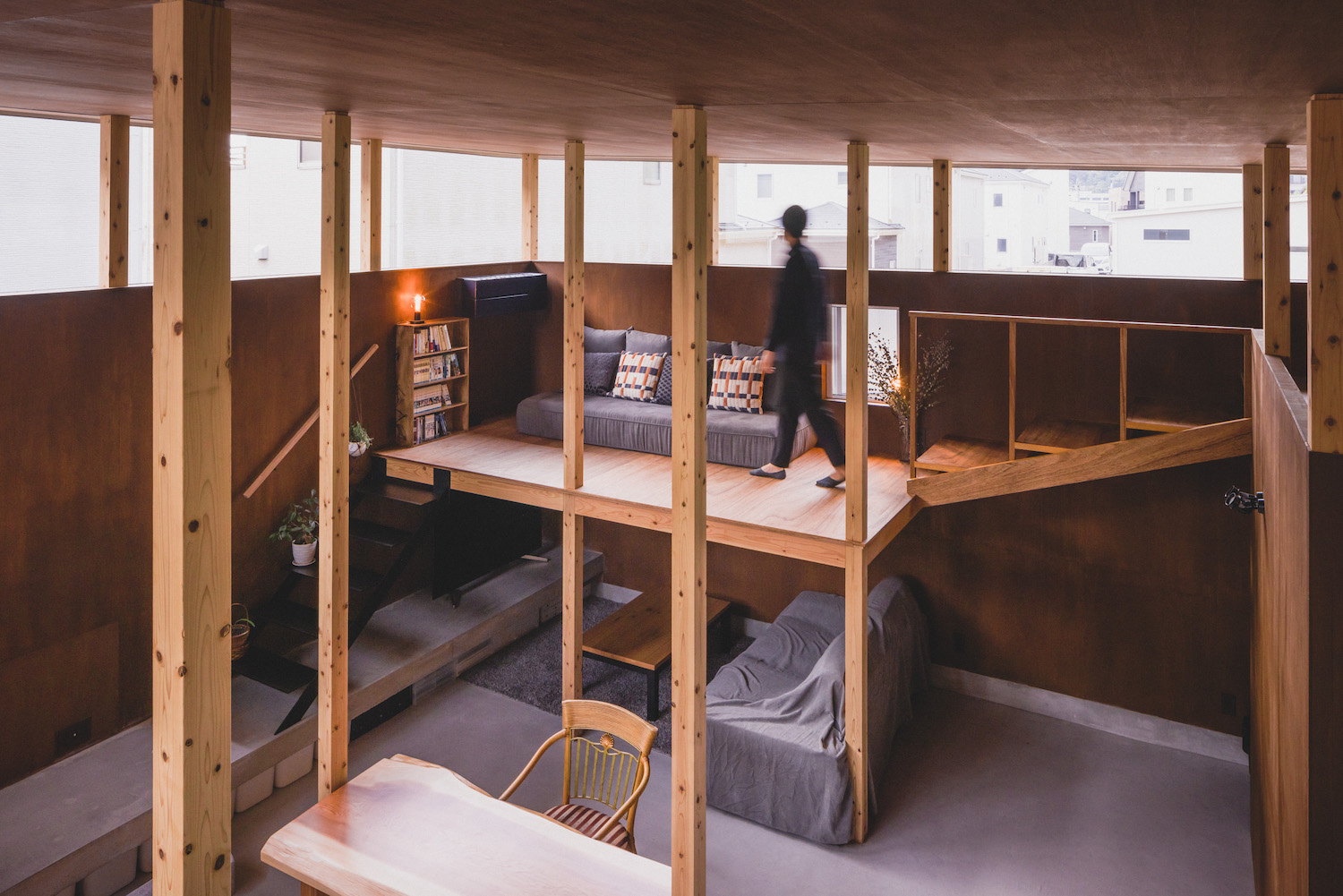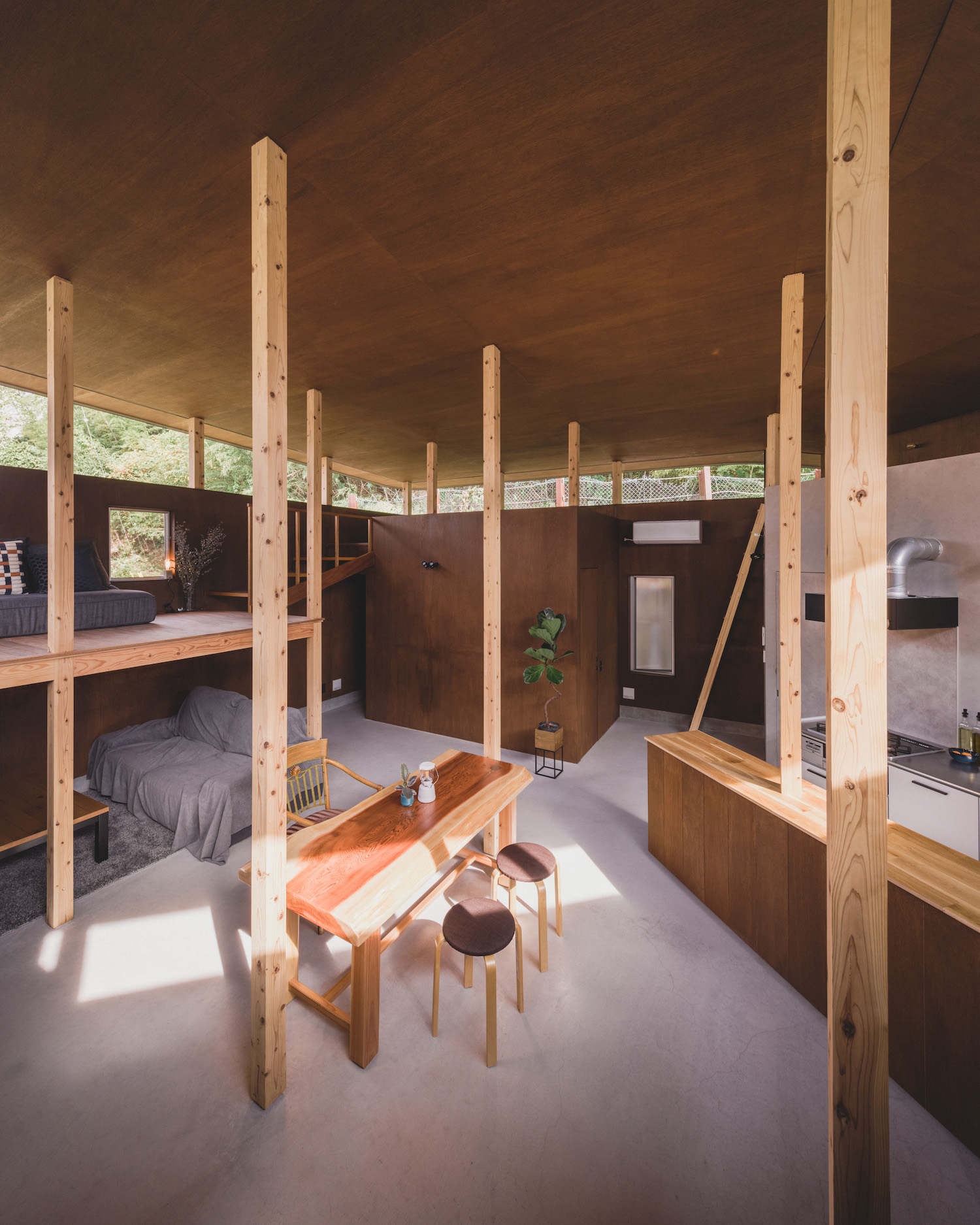 Clerestory windows, set above these walls, give the illusion of a floating roof. The interior is marked by a large, open area interspersed with box like structures housing private functions such as bathrooms. These boxes, along with a series of pillars, create a depth and complexity in the space, encouraging the inhabitants’ free movement and activity. A notable feature of this home is its use of pillars. Spaced 1.8 meters apart, these 90mm square columns, extending up to 3.5 meters in height, mimic the density and scale of furniture, creating an atmosphere akin to a forest.