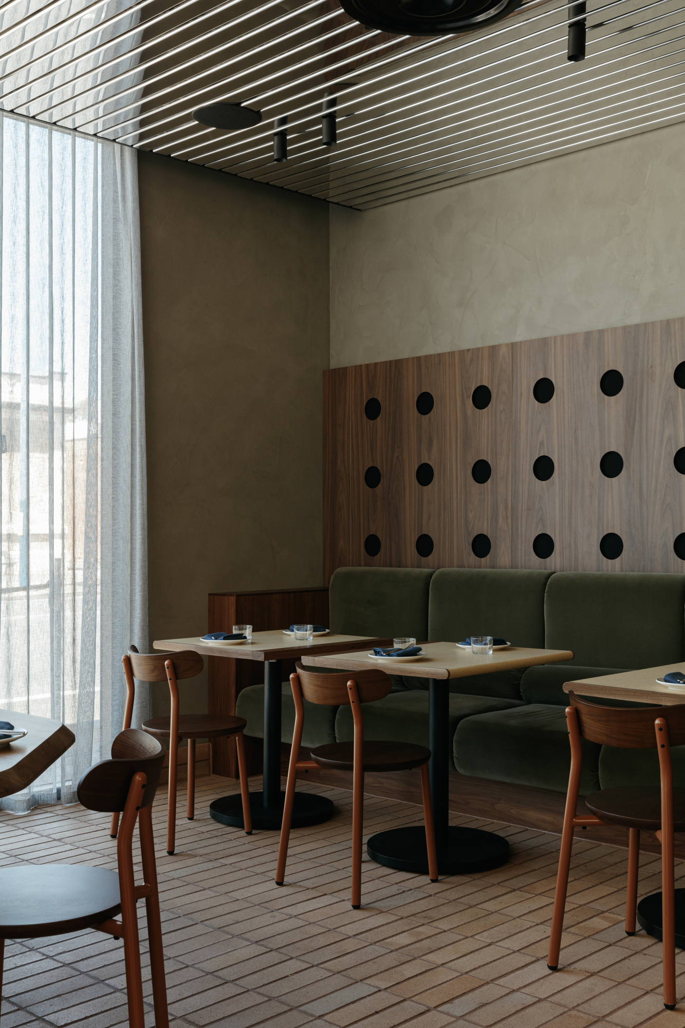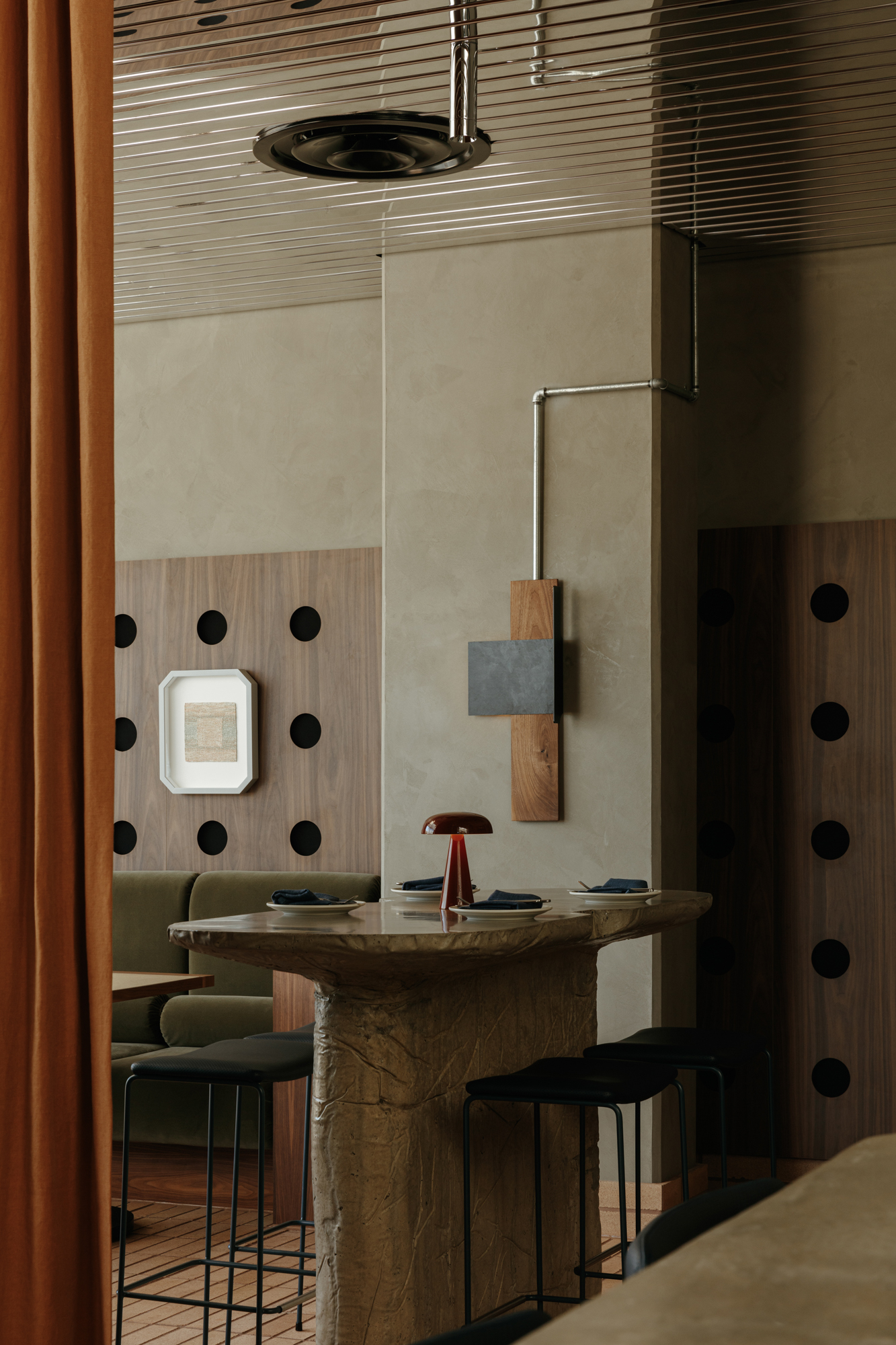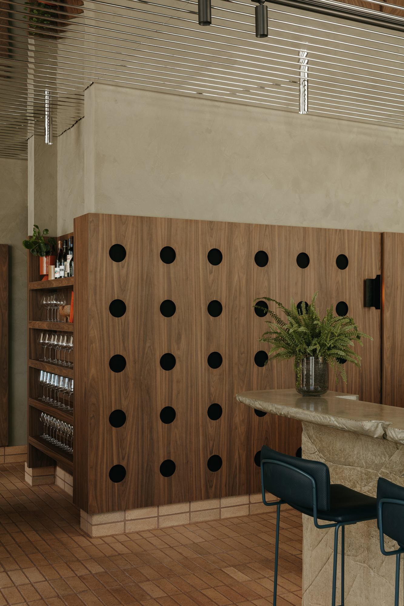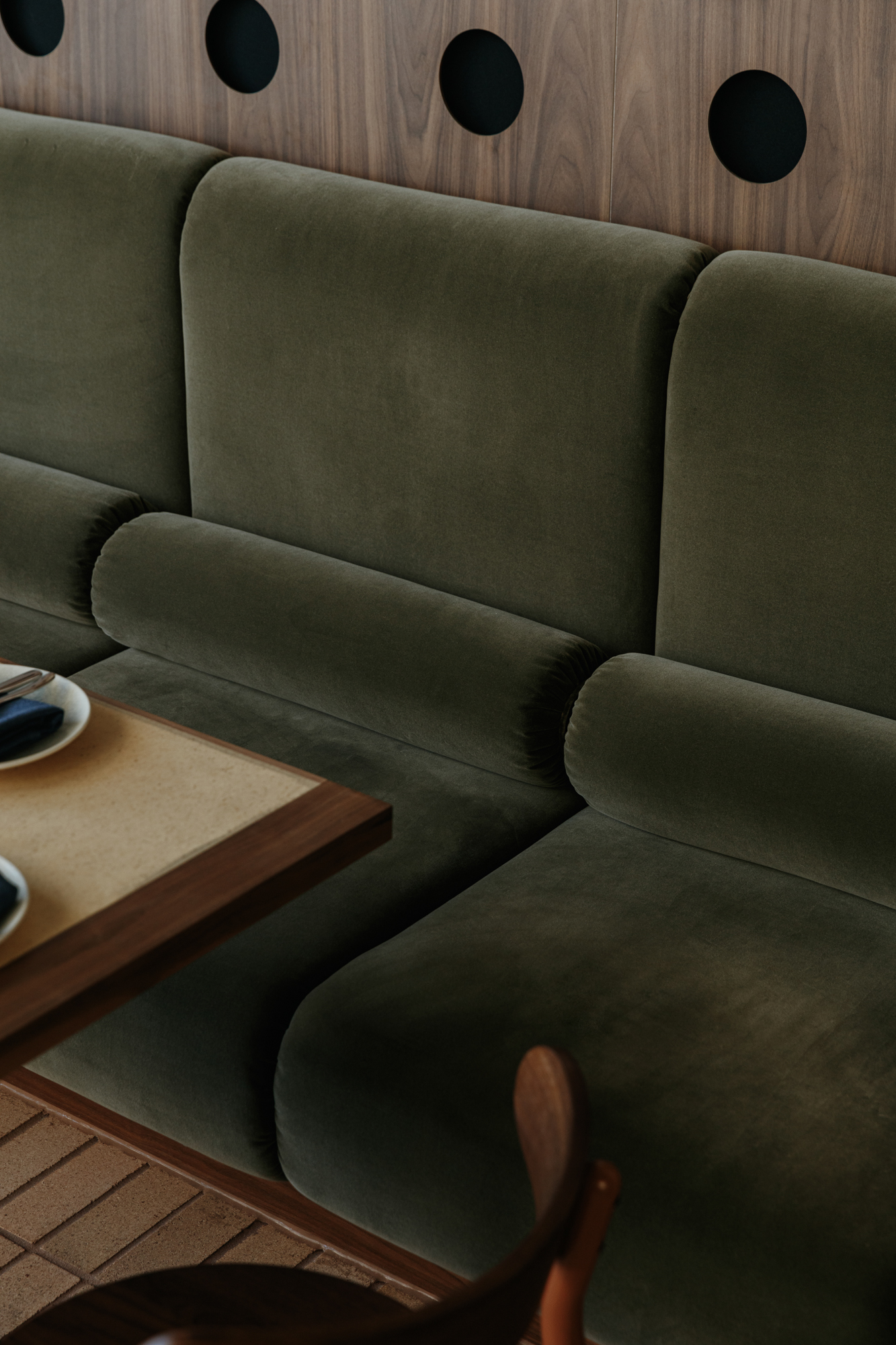 Serving as practical elements while also being integral to the palette, the reflective ceiling and perforated timber wall panels possess acoustic properties to cushion sound as the volume turns up for after dark parties. The smooth walnut panelling wears its grain with sophistication, providing a tonally delightful companion to the warm brick-tiled banquette seating, skirting and floor below.