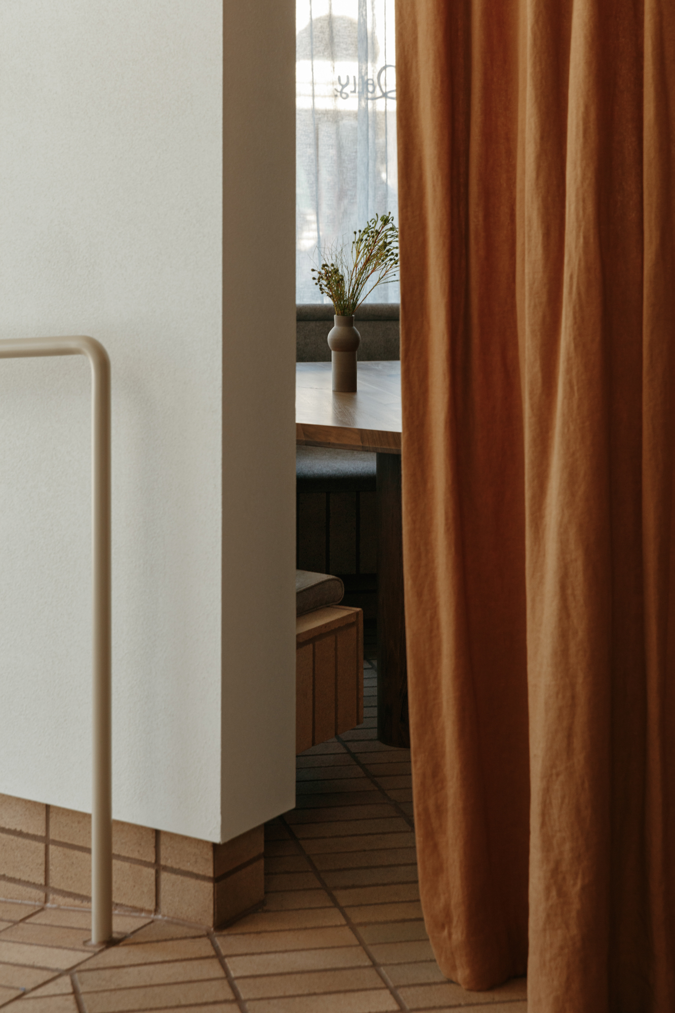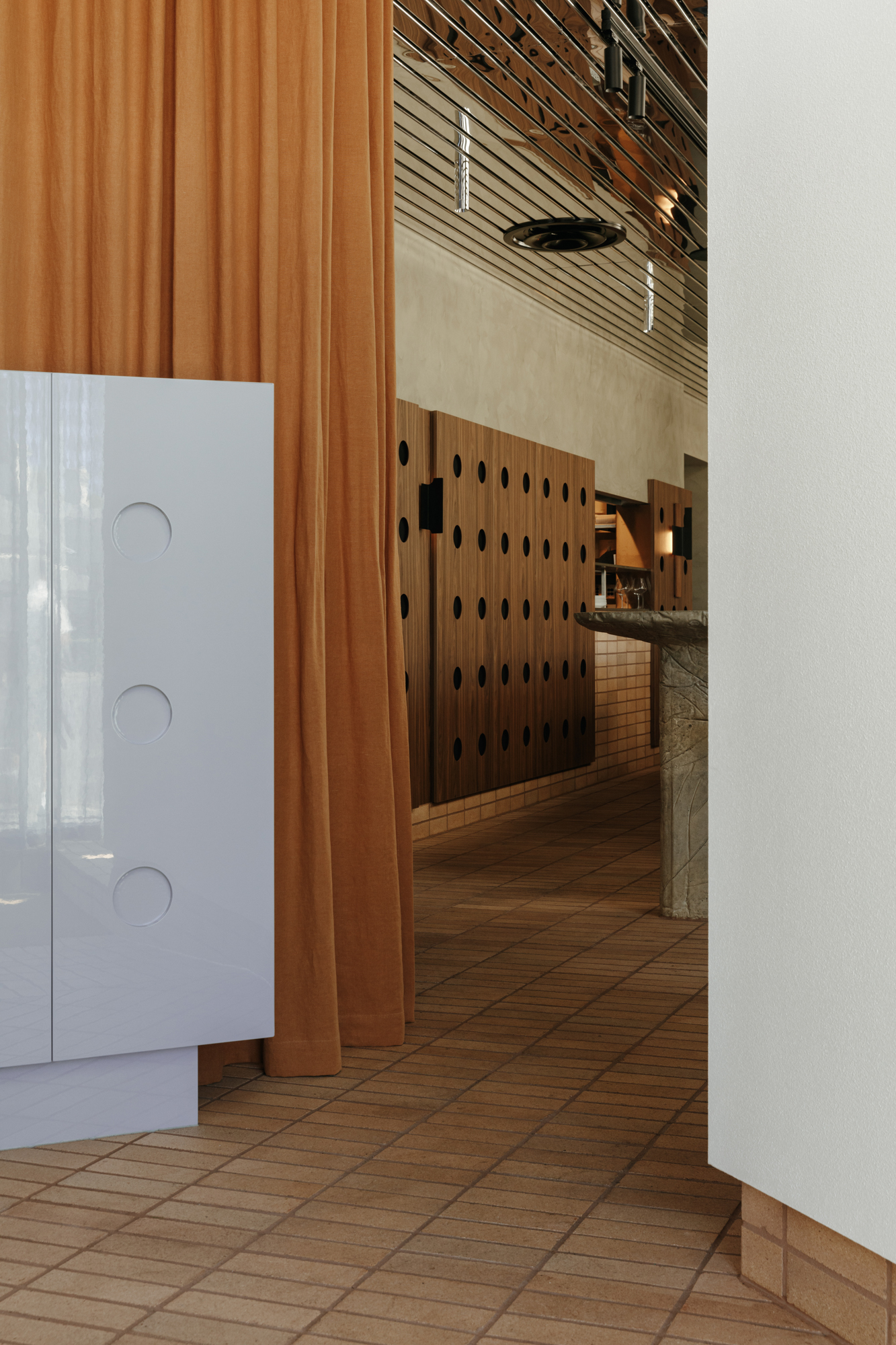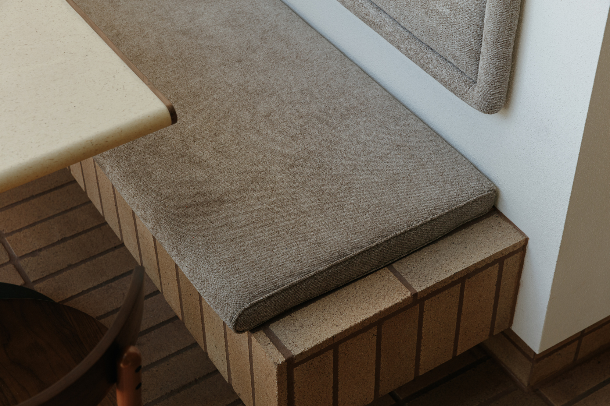 Serving as practical elements while also being integral to the palette, the reflective ceiling and perforated timber wall panels possess acoustic properties to cushion sound as the volume turns up for after dark parties. The smooth walnut panelling wears its grain with sophistication, providing a tonally delightful companion to the warm brick-tiled banquette seating, skirting and floor below.