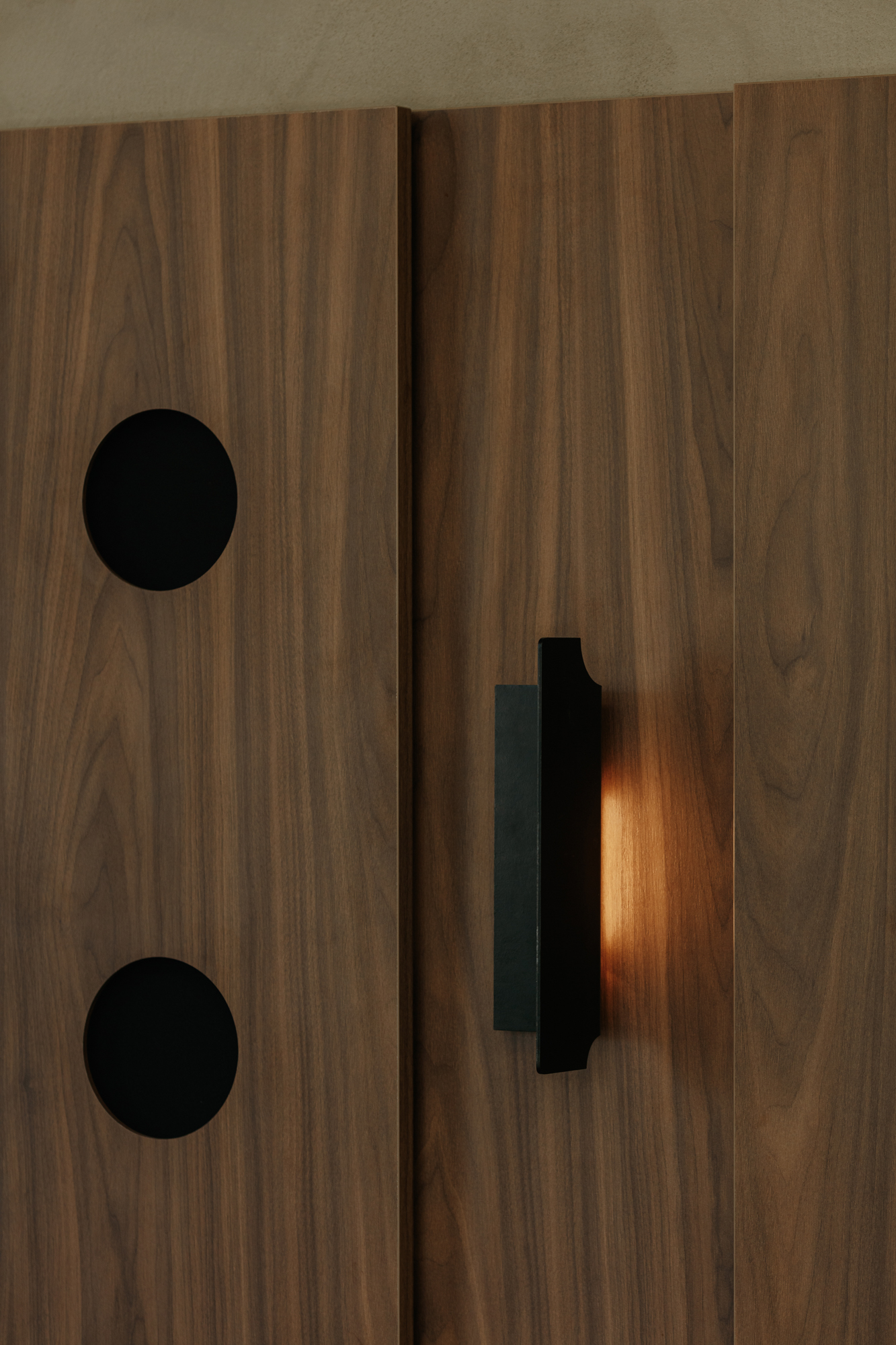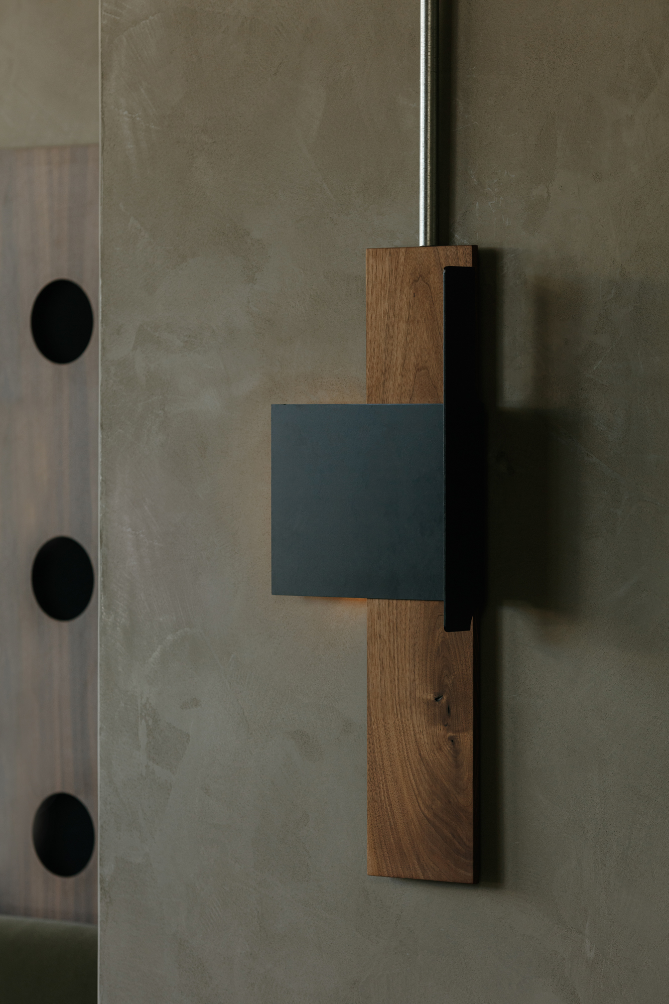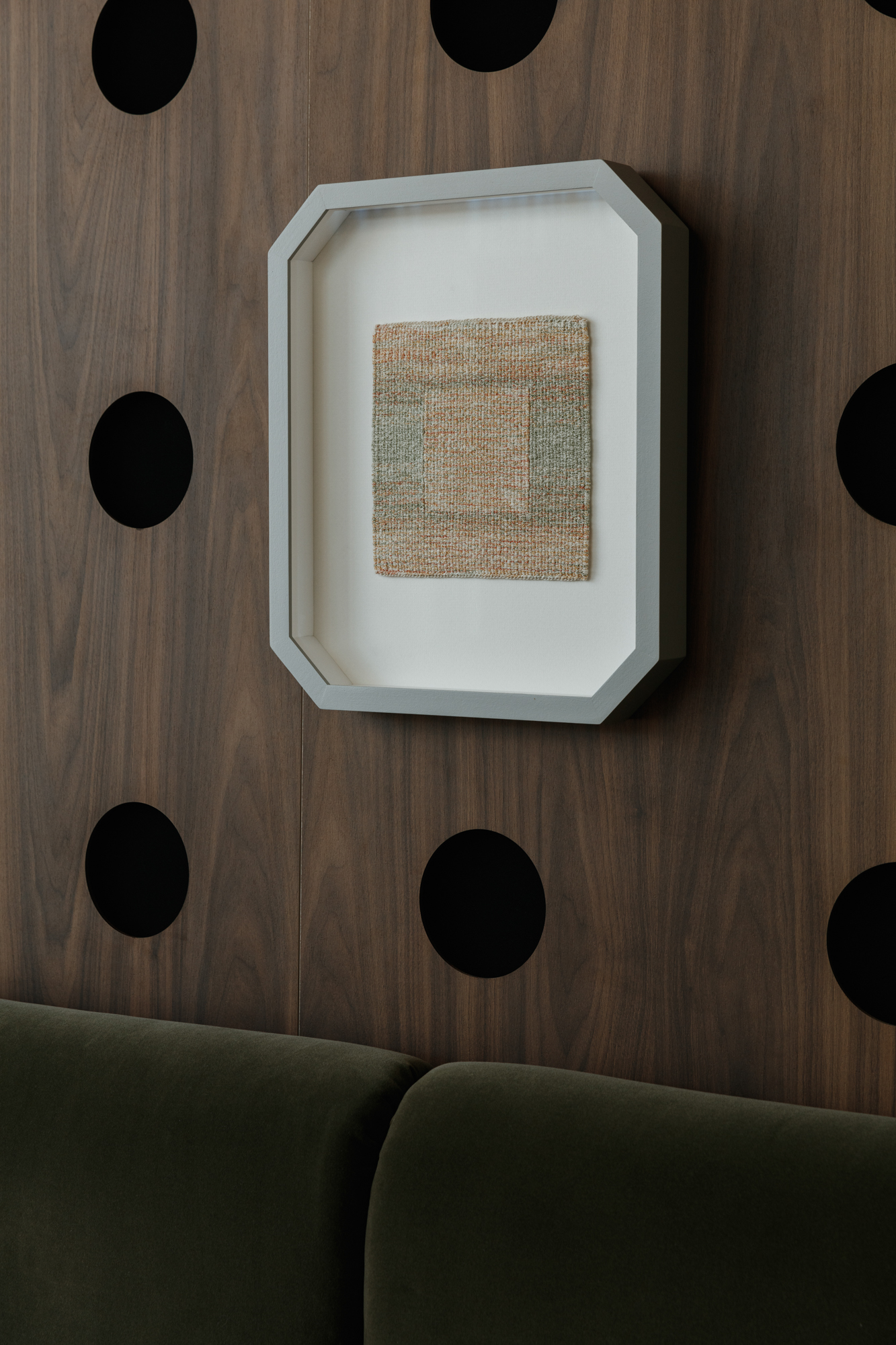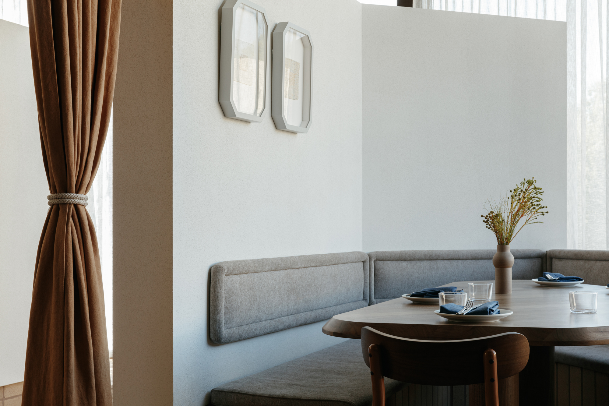 Serving as practical elements while also being integral to the palette, the reflective ceiling and perforated timber wall panels possess acoustic properties to cushion sound as the volume turns up for after dark parties. The smooth walnut panelling wears its grain with sophistication, providing a tonally delightful companion to the warm brick-tiled banquette seating, skirting and floor below.