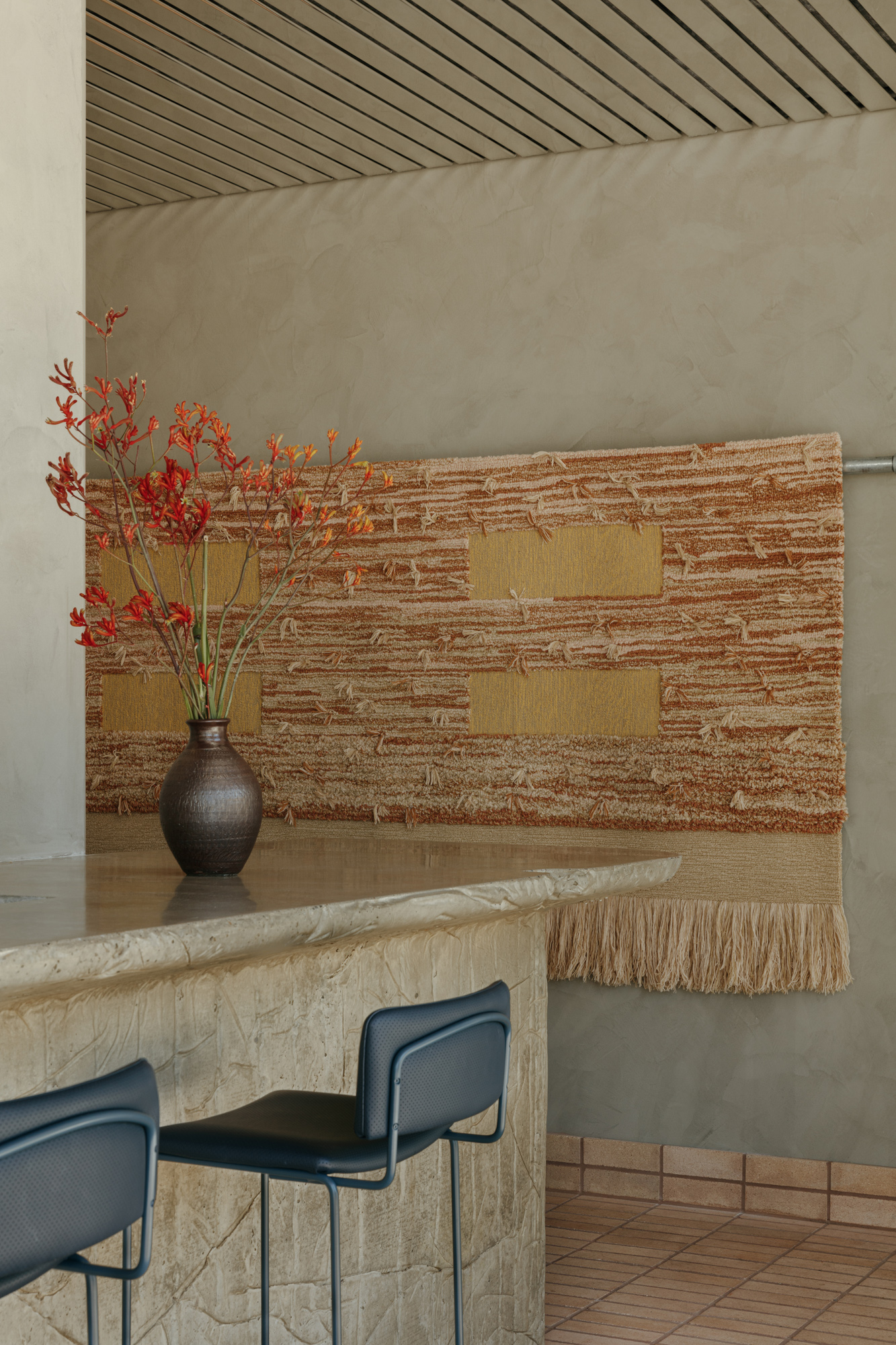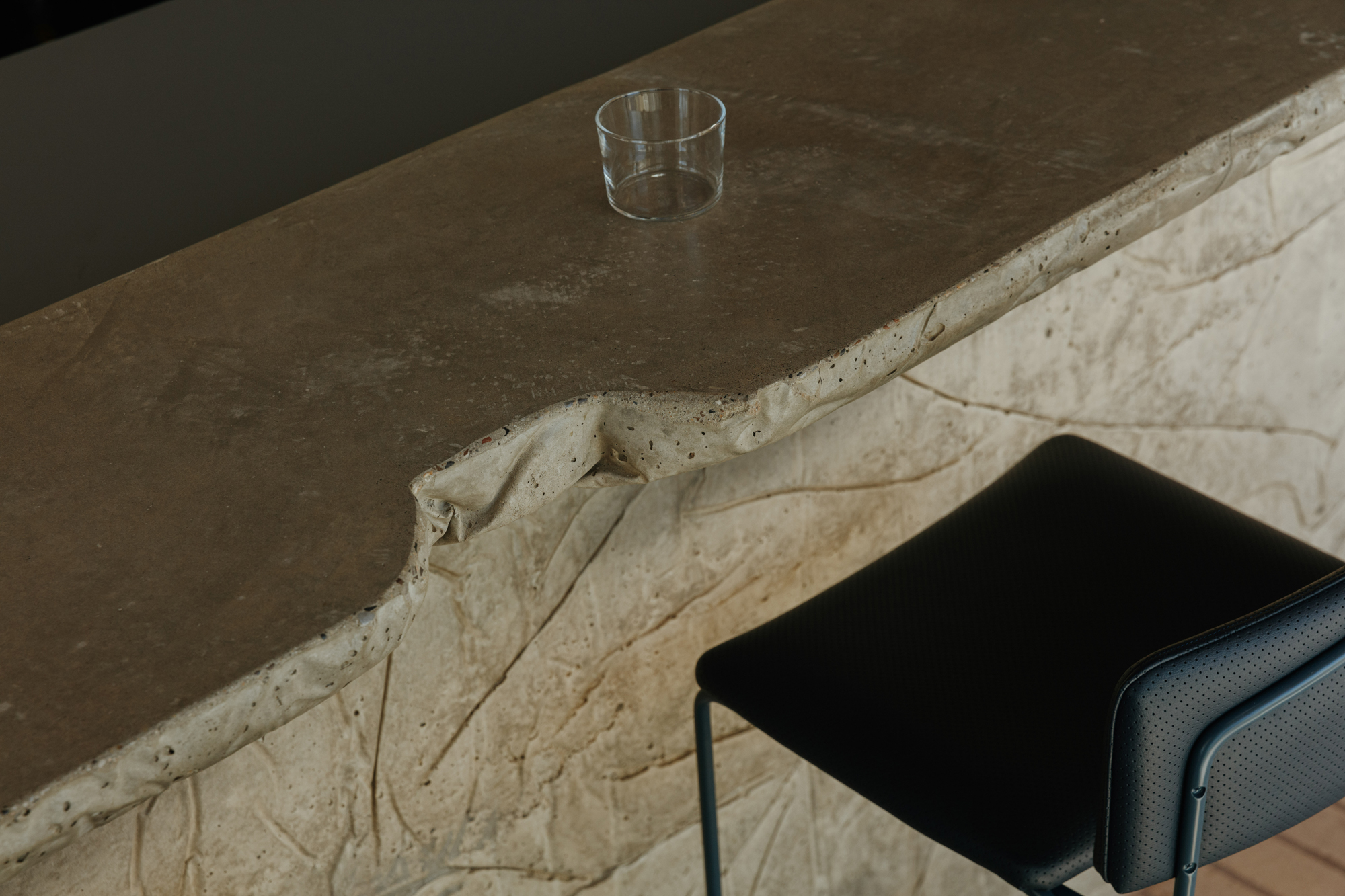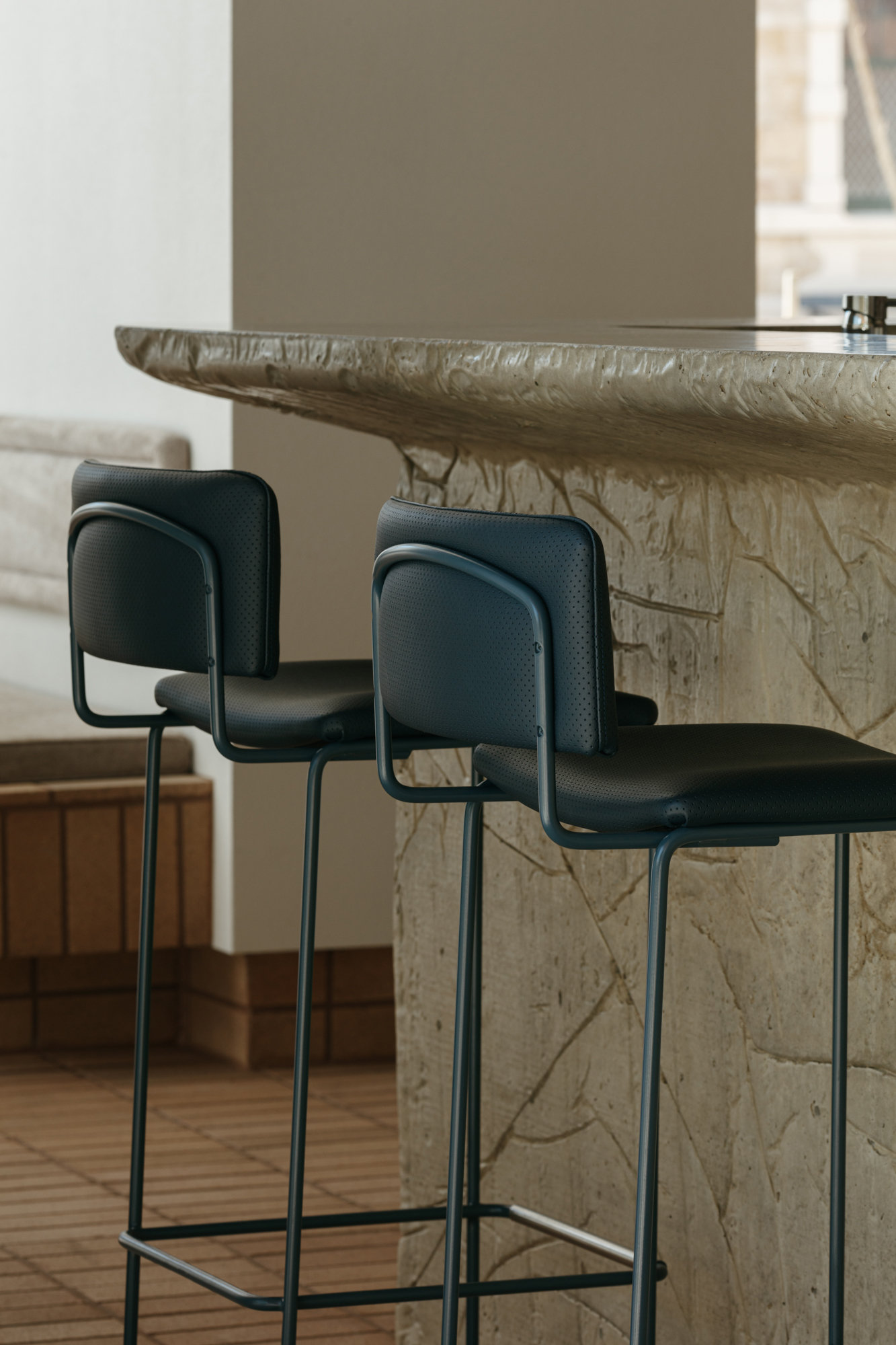 Embracing the glazed corner frontage of its ground floor home, the bar sits at the northern base of a bustling apartment block on Unley Road, drawing in residents and passers-by with glimpses of the intriguing scene within. Polished and glossy planes commune beautifully with a curiously crumpled concrete bar, and cosy booth seating is framed by windowpanes. Recounting the “creation from scratch as a blank canvas,” Ryan Genesin, Director of Genesin Studio, reveals that he and his team ultimately “drew inspiration from the site’s bones, which resonated a brutalist and futurist design aesthetic. This started to inform the design process and material selection, which was thrown into the mix of our de-sign brief to create something new for the area.”