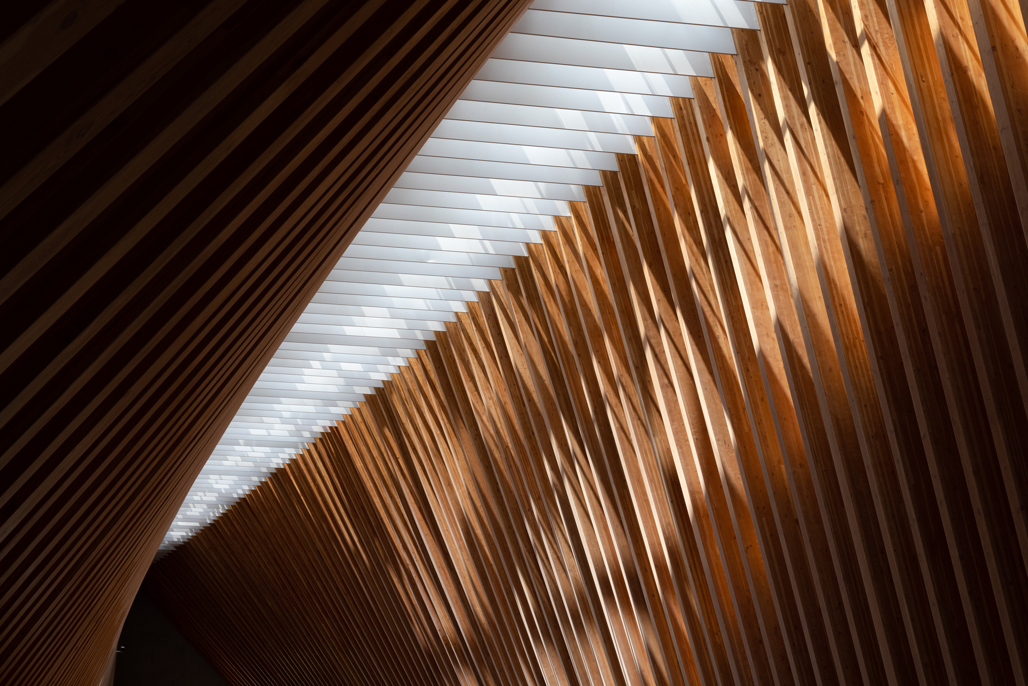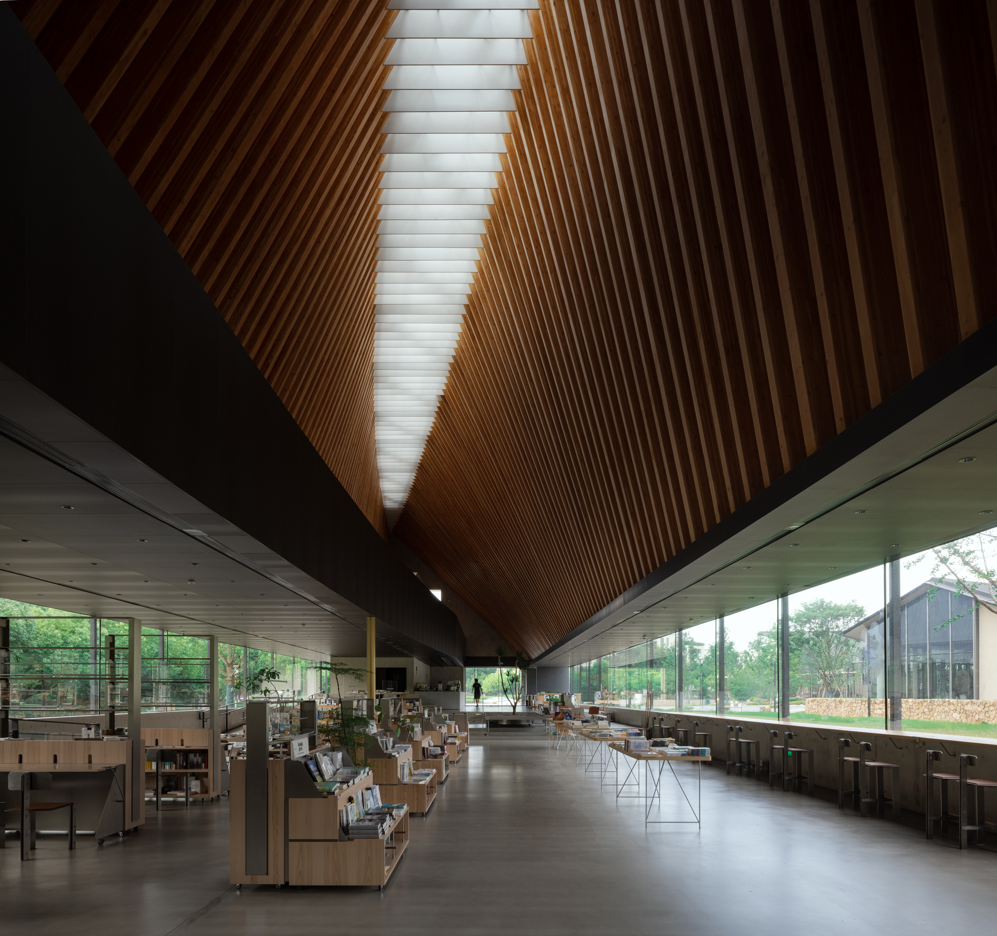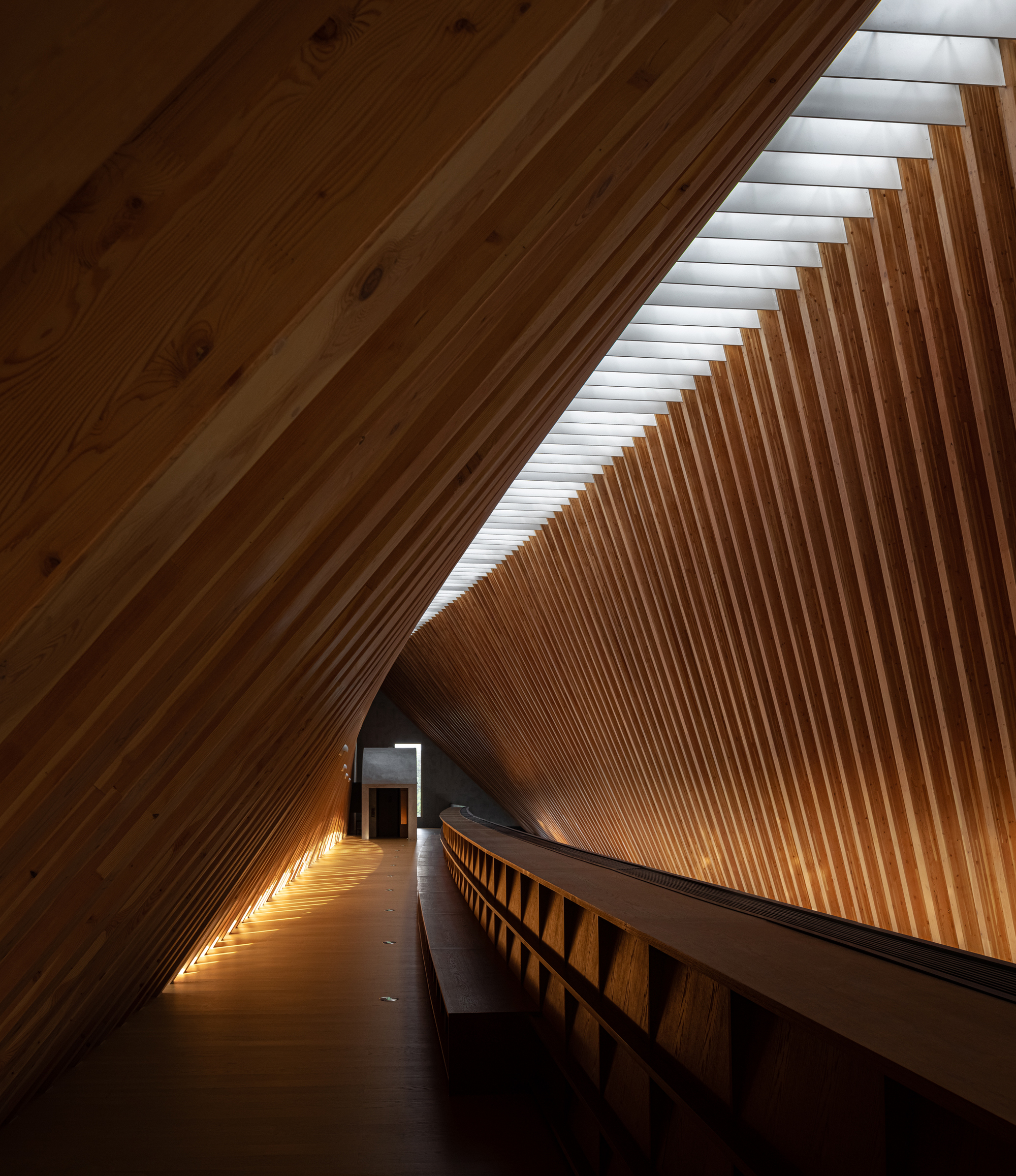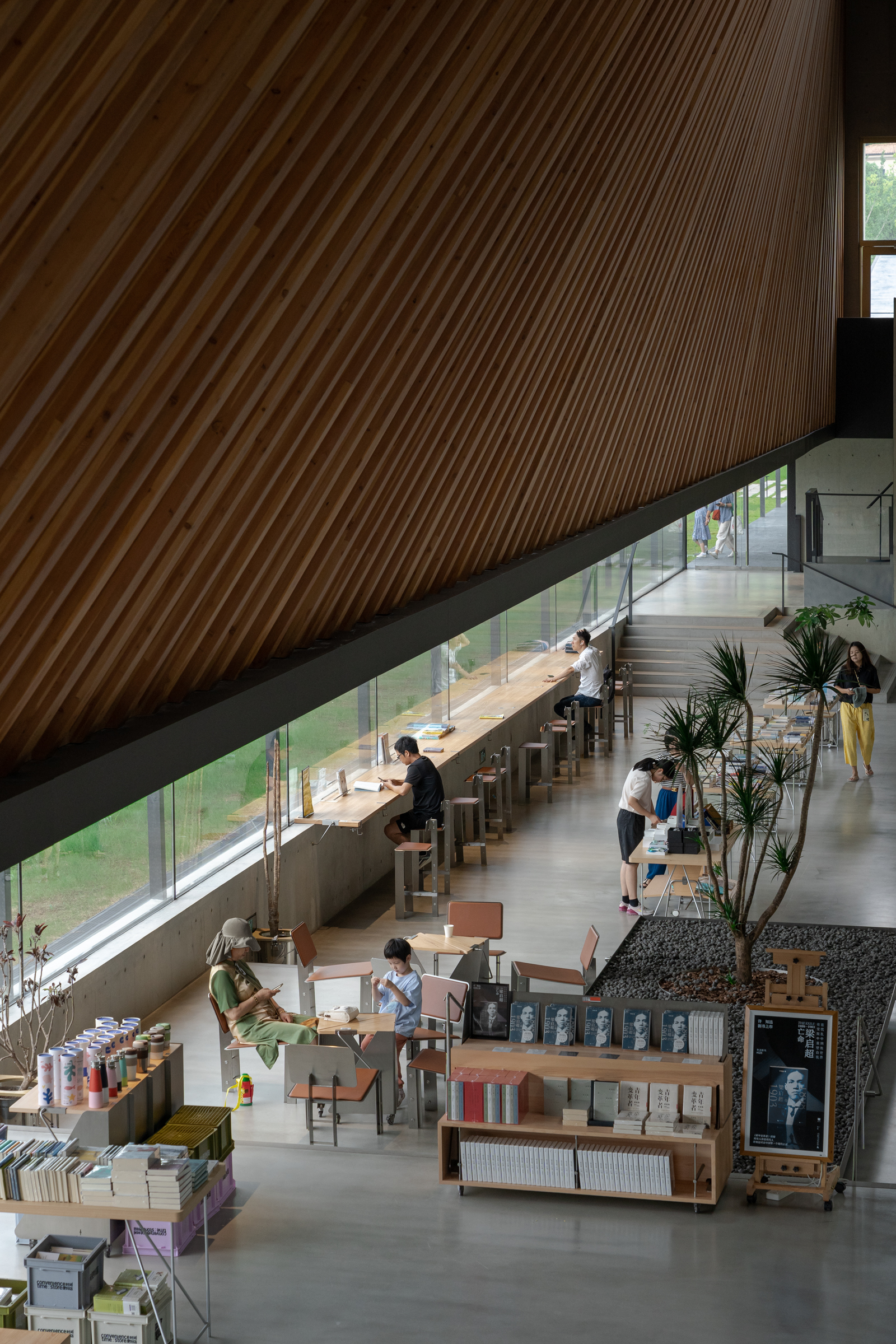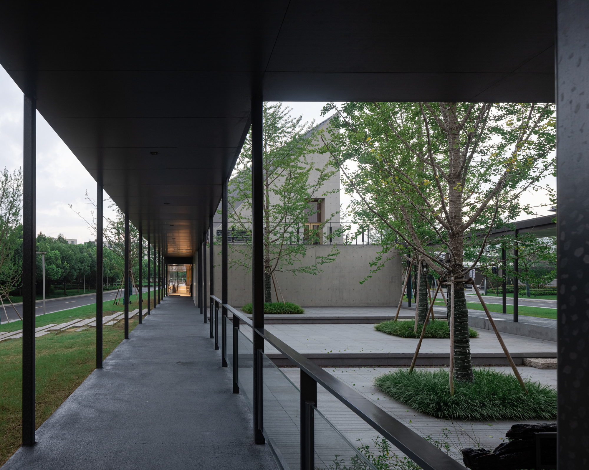 The shell roof of steel and wood at a span of 56 meters is vertically supported by the concrete shear walls at both ends, so that the two other sides of the building are completely open, providing a continuous and spacious view. The long thin steel column corridors on both sides of the eaves also provide the roof with an exterior wind resistance structural system and stress the horizontal openness towards both sides. The corridors stretch along the site and slowly elevate, forming an open-air courtyard space.