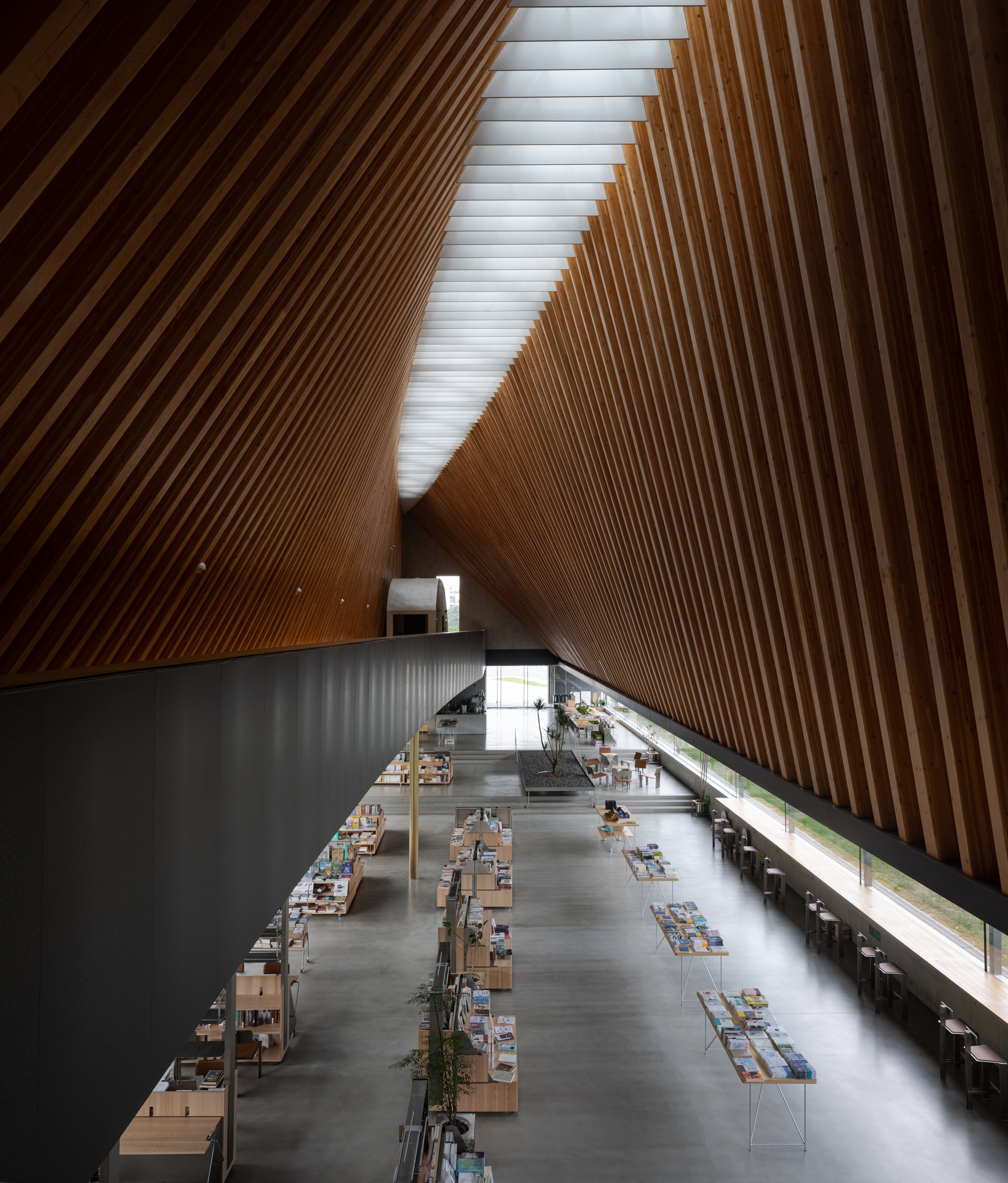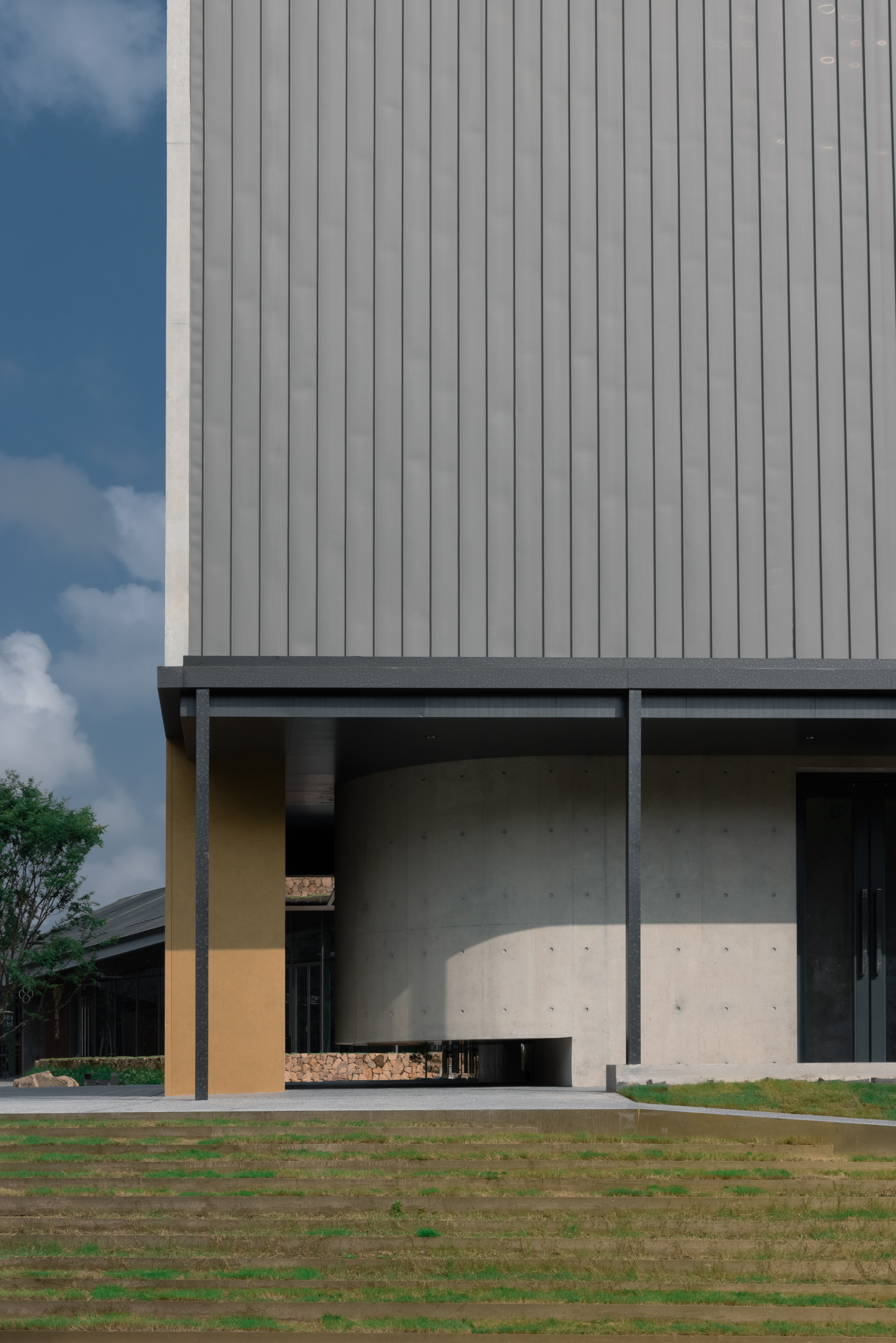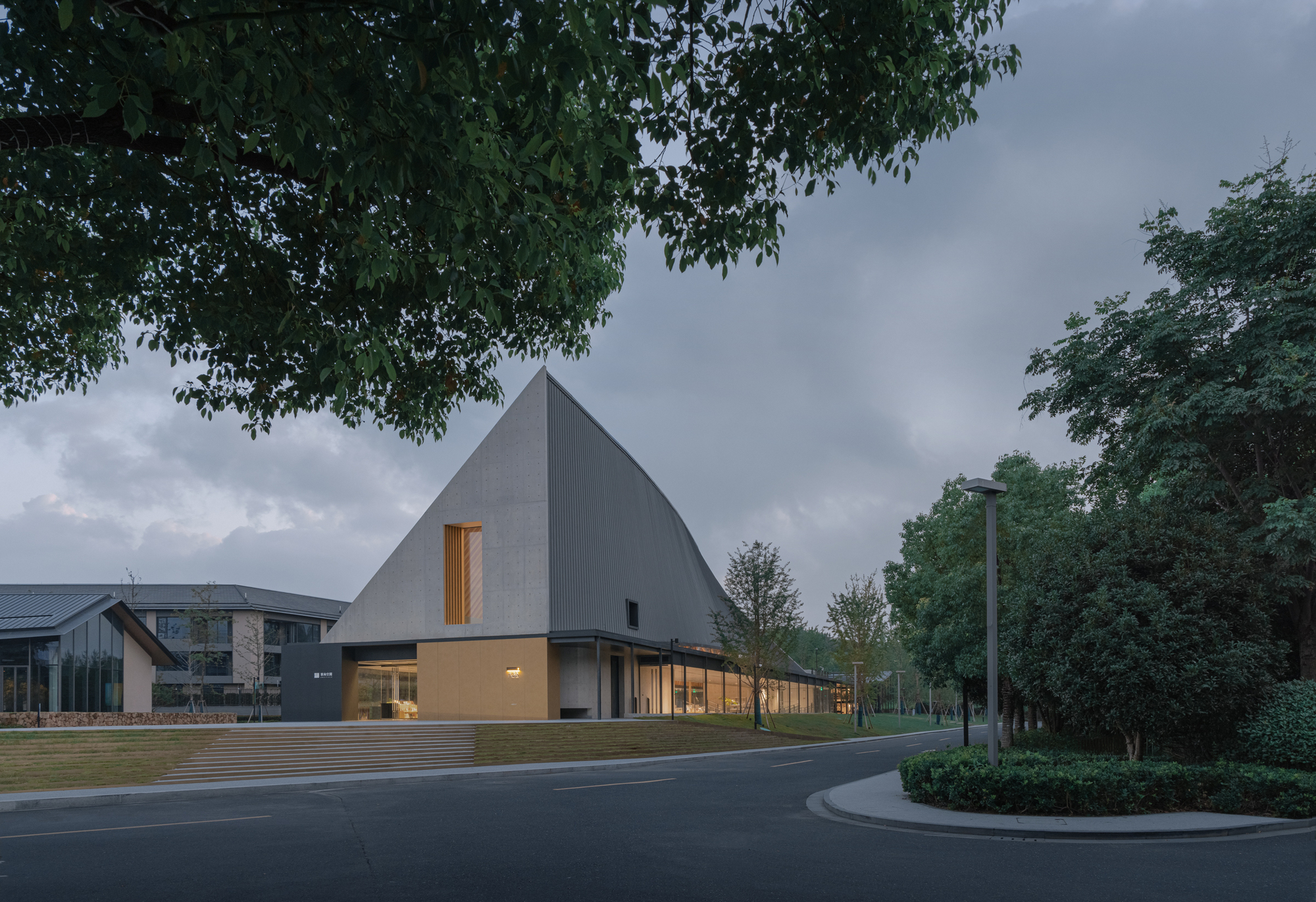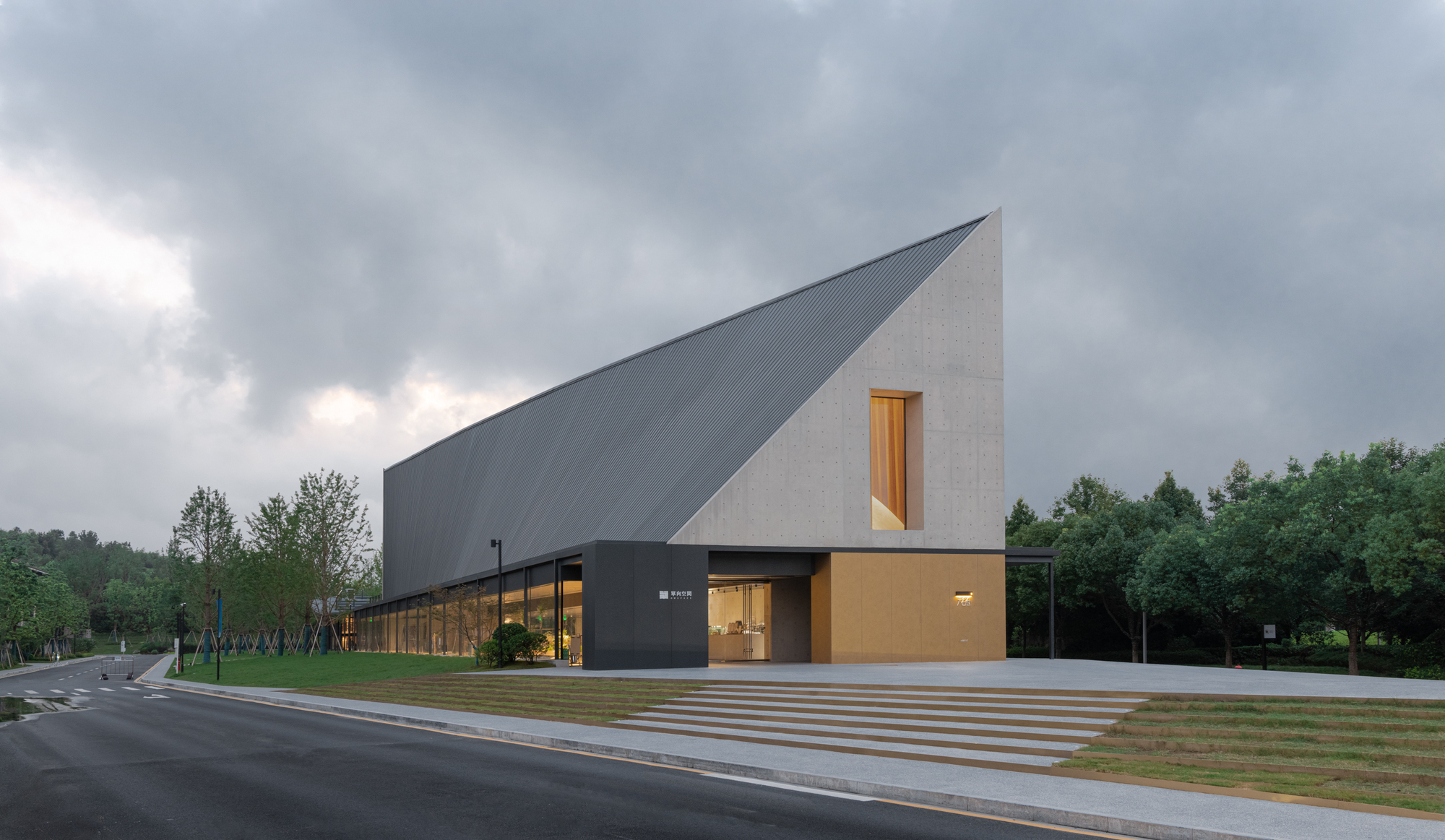 The conventional double-pitched roof is extended into a linear long roof due to functional needs. The ridge twists into a diagonal line based on the surrounding spatial conditions, and further opens up to introduce natural skylight. Thus the curved roof not only achieves the spirituality of space but becomes a bridge-type shell structure.