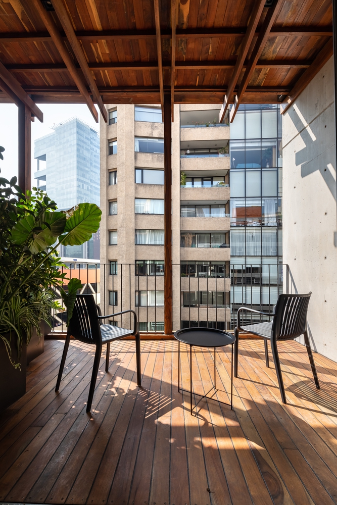 Located on Monte Élbruz Street in Polanco, Mexico City, this condo hotel spans 8 levels above street level and 3 below ground. The main structure of the building is made of concrete. However, what captures attention is its exterior wooden structure, which is not a common material for structural use in buildings in Mexico City.