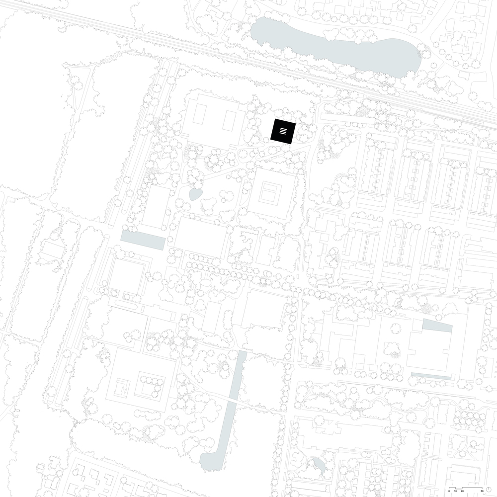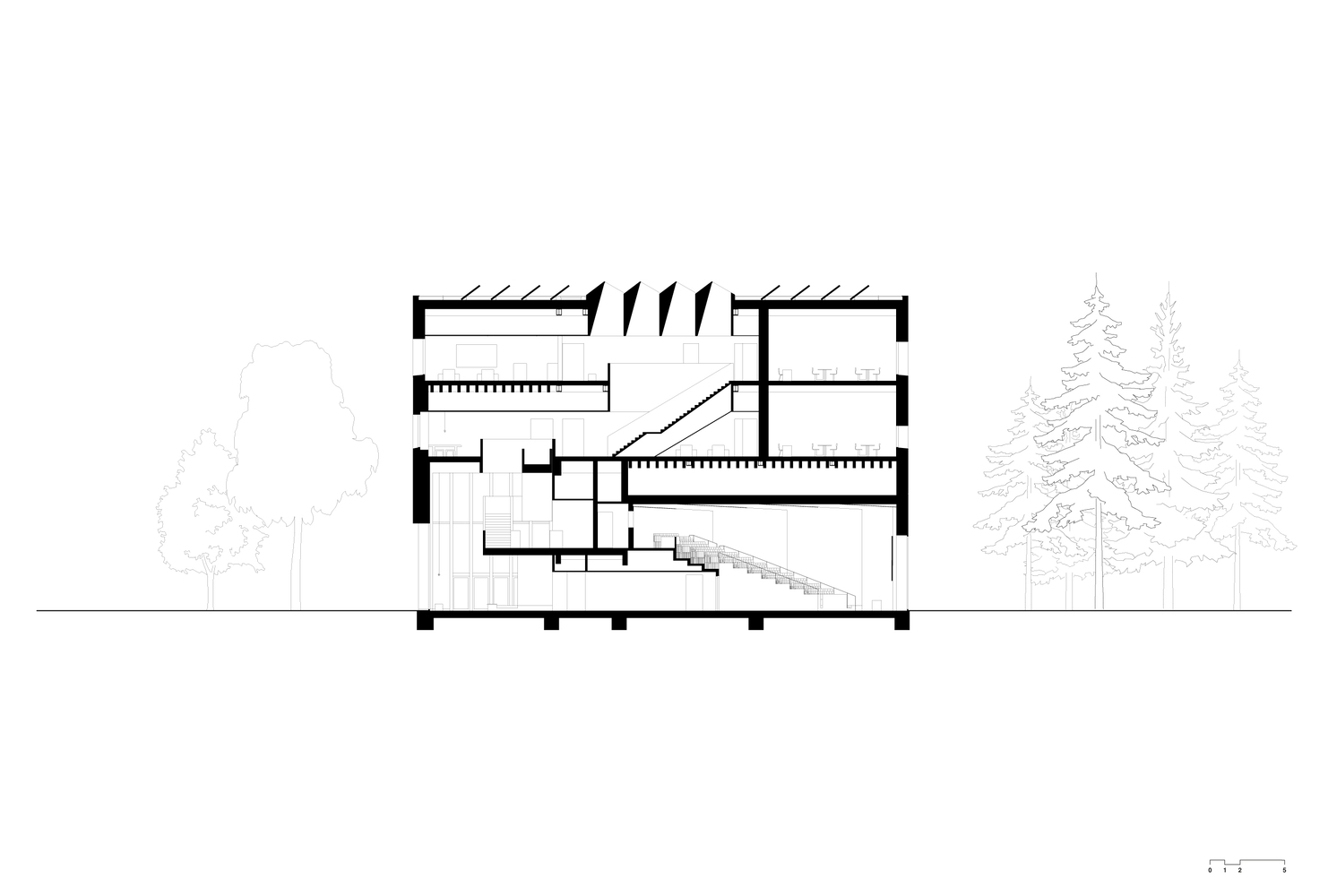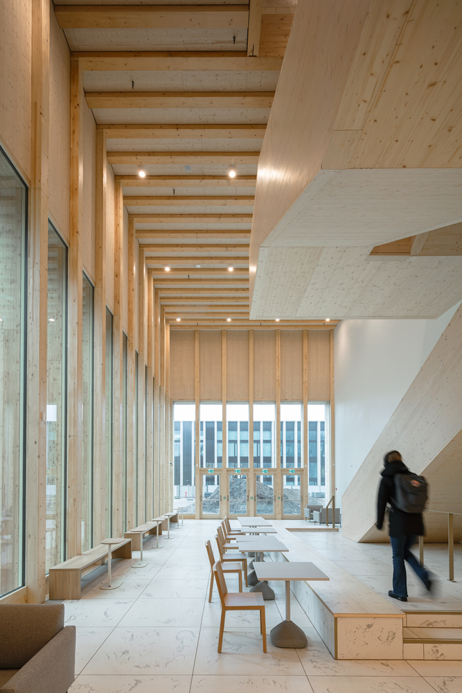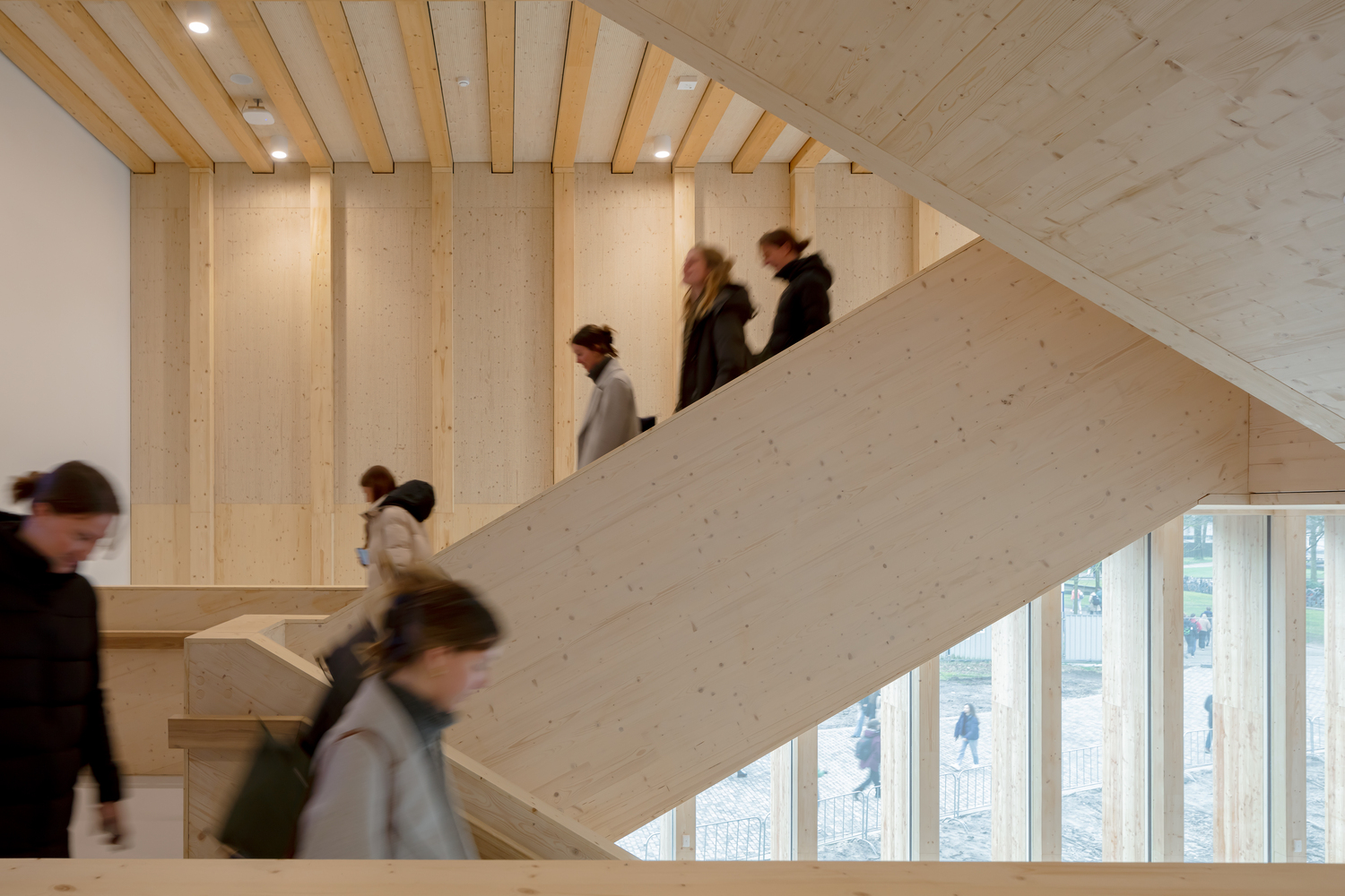 Marga Klompé Building, designed by Powerhouse Company, is the first college building in Europe to be entirely constructed from solid wood. The new, nearly energy neutral complex is situated on a plot of land measuring 33 by 33 meters, within the forested campus of Tilburg University. The building accommodates a foyer, 1 auditorium, 13 lecture halls, and self-study spaces for approximately 1,000 students. Its distinctive architecture pays homage to the monumental Cobbenhagen Building on the campus while also serving as a model for the highly sustainable ambitions of university campuses in Europe.