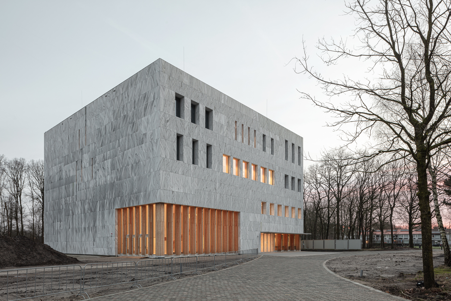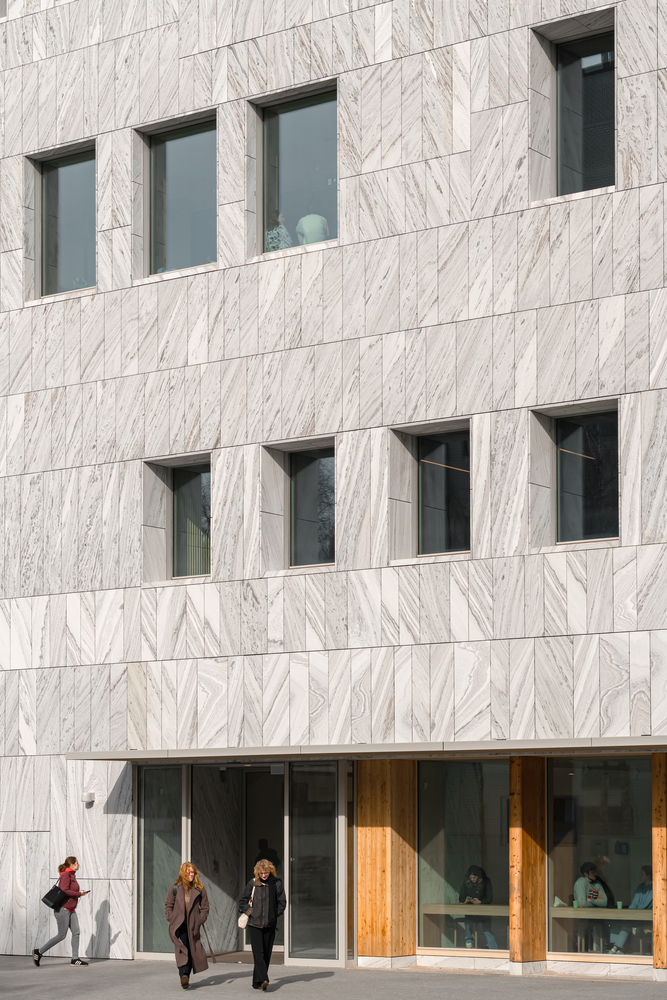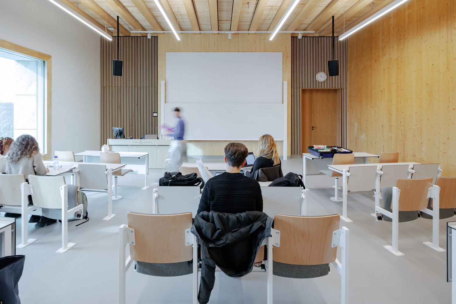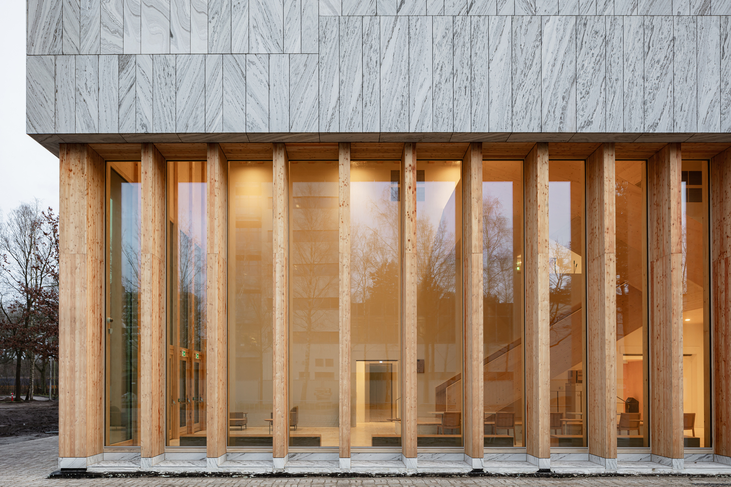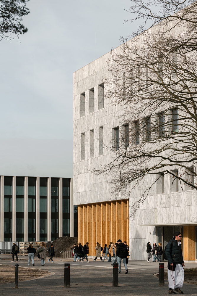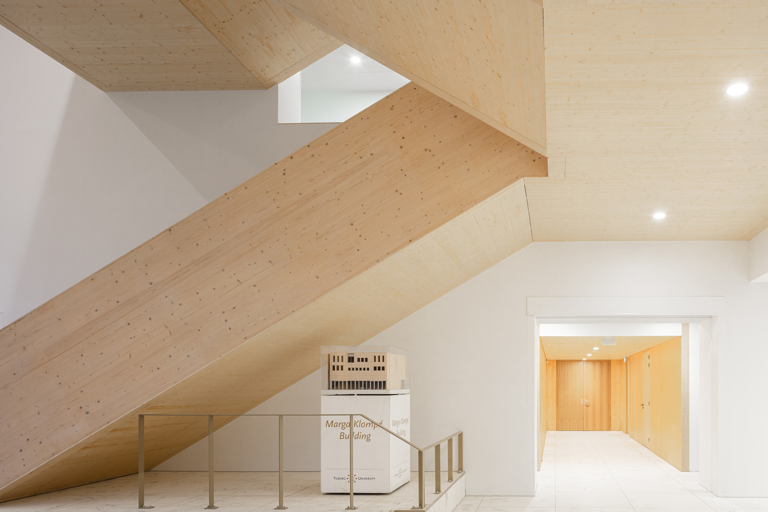 The design of the Marga Klompé Building seamlessly integrates with the modernist architecture of the Tilburg University campus. Its circular ambitions are reflected in the renewable nature of its wooden construction, walls, floors, stairs, frames, and finishes. A unique dry construction system has been implemented, utilizing wooden ribbed floors CTL floors reinforced with beams—that enable large free spans to meet the high acoustic requirements necessary for the program. The Portuguese natural stone facade, featuring deep reveals, directly references the iconic 1962 Cobbenhagen Building by Jos Bedaux. The natural stone, with its long lifespan and ability to be disassembled, confirms the circular ambitions. The stony volume harmonizes with the surrounding architecture, forming an intriguing contrast with the lush, wooded environment. The all-encompassing building is integrated into the campus and marks the entrance from the station.