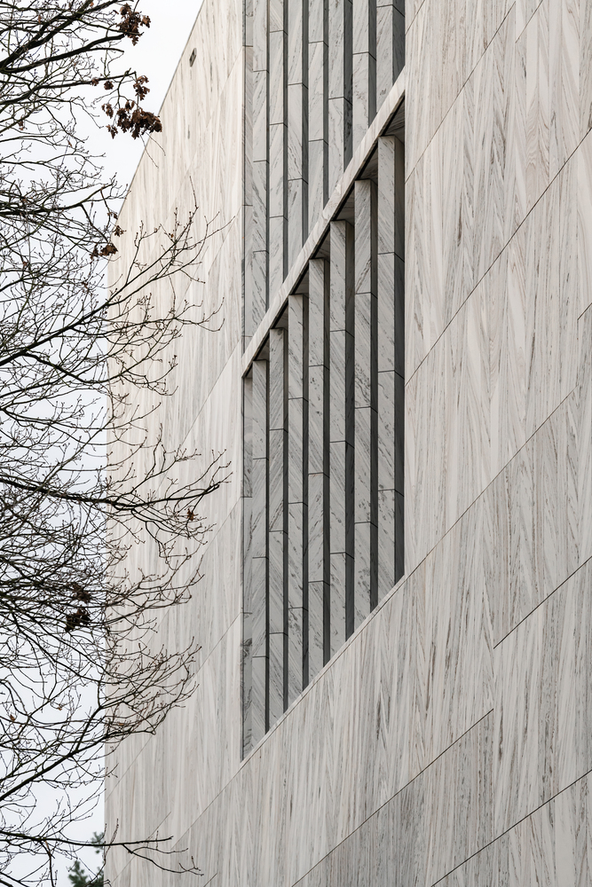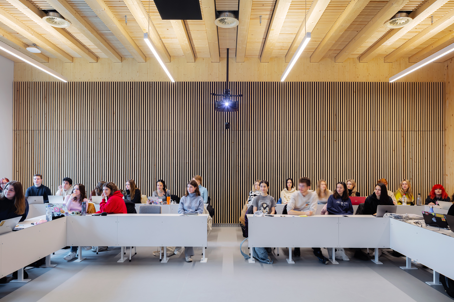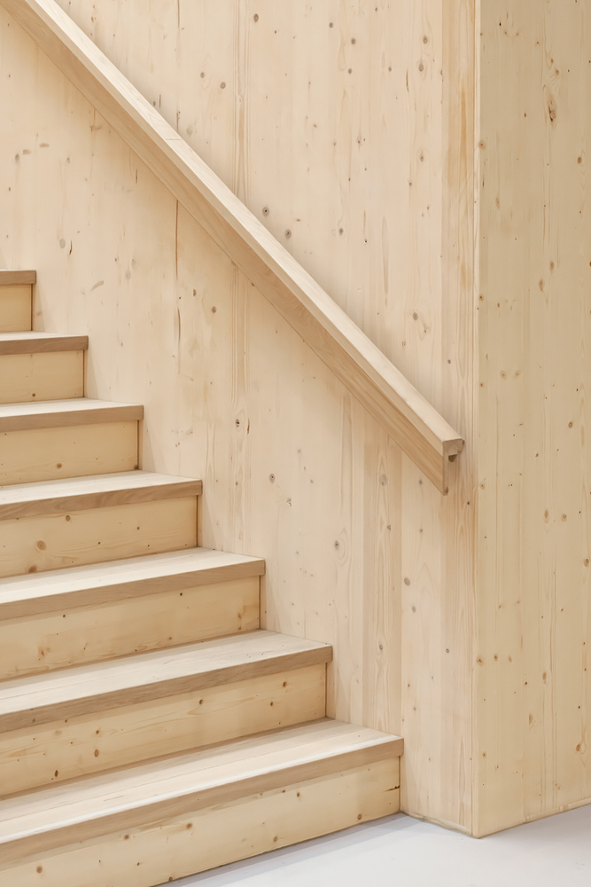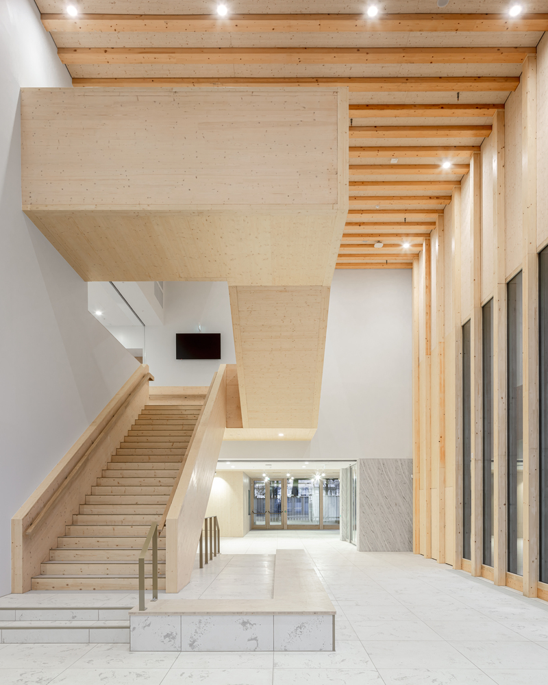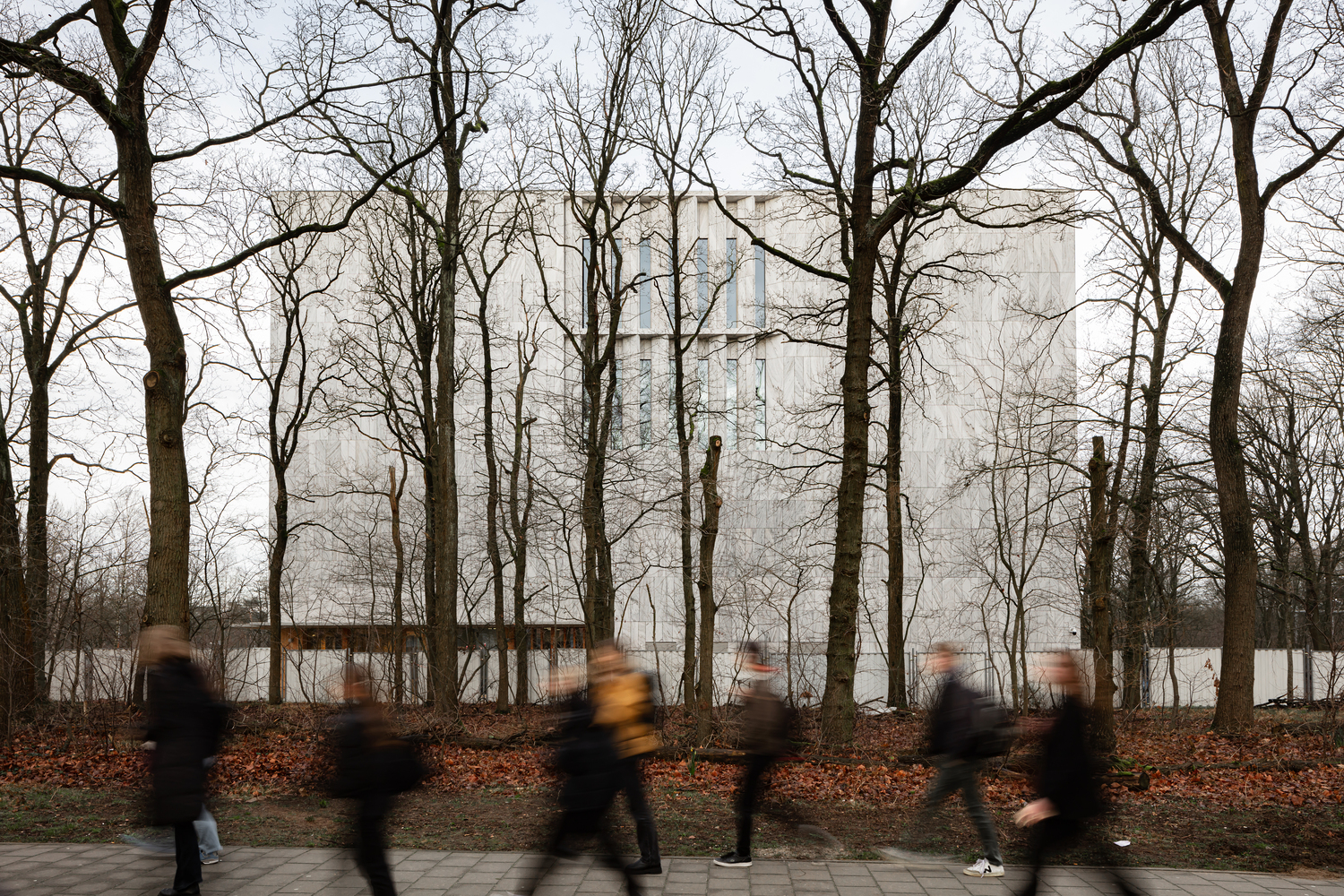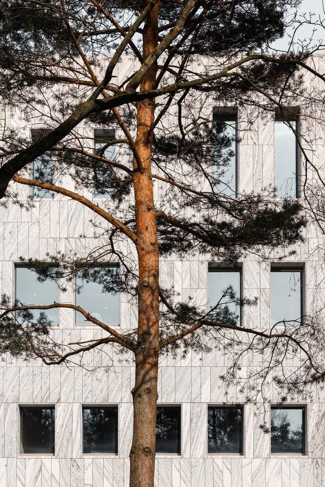 The design of the Marga Klompé Building seamlessly integrates with the modernist architecture of the Tilburg University campus. Its circular ambitions are reflected in the renewable nature of its wooden construction, walls, floors, stairs, frames, and finishes. A unique dry construction system has been implemented, utilizing wooden ribbed floors CTL floors reinforced with beams—that enable large free spans to meet the high acoustic requirements necessary for the program. The Portuguese natural stone facade, featuring deep reveals, directly references the iconic 1962 Cobbenhagen Building by Jos Bedaux. The natural stone, with its long lifespan and ability to be disassembled, confirms the circular ambitions. The stony volume harmonizes with the surrounding architecture, forming an intriguing contrast with the lush, wooded environment. The all-encompassing building is integrated into the campus and marks the entrance from the station.