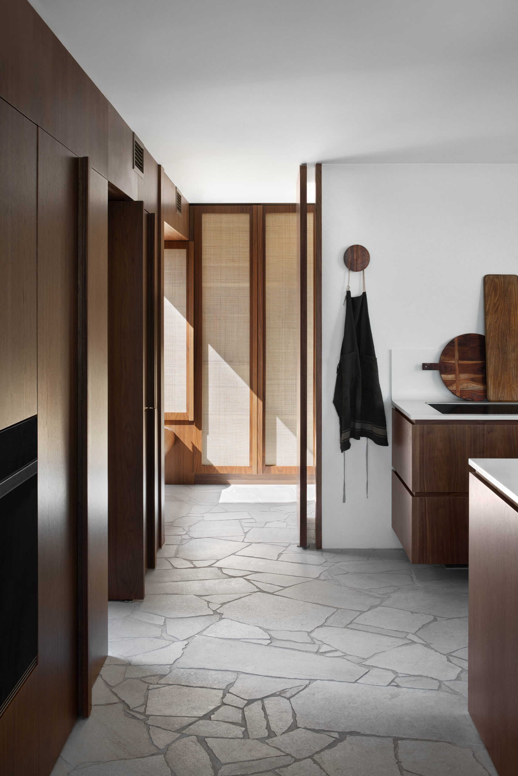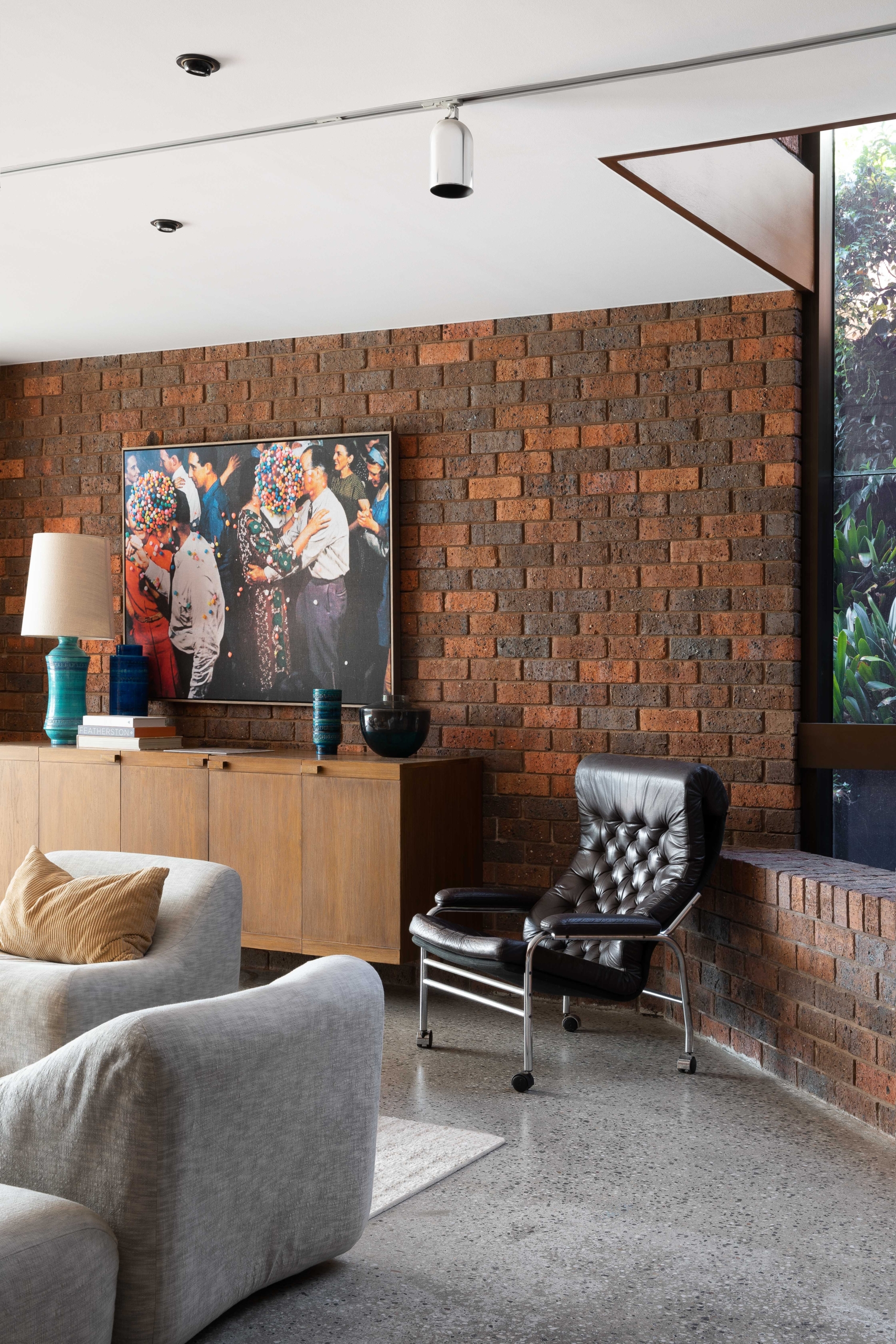 The architects took a highly considered approach to layering between authentic elements, modern furnishings and sleek craftsmanship. Features such as textured brickwork, cedar-clad vaulted ceilings, German blown glass chandeliers and wall-hung ashtrays were juxtaposed with contemporary materials like natural rattan, rolled-edge Corian benchtops in the kitchen, rich warm walnut finishes and mixed metal accents.