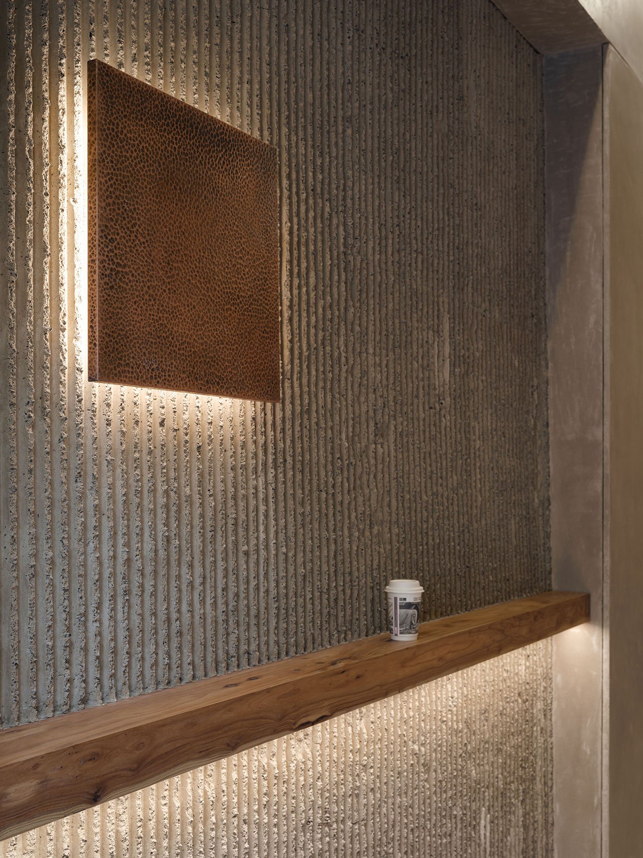 Upon entering, visitors are greeted by a monolithic counter extending from the front to the back, dividing the space into customer and staff areas. Slighting angled, it also separates the ordering and serving zones. Cast-in situ from a cement and coffee bean aggregate, its uniquely spotted finish is a nod to the brand’s commitment to single-origin coffee. The counter’s sculptural sensibility extends to the entire space which is predominantly enveloped in polished concrete surfaces. Hand-cast, striated concrete wall sections add contrast while elm wood wall elements that function as coffee cup stands and backrests add warmth.