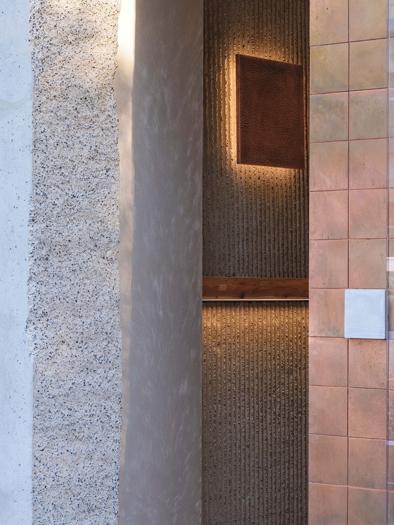 Having to contend with a narrow street façade, the architectural team came up with an eye catching gesture to draw people in. A sculptural concrete portal frames a large glass opening dominated by a full-height copper sliding door. Comprising a patchwork of 175 oxidized copper squares, manually assembled to create a unique grid pattern inspired by the brand’s name, the door creates a visually striking contrast in relation to the rugged, abstractly-shape concrete portal.