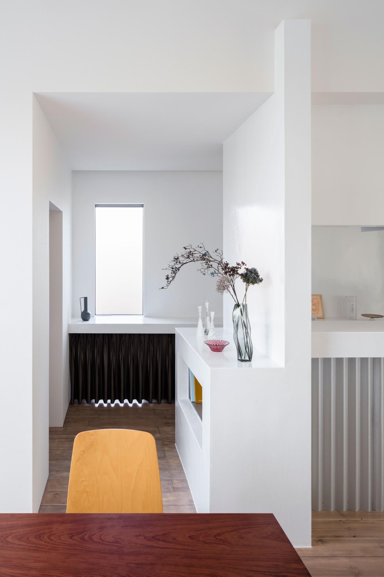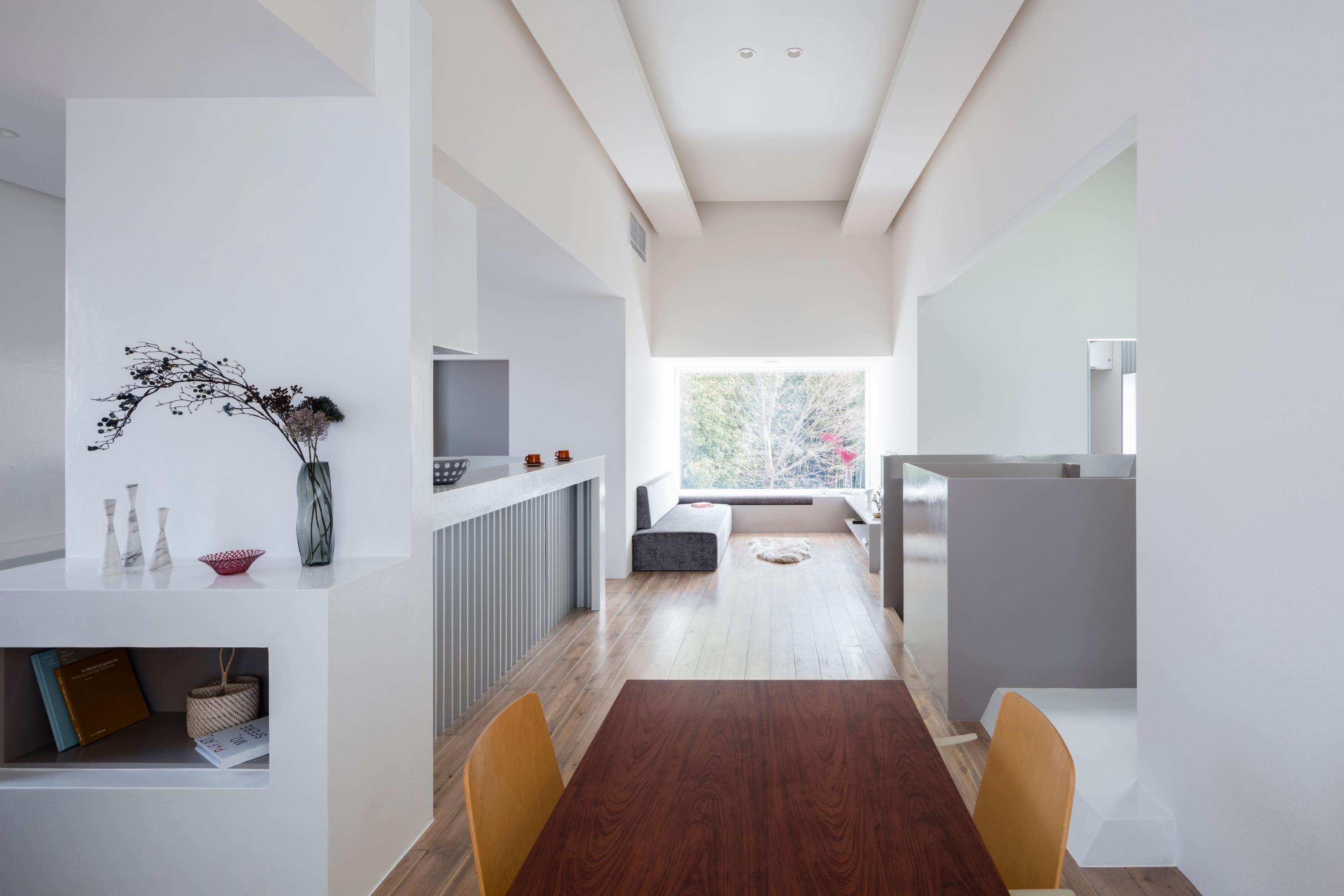 The living dining room with bright light has a coved ceiling which provides gradation of gentle light. The manipulated lights are introduced in the architectural space to characterize each room.