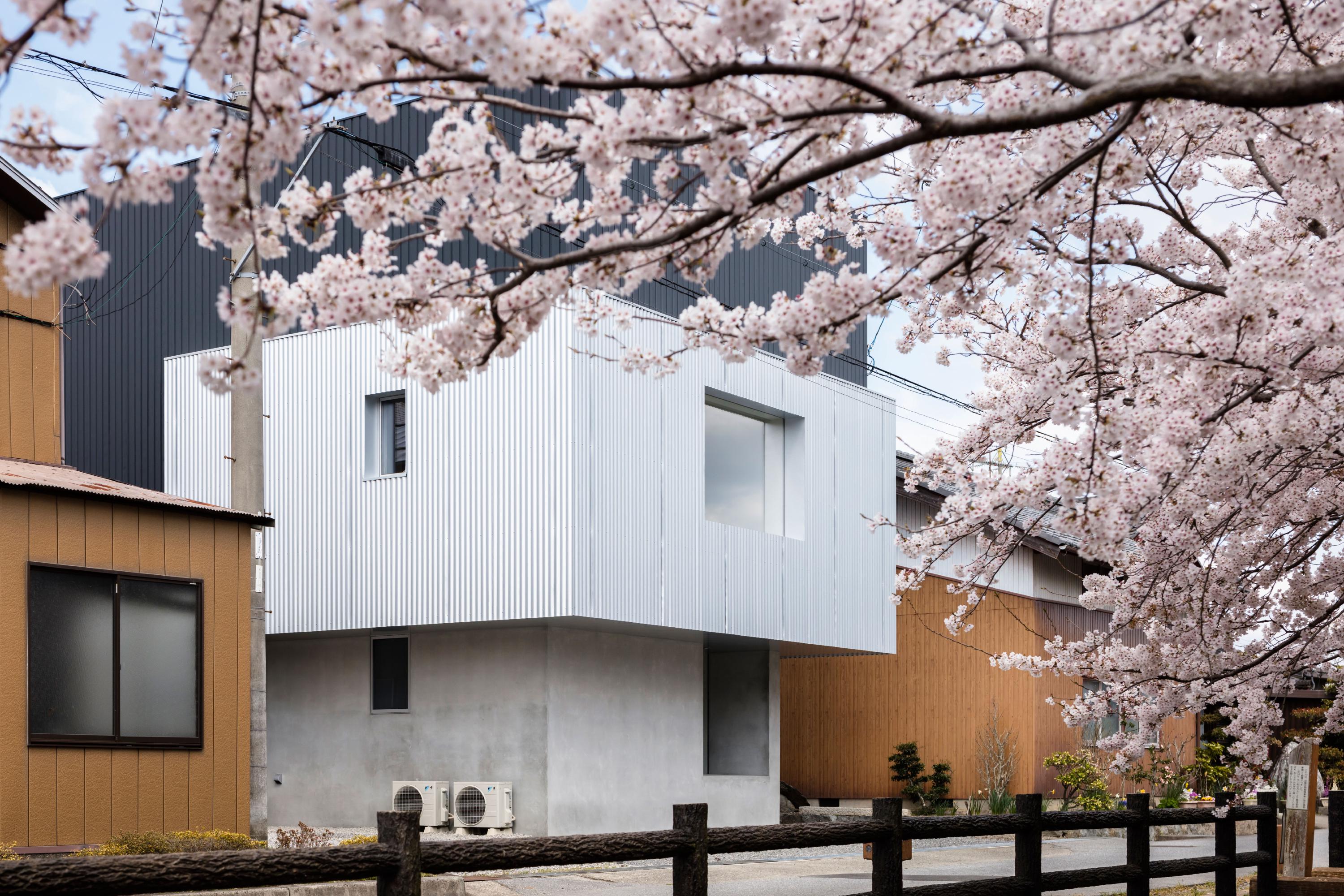 The exterior is composed of volumes based on carefully examined proportion, window layout, and materials. The overhanging cantilever which gives some impression to the exterior is effectively used as an eaves for an approach to the entrance or a parking lot.