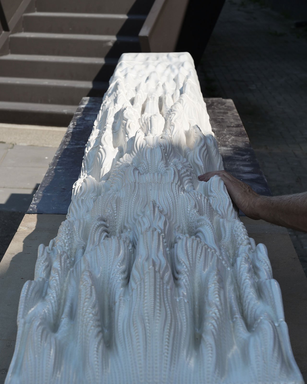 Both sections feature visually expressive areas with pronounced three dimensional forms that gradually transition to flush alignment towards the ground and the second storey. The organic, wave-like quality of these areas changes as passers-by approach the design from different angles, further enhancing the project’s sculptural sensibility and underlining its organic connection with the city.