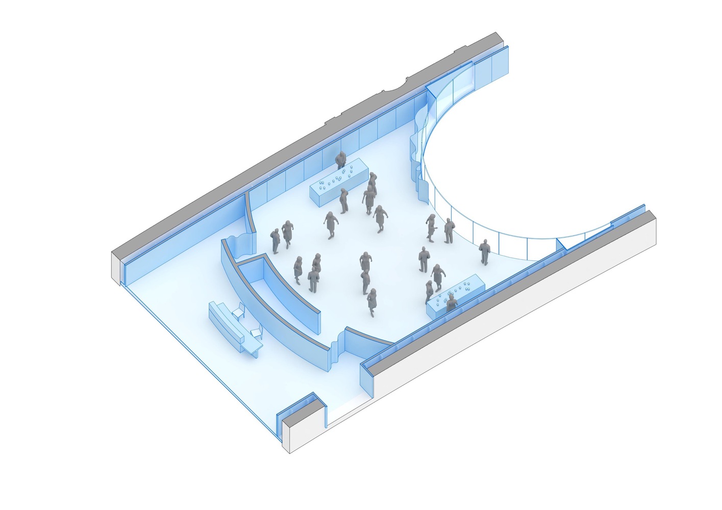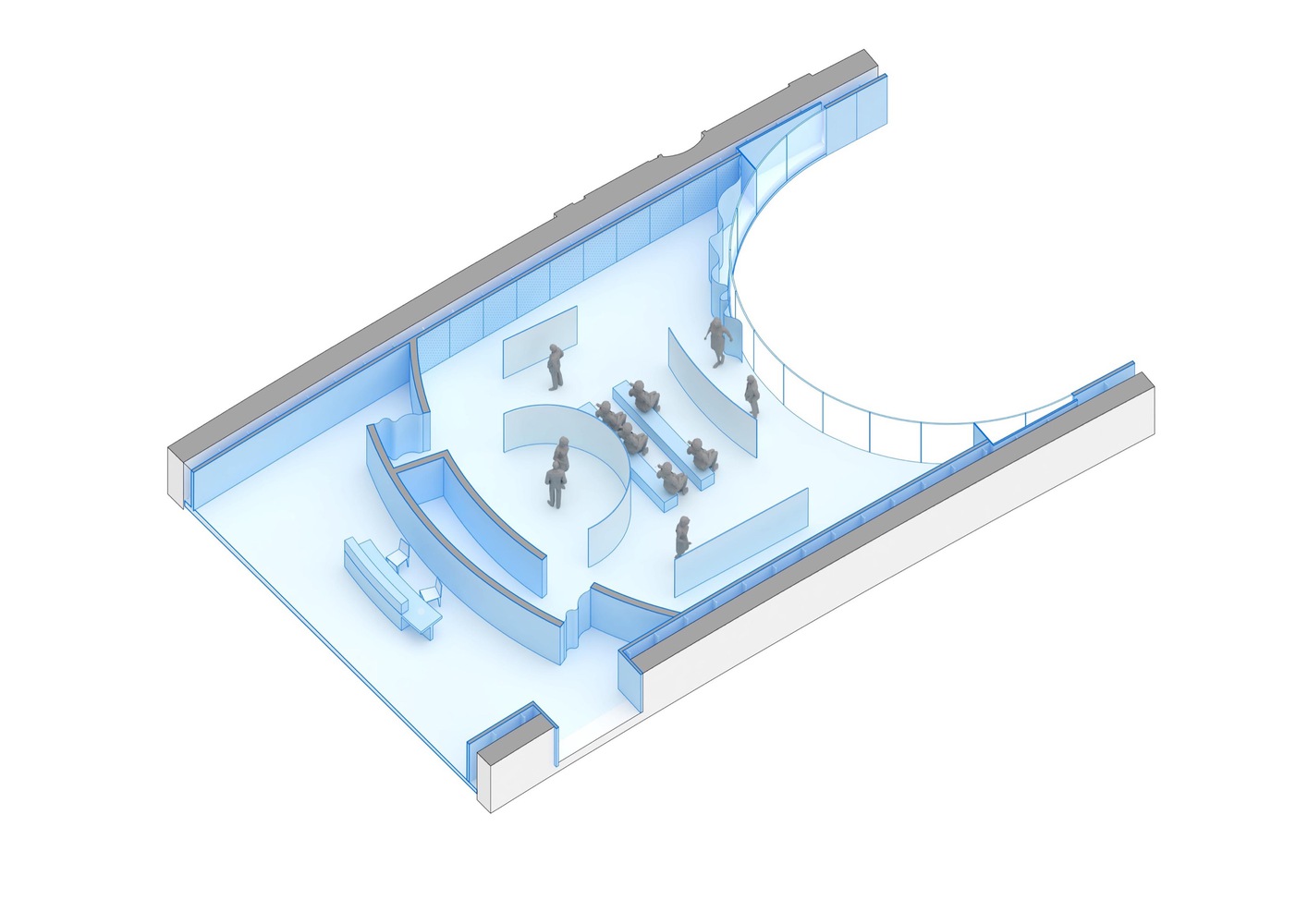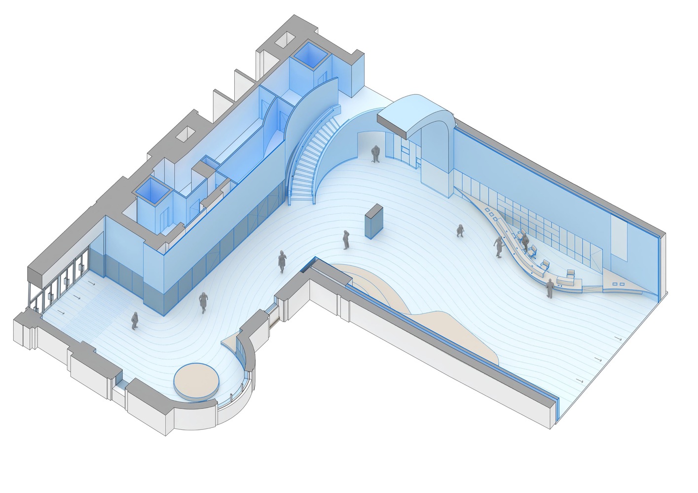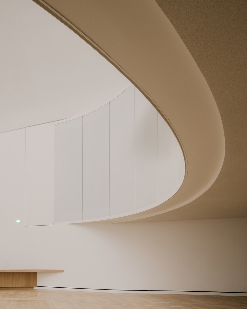 The design of the new museum is characterized by curved and circular forms, in keeping with the existing geometry of the building and subtly referencing the natural movement of water. This dynamic architectural movement facilitates circulation and connectivity between spaces and encourages more fluid interaction.