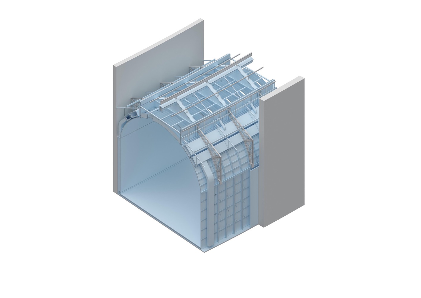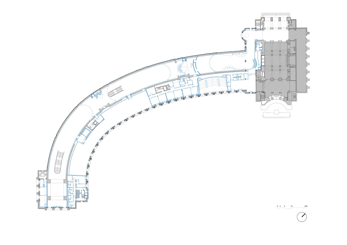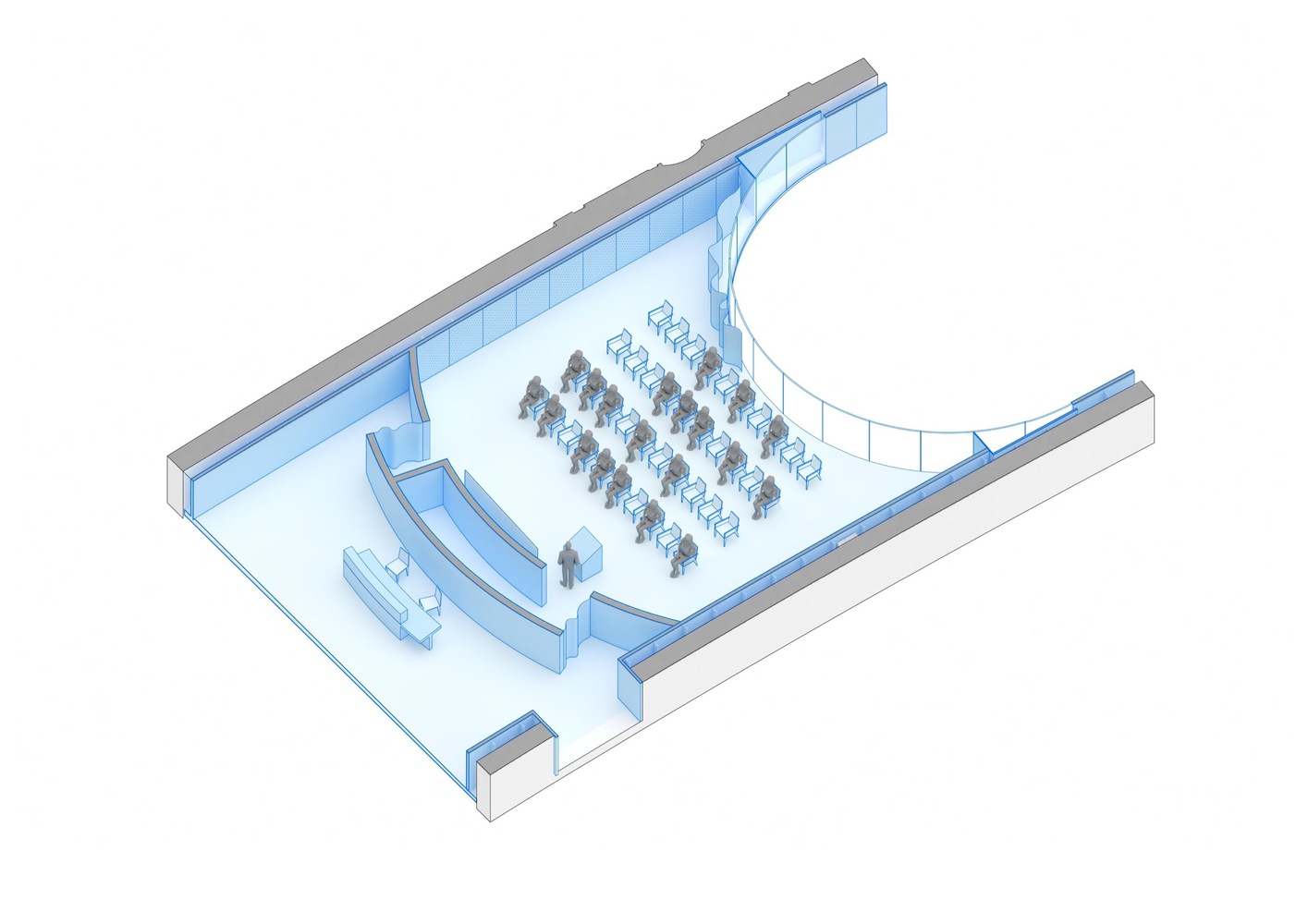 The design of the new museum is characterized by curved and circular forms, in keeping with the existing geometry of the building and subtly referencing the natural movement of water. This dynamic architectural movement facilitates circulation and connectivity between spaces and encourages more fluid interaction.