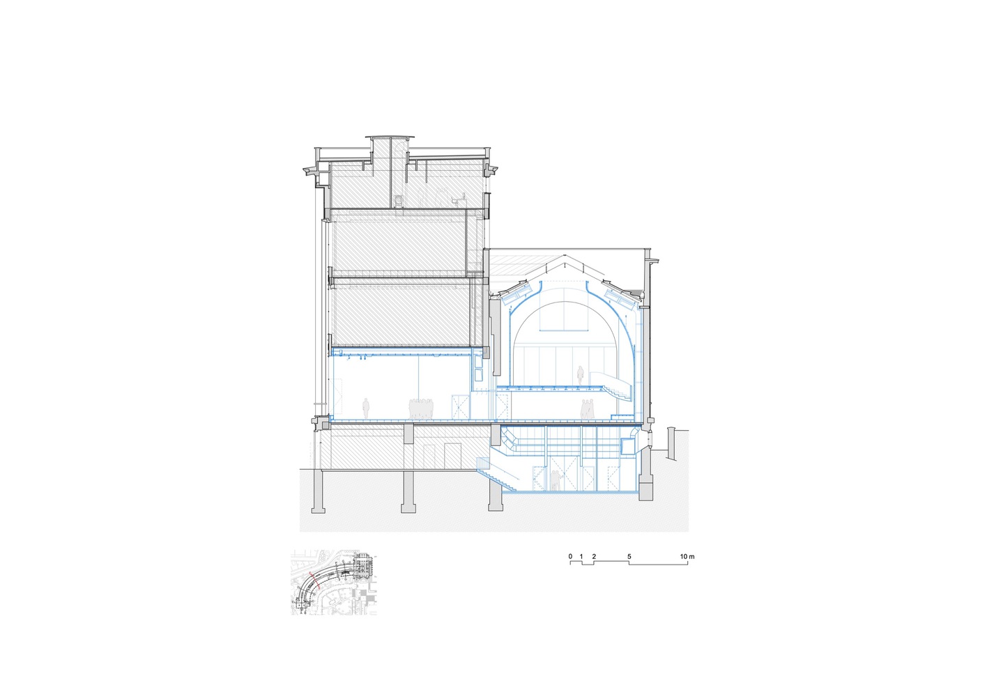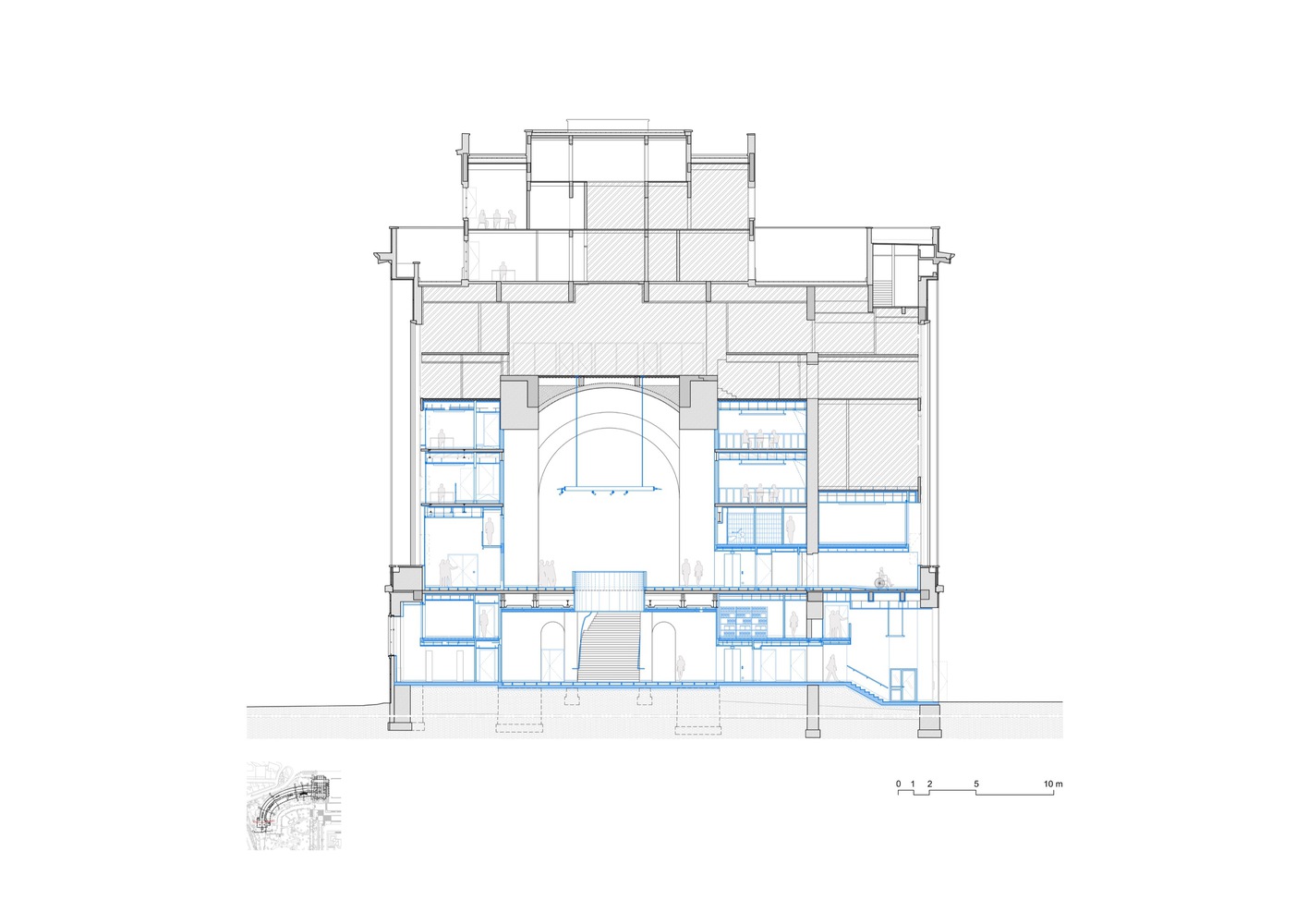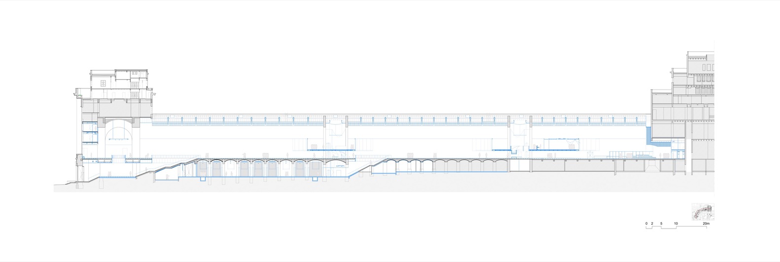 A streamlined visitor journey is created by reopening a historic staircase that dates from the original 1878 project and integrating it into both the temporary and permanent exhibit itineraries. These same spaces are punctually opened to the world outside, in keeping with the twofold aim of reconstituting the volumes of the 1937 design and of anchoring the museum in the surrounding environment.