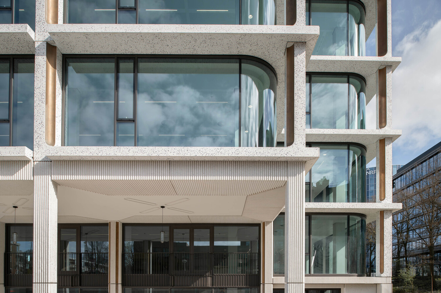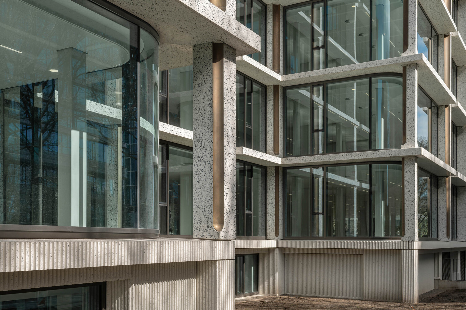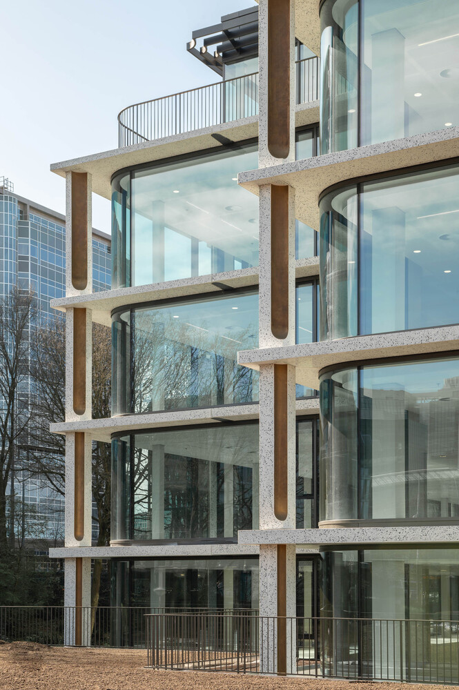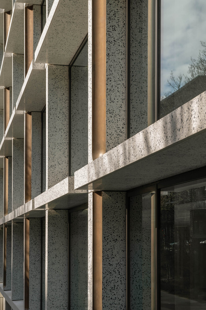 The existing concrete facade, with its pronounced brutalist character, is replaced with a facade that is the polar opposite in many respects. An open grid makes the building inviting instead of closed. Large windows with curved glass make the building transparent instead of dark. Bronze ornaments make the building refined instead of rough. Polished concrete with additional natural stone makes the building lively instead of dead. However, we use all of these elements to ensure that the solid character echoes its original character. Elegant brutalism.