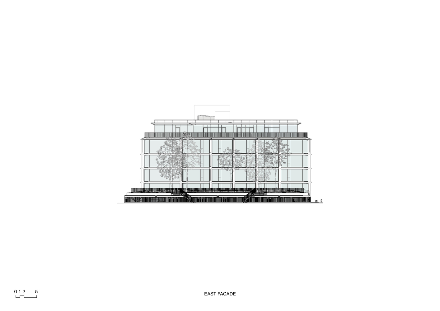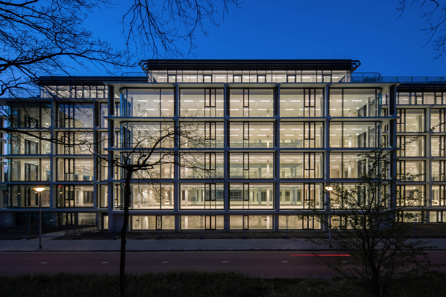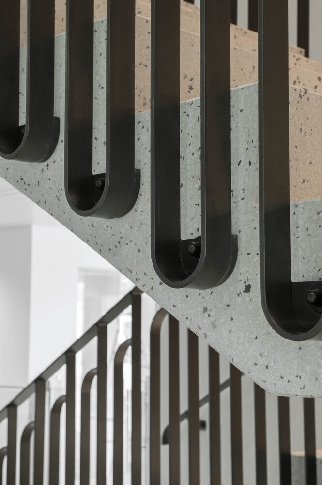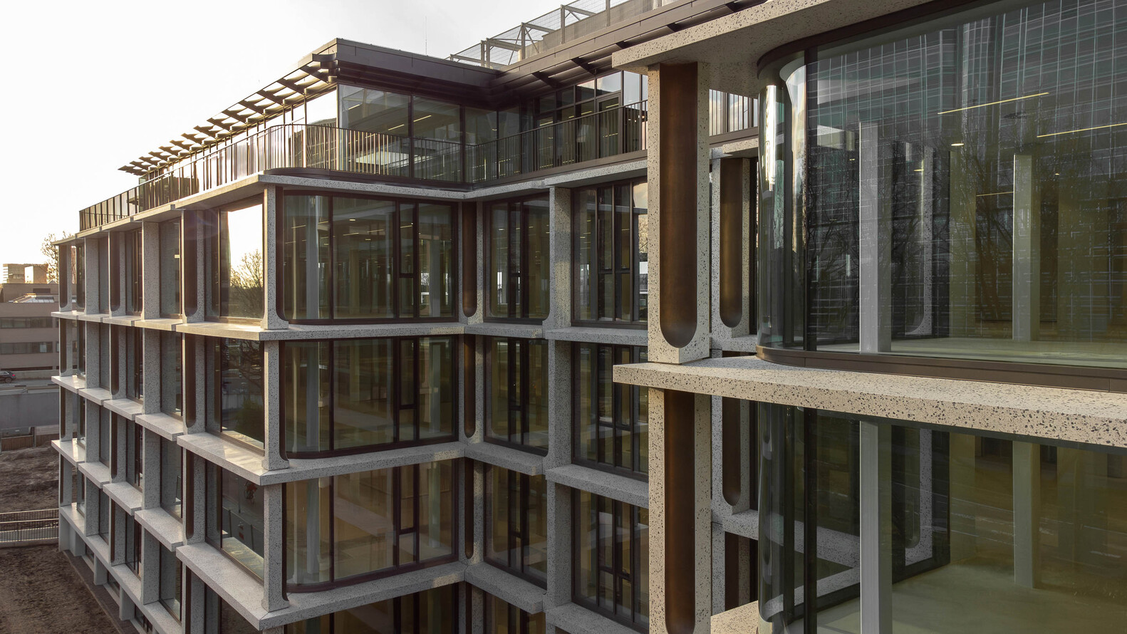 The existing concrete facade, with its pronounced brutalist character, is replaced with a facade that is the polar opposite in many respects. An open grid makes the building inviting instead of closed. Large windows with curved glass make the building transparent instead of dark. Bronze ornaments make the building refined instead of rough. Polished concrete with additional natural stone makes the building lively instead of dead. However, we use all of these elements to ensure that the solid character echoes its original character. Elegant brutalism.