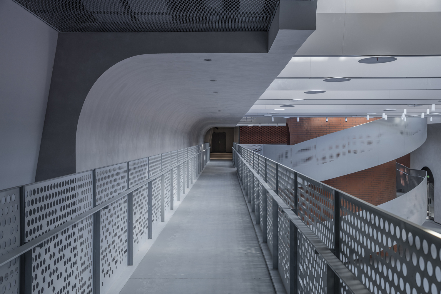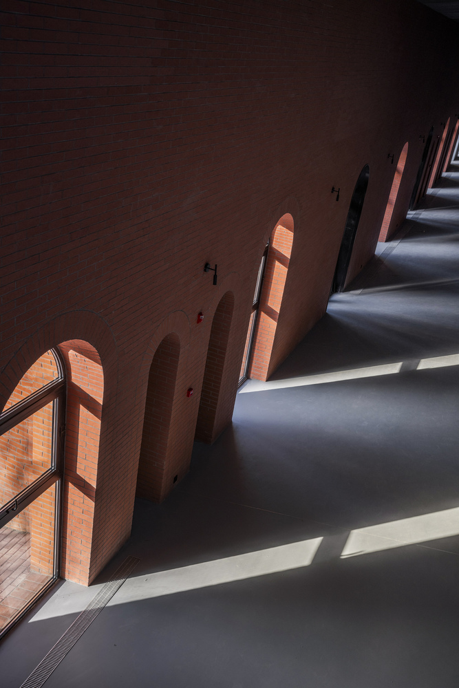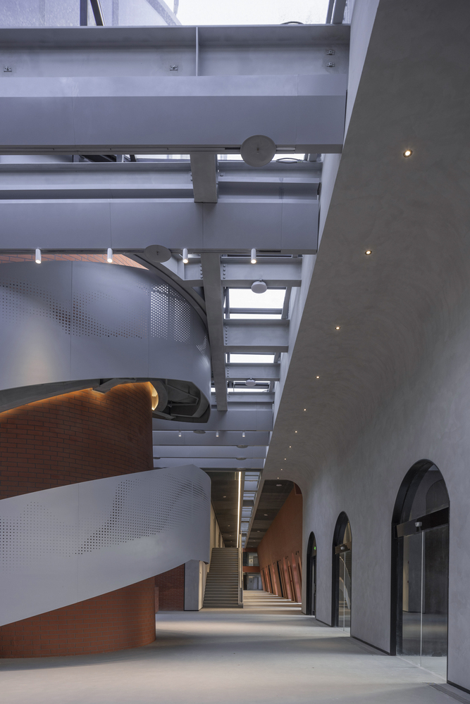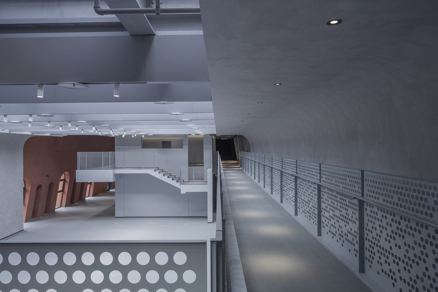 The circular kiln road inside the original brick kiln is the main brick-burning space and is 150 meters long. There are 54 arched door openings along both sides of the kiln road for entering and exiting bricks. The main flue in the middle of the kiln road connects the central chimney which removes smoke and excess heat. While the kiln road is arched, buttress walls are also set up on the exterior facade on both sides of the brick kiln to support stability. We proposed the following two design strategies for this renovation: 1. Spatial potential – strategy of expanding the height. Since the height of the internal vault of the current kiln road is low, we use a downward development strategy to generate spatial height: let the cornice of the main brick kiln remain at its original height, and the building floor extends downward by 2 meters to create a double-height space, as well as forming a sinking front square and connected to the urban road by landscape terraces. 2. Space restoration—a spatial strategy based on structural logic. Secondly, we plan to dismantle the damaged and collapsed vaults in the original kiln tunnel and use reinforced concrete walls as buttresses to structurally reinforce the half-original brick arch walls.