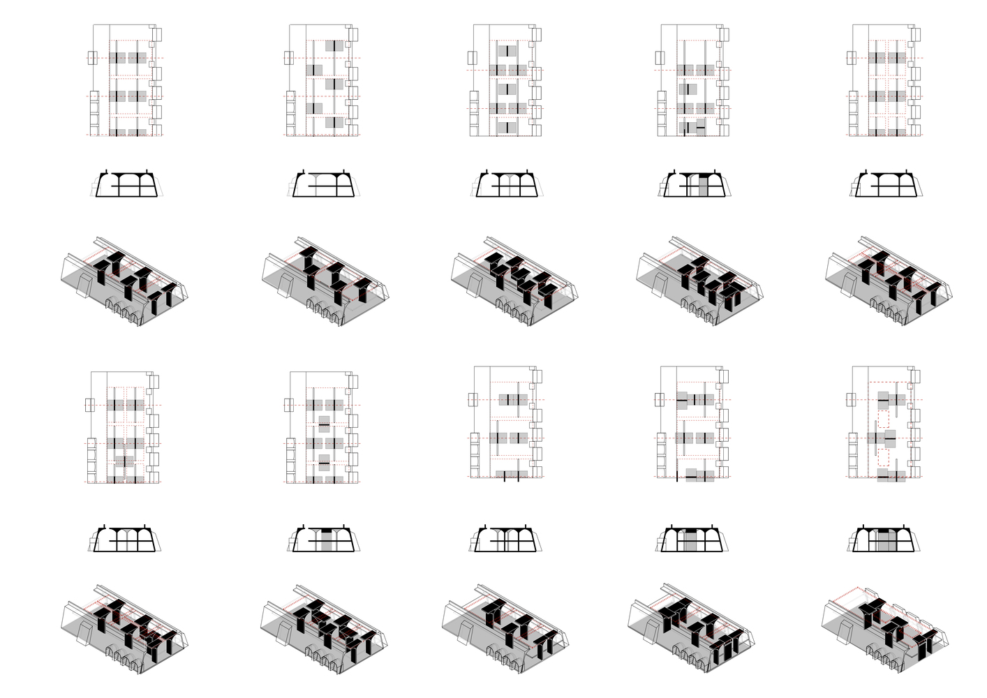 The completed concrete walls will naturally become the interior of the updated brick kiln elevation. In addition, an umbrella-shaped concrete structure is placed in the new kiln body and connected with steel beams to form a roof. Compared with the original thick vault, the new roof trusses once again release the height of the space, creating the possibility of partial mezzanines. Starting from the strategy of facade protection and structural reinforcement, we studied and thought about the internal spatial organization of the brick kiln through typology research, and explored the newly placed umbrella structure and spatial distribution relationship. Later, due to technical and cost reasons, such structural placement was not fully realized in the end, but most of the design thinking and results brought about were still retained.
