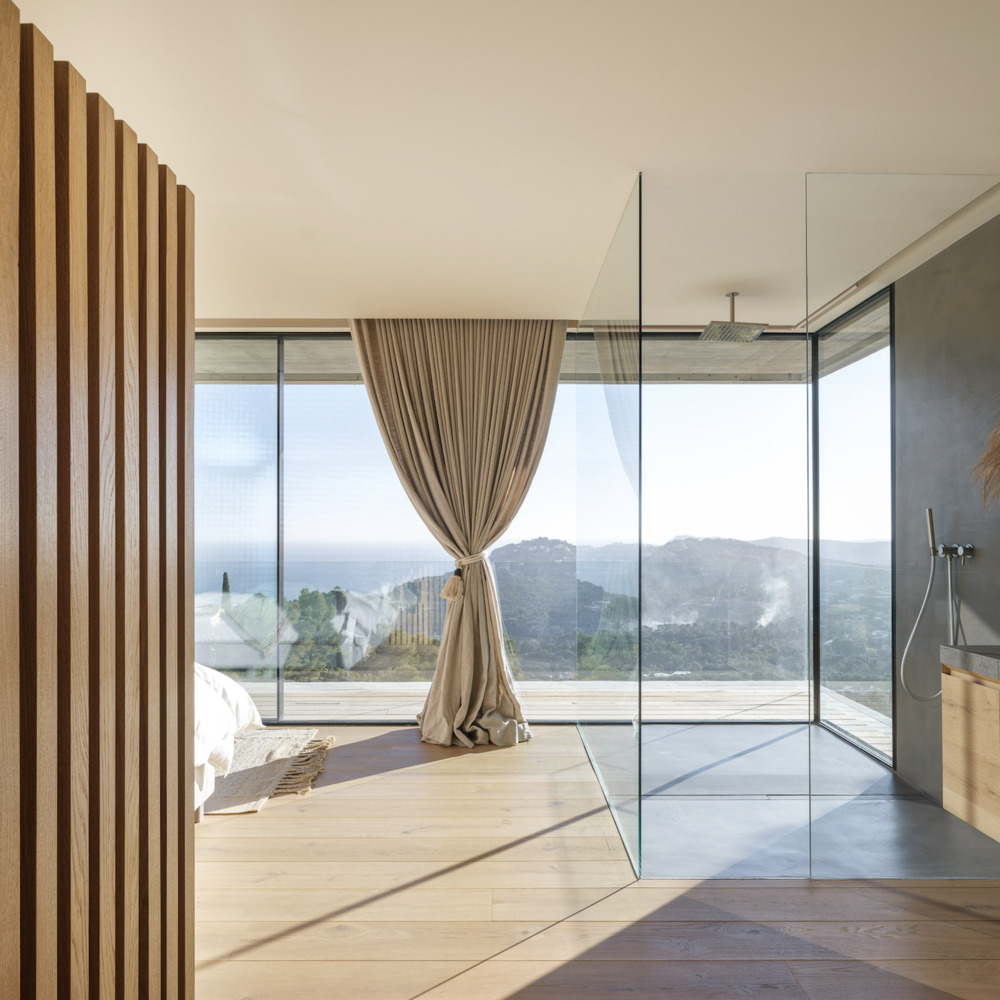 이 부지는 대부분의 표면이 상당히 경사져 있으며 도로 앞쪽(북쪽 경계)과 뒤쪽(남쪽 경계)의 고도 차이가 약 17미터에 이릅니다. 접근은 구획의 가장 높은 지점(약 고도 180)에 있는 아자바라 거리를 통해 이루어집니다. 이 프로젝트에는 거리 수준 (북동쪽 모서리)에 미터가 포함됩니다. 집은 메인 볼륨 (집 입구 및 야간 영역)으로 구성되어 있으며 그 아래에는 낮 영역이 있으며 수영장이있는 외부 (테라스 및 전망)를 향해 완전히 연결되고 투영됩니다. 밤 영역을 형성하는 볼륨은 집의 주요 공간을 보호하는 바위 덩어리로 이해됩니다. 차량과 보행자 모두 부지에 대한 접근은 집 지붕을 통해 이루어지며, 차고는 도로에 부착 된 차고 (플롯 전면 길이의 1/3을 차지)가 지형 프로파일에 완전히 통합되어 있으며 (도로 수준의 정원 지붕 덕분에) 동일한 지붕을 접근 및 기동 공간으로 사용합니다. 이 접근 지붕에서는 아이구아블라바 만의 전망을 감상할 수 있습니다. 지붕과 바로 아래층(-1층)을 연결하는 파티오를 통해 숙소로 출입할 수 있습니다. 상단이 개방된 이 파티오 공간은 외부 둘레가 완전히 닫혀 있고 내부 현관으로 완전히 개방되어 하나의 지각 공간을 형성합니다. 따라서 이 단단한 볼륨에 들어가면 시야가 사라지고 레벨 -2(낮 영역)에 도달할 때까지 다시 나타나지 않습니다. 이 출입 층에는 현관(아래층인 낮 구역으로 이어지는 나선형 계단 포함), 세탁실, 욕실이 딸린 침실 3개가 있으며, 단단한 볼륨 안에 위치한 지붕이 있는 테라스로 연결되며 전망을 감상할 수 있습니다.translate by Deeple