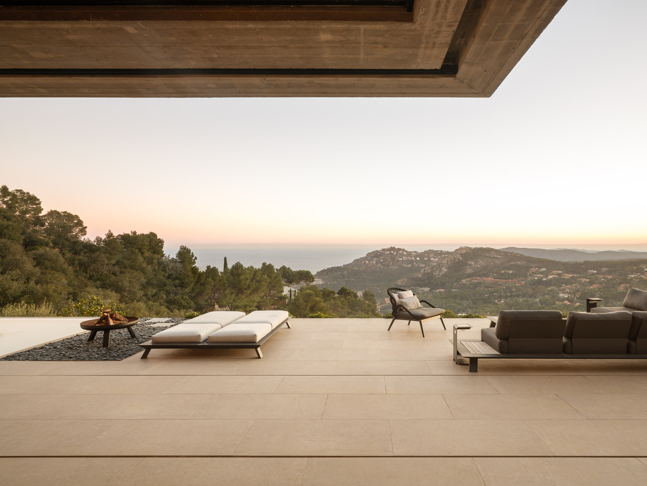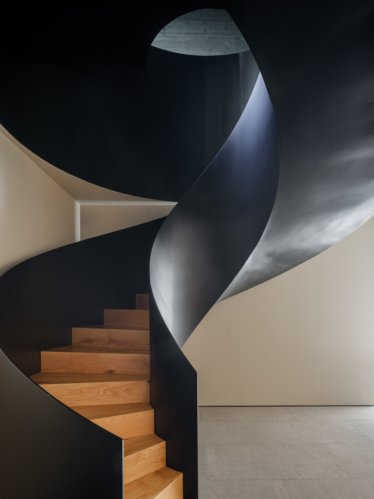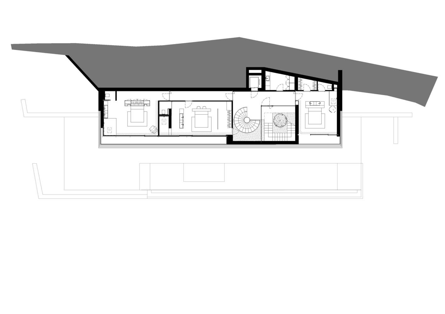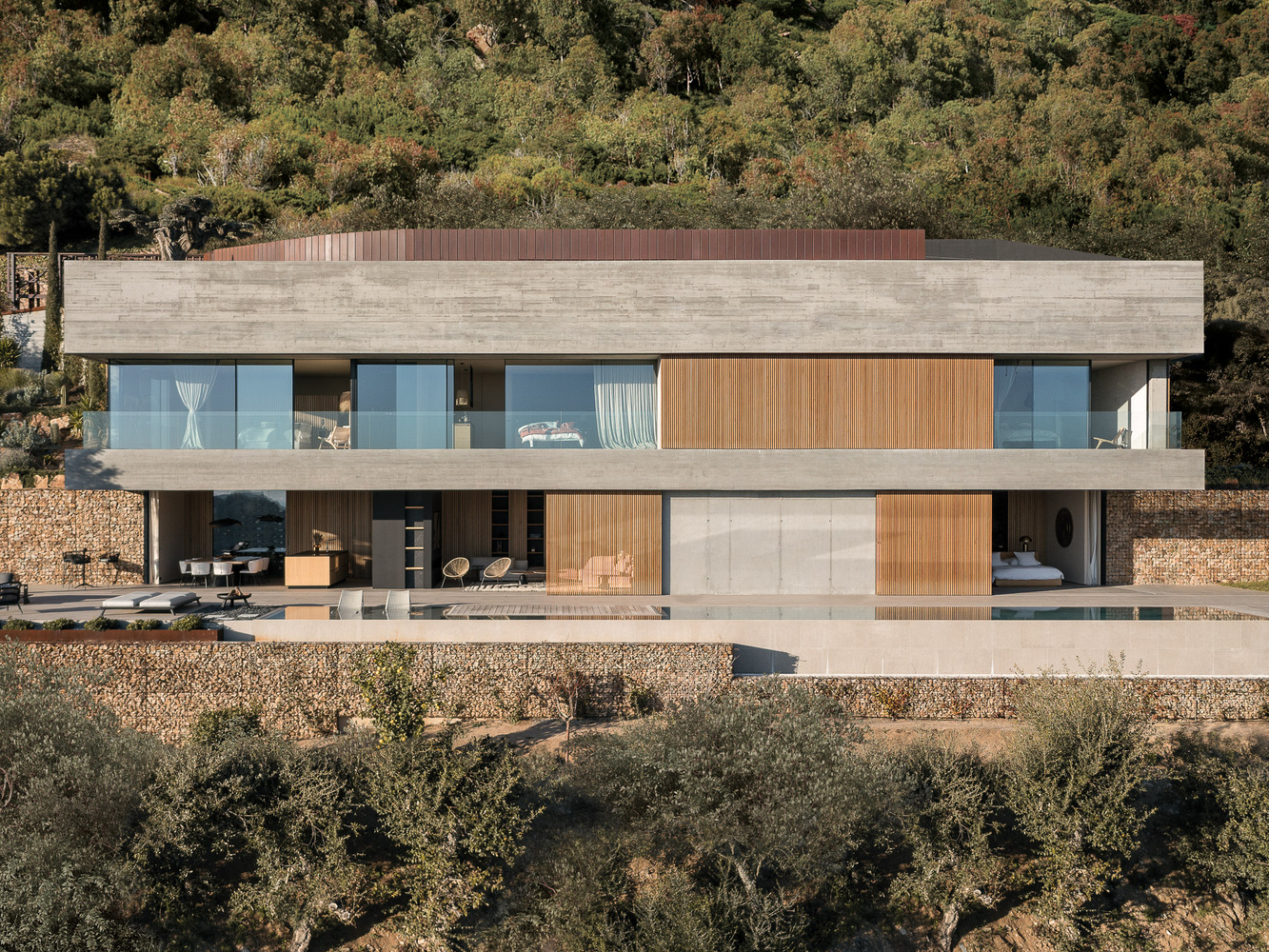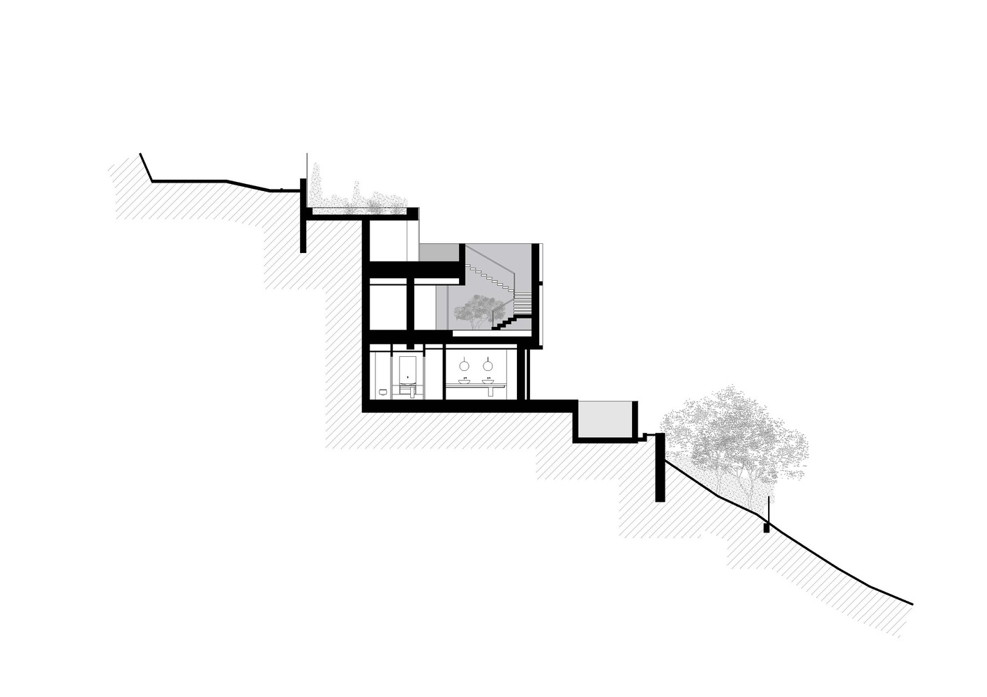 Access to the plot, both for vehicles and pedestrians, is through the roof of the house, with the garage attached to the street (occupying 1/3 of the length of the front of the plot) fully integrated into the terrain profile (thanks to a garden roof at road level), and using the same roof as access and maneuvering space. This access roof offers views of Aiguablava cove. Access to the house is through a patio that connects the roof with the floor immediately below (level -1). This patio space, open at the top, is completely closed around its exterior perimeter and completely open to an interior vestibule, forming a single perceptual space. This allows the views to disappear upon entering this solid volume and not reappear until reaching level -2 (day area). On this access floor are the vestibule (including the spiral staircase leading to the lower level - day area), a laundry room, and three bedrooms with ensuite bathrooms that have access to a covered terrace nestled within the solid volume, with views.