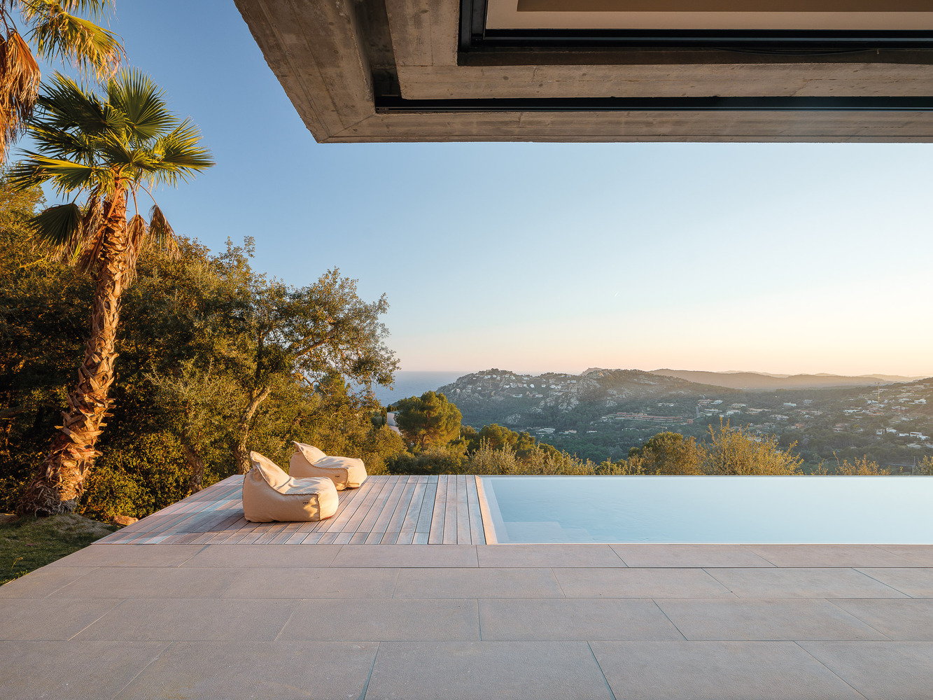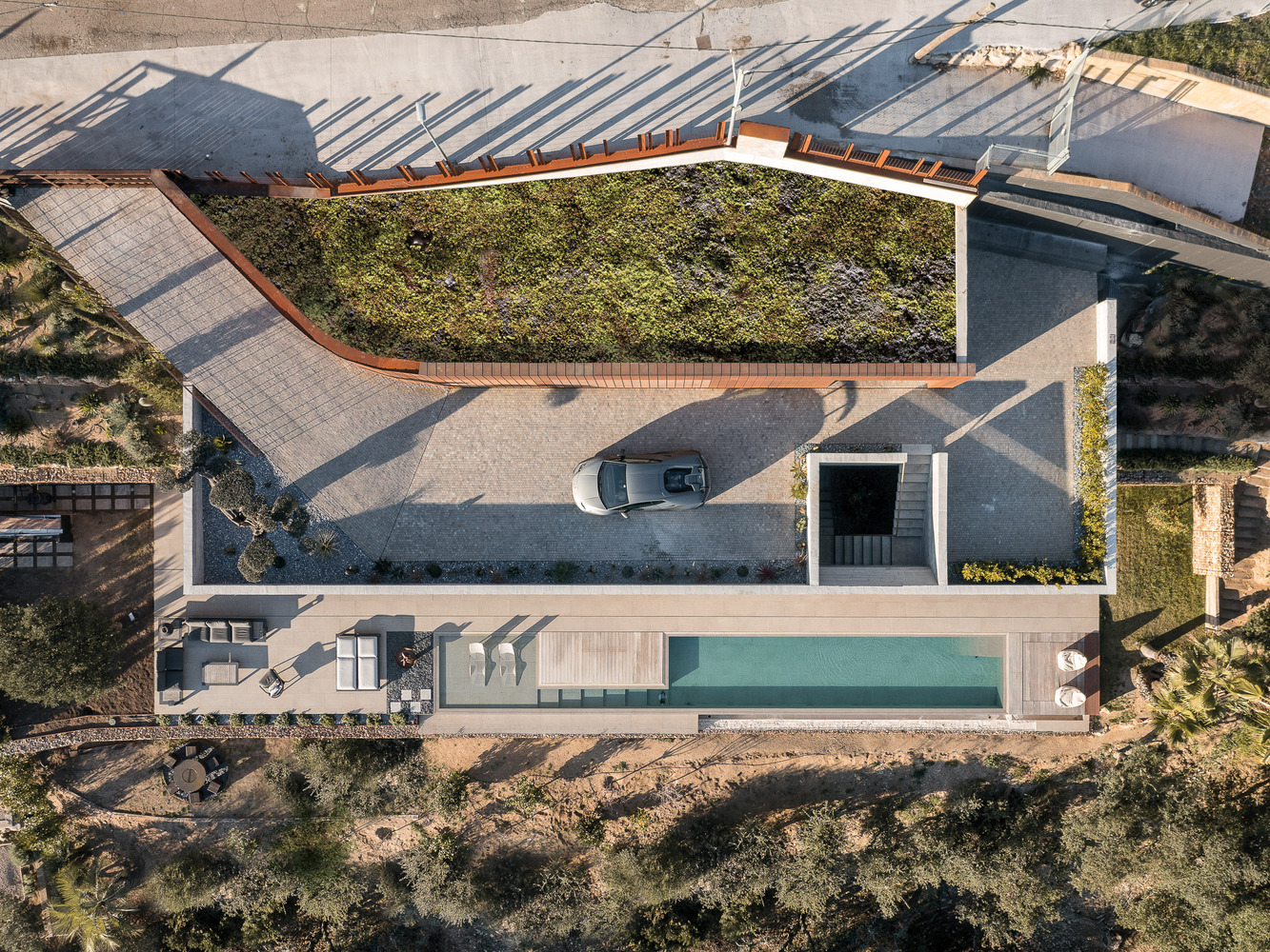 The plot has a significant slope over most of its surface, with a difference in elevation between the front of the road (north boundary) and the back (south boundary) of approximately 17 meters. Access is through Atzavara Street, at the highest point of the plot (approx. elevation 180). The project includes having meters at street level (northeast corner). The house consists of a main volume (entrance to the house and night area), under which is the day area, fully connected and projected towards the outside (terrace and views), where the pool is located. The volume that forms the night area is understood as a rocky mass that shelters the main space of the house.