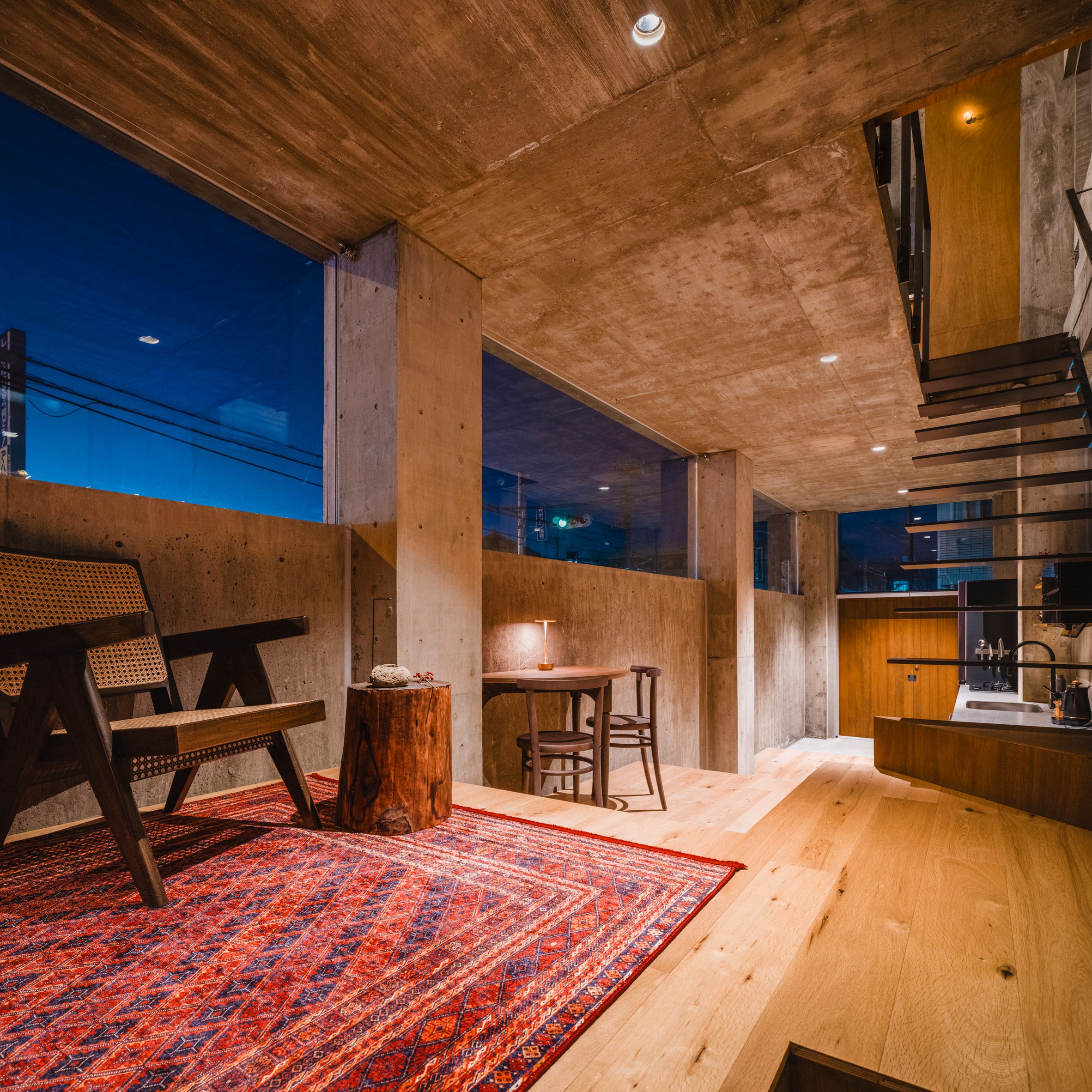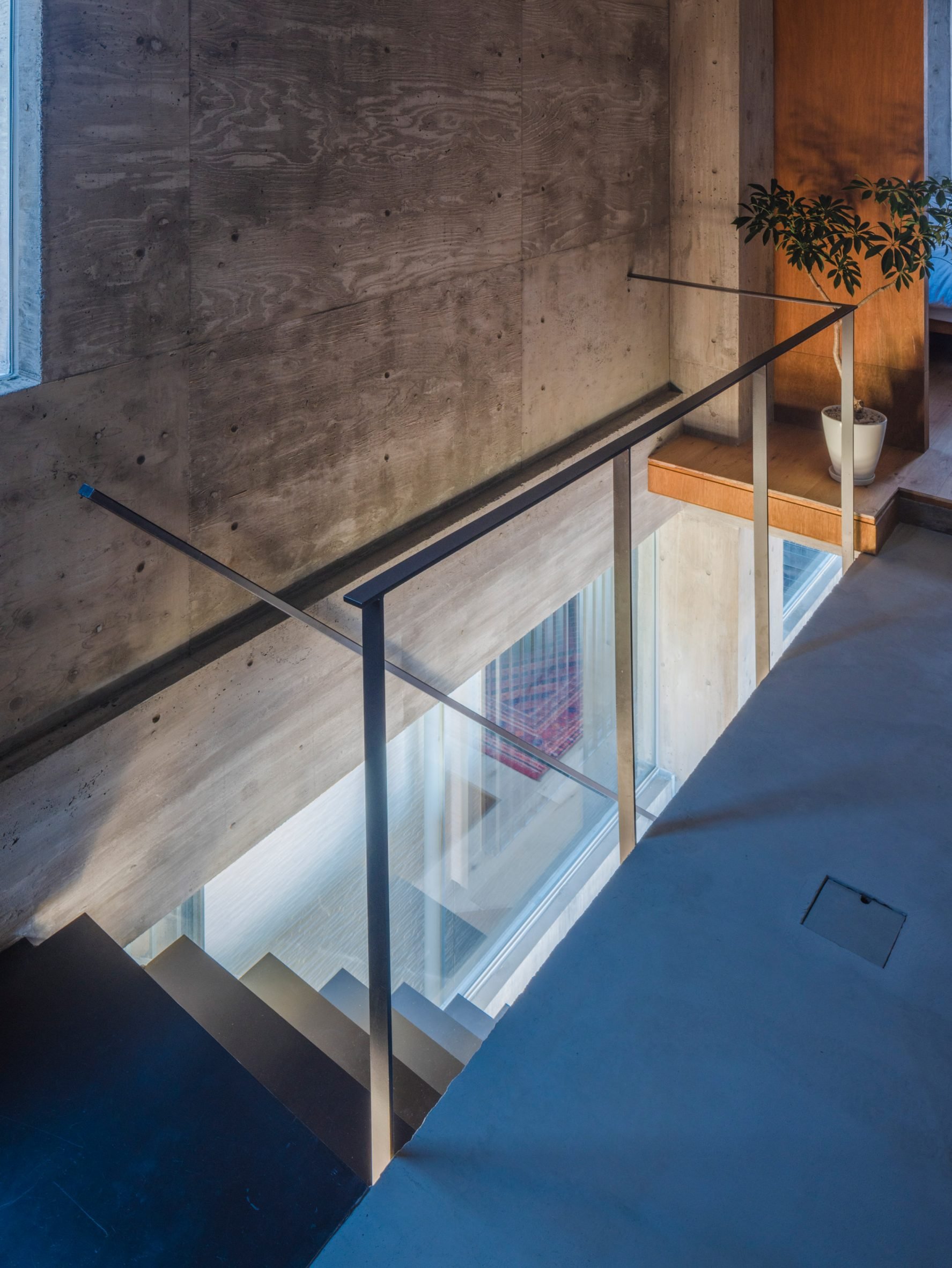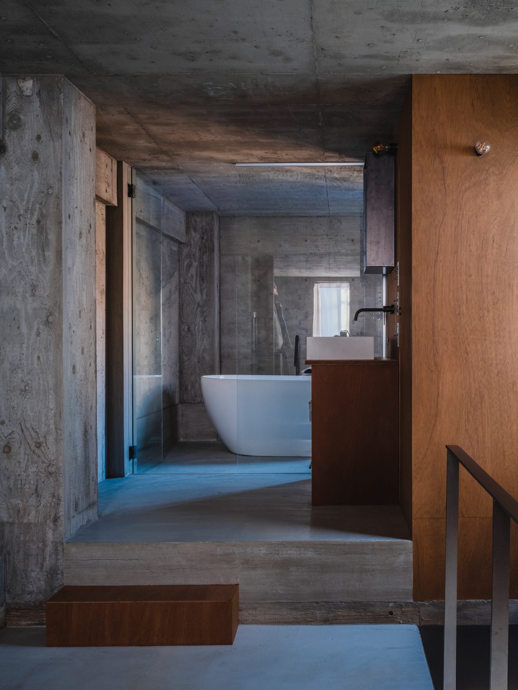 On the ground floor, windows are placed at a clerestory height to provide privacy. Upstairs, smaller slot windows punctuate the concrete to provide light to the bedroom, bathroom and hallway.