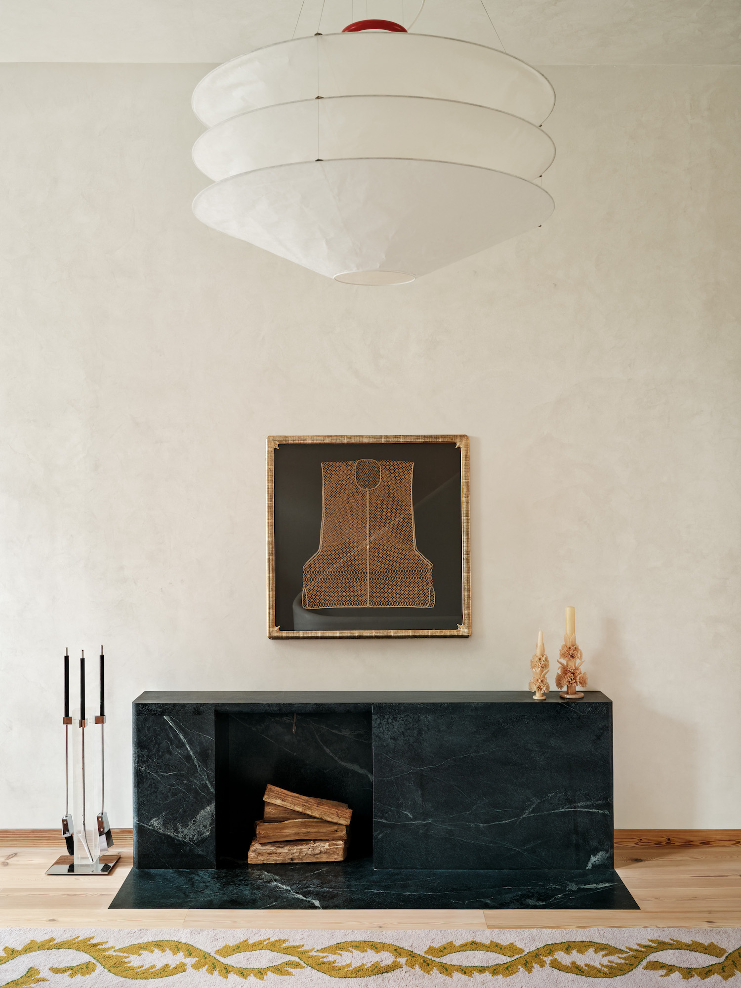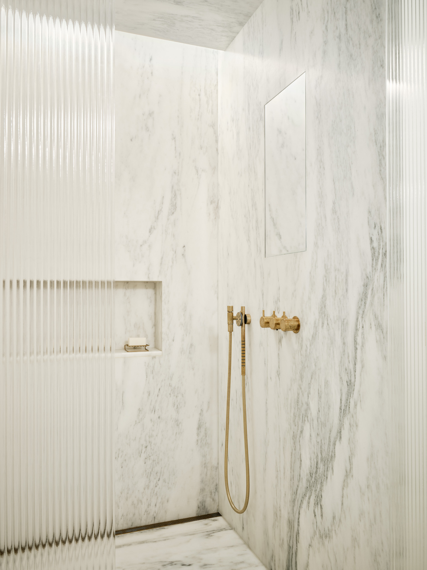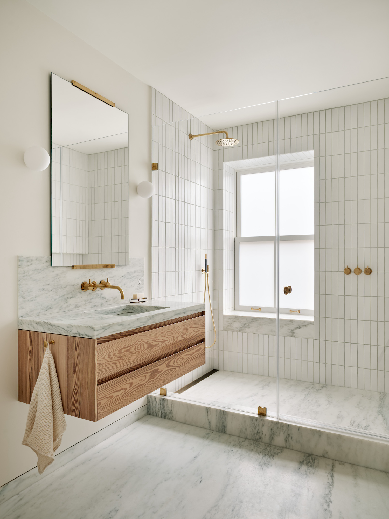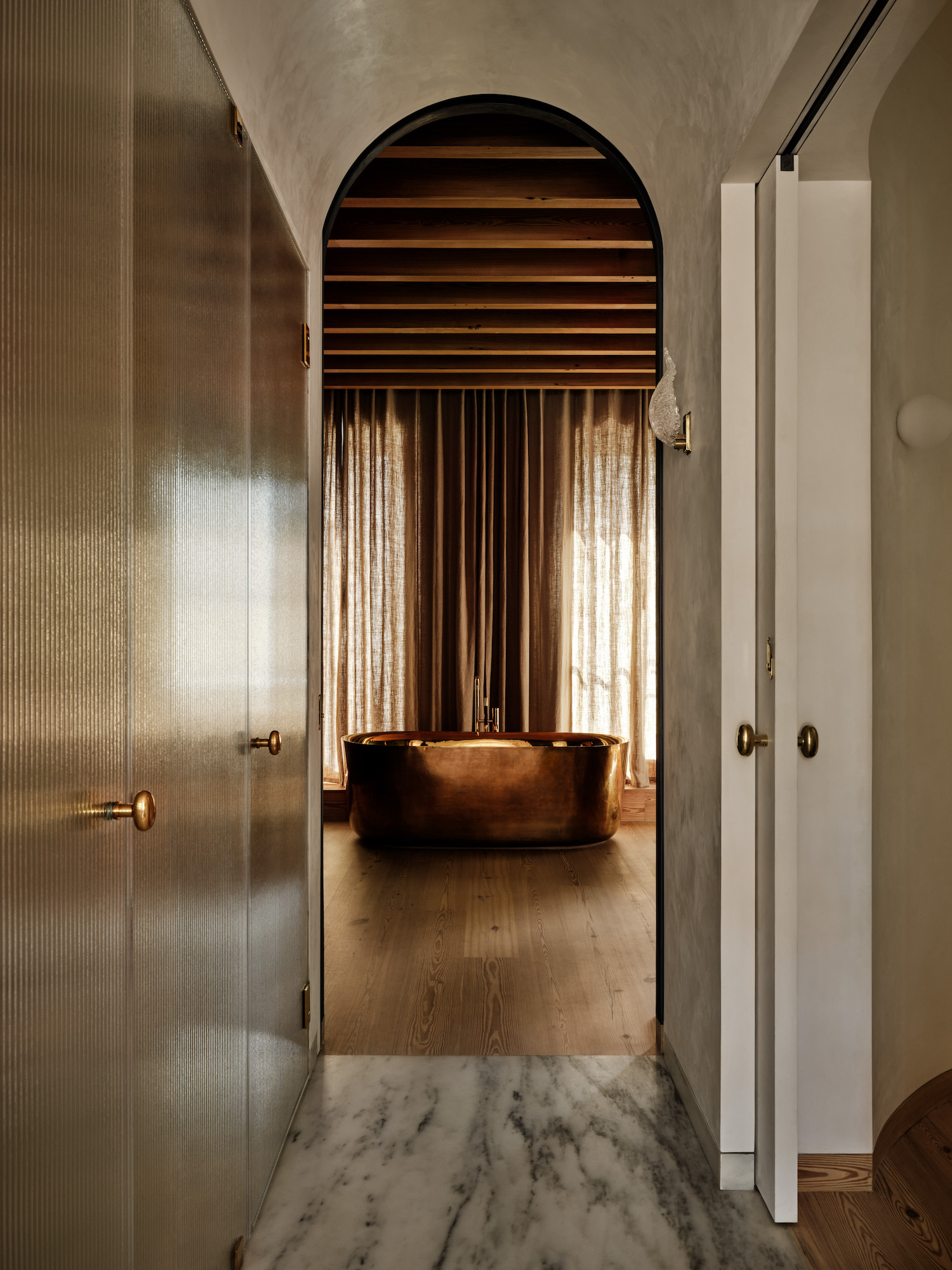 The project places a strong emphasis on materiality and detail. Reclaimed heart pine beams from an 1850s New York building find new life here as structural elements, flooring, decking, and window details, with their imperfections intentionally preserved to celebrate their history. Vermont sourced marble, characterized by its dynamic veining, brings vitality to the bathrooms and the kitchen’s standout island. Reflecting a piece of New York’s architectural heritage, cast glass vault lights are strategically placed in the rear yard to illuminate the space below, adding an element of surprise and delight. A custom-designed brass bathtub in the primary suite stands as a sculptural focal point, further demonstrating the project’s dedication to unique, bespoke elements. The interior decor strikes a balance between specially commissioned items and carefully selected pieces, including a distinctive checkered walnut gaming table, underscoring the townhouse’s blend of personalization and historical reverence.