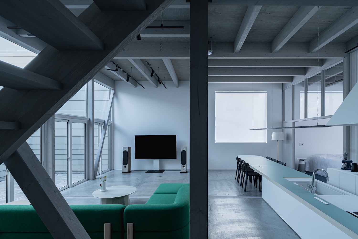 The design philosophy particularly emphasizes the adaptability of living spaces to changing lifestyles. Inspired by the notion that physical boundaries should be generous and ambiguous, the project aims to create a unified, flexible space that could morph in function over time. The architect, drawing inspiration from various literary and philosophical sources, imagines the entire site as a “general vicinity” where different perspectives and interactions coalesce to form a coherent living environment. This residence is tailored for a couple who relocated from Honshu, seeking a life that balances remote work with outdoor activities, while embracing modern digital conveniences. The design exceeds traditional building coverage ratios to craft an expansive, multifunctional area of approximately 250 square meters, which can dynamically adjust to the evolving needs and rituals of its inhabitants.