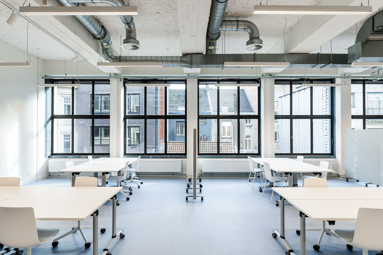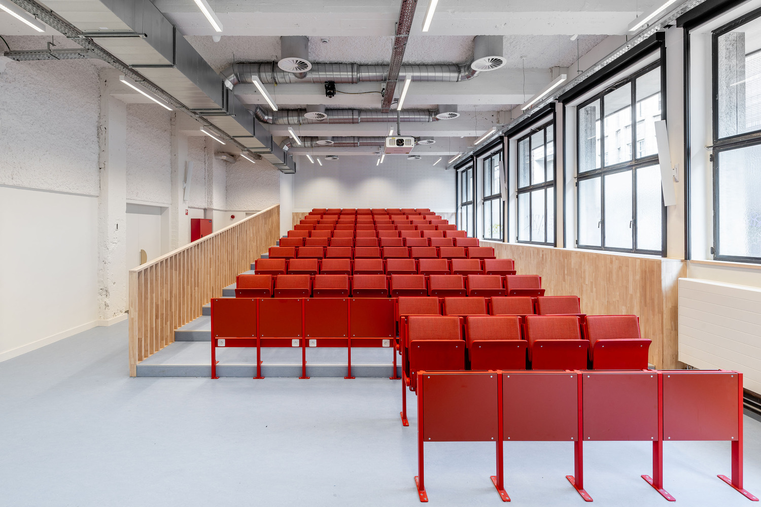 Renovation and restoration of the former Provincial Safety Institute in Antwerp's Jezusstraat in the historic city center. The building was transformed into a new innovative learning environment for KU Leuven students (Faculties of Arts and Economics and Business Administration). It now houses a library with silent workplaces and group workrooms, a meeting area with a cafeteria and several classrooms: an auditorium, state-of-the art language and interpreting labs, a quiet room, and so on.