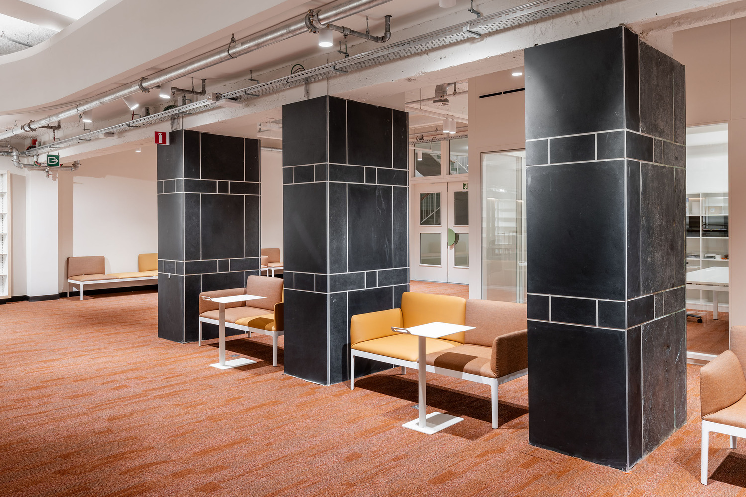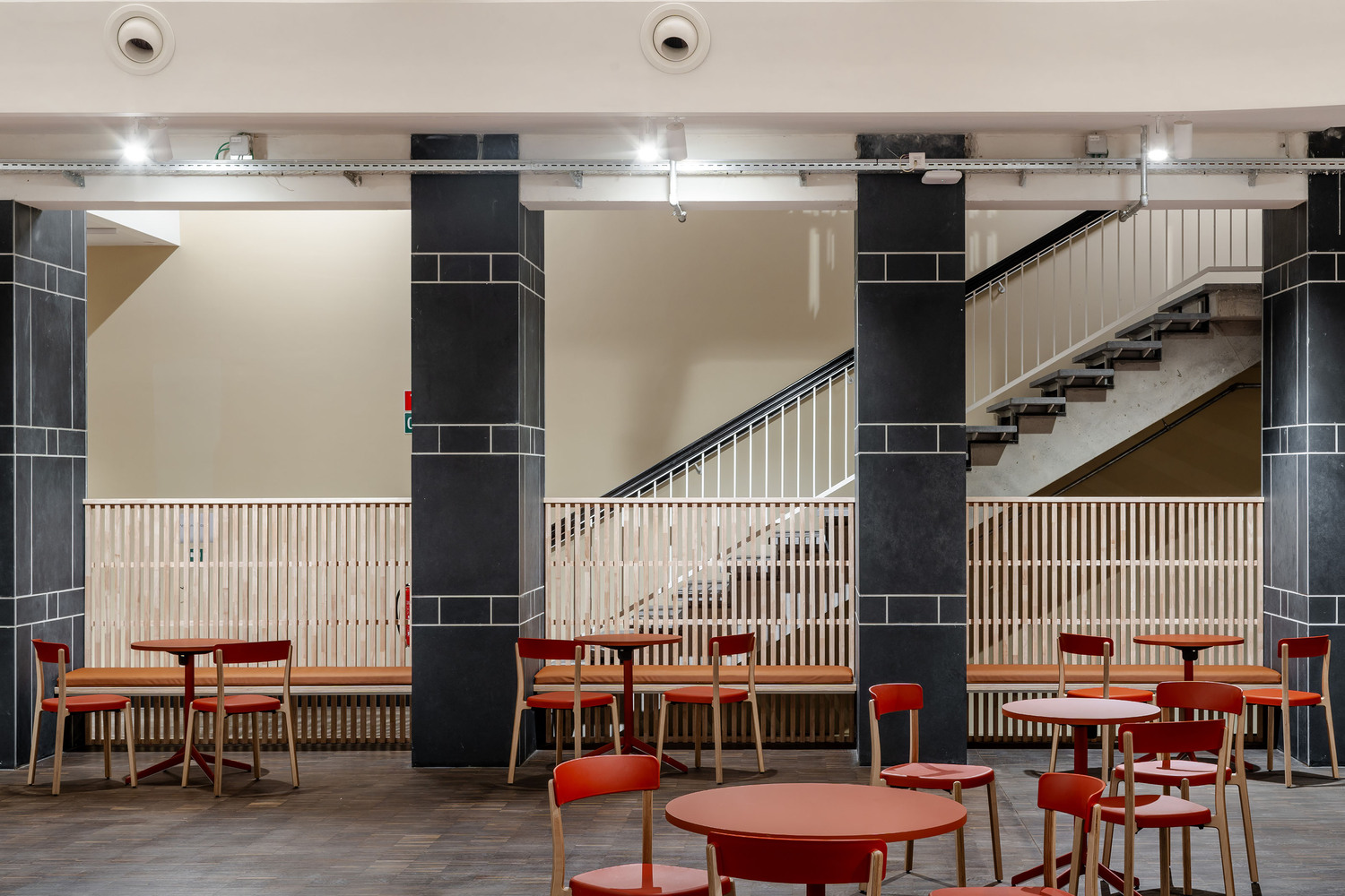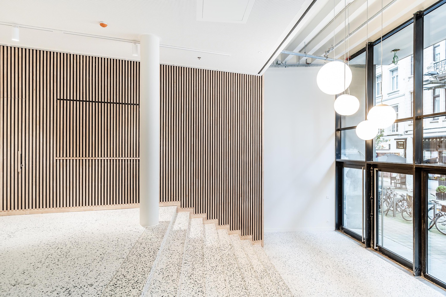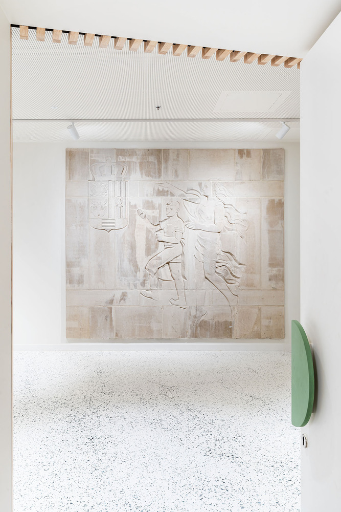 The existing building formed the ideal framework for a contemporary learning platform - especially its original fifties design. The original grandeur was restored, along with a few valuable interventions - including conforming it to current legislation on accessibility and fire safety. The main entrance was retained on Jezusstraat, with a limited (pop-up) hospitality area to the side. The main building is located in the middle of the building block and was originally a beautiful atrium, spreading from the ground to the third floor.