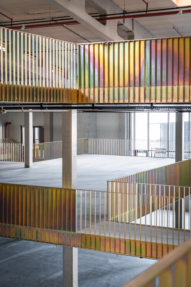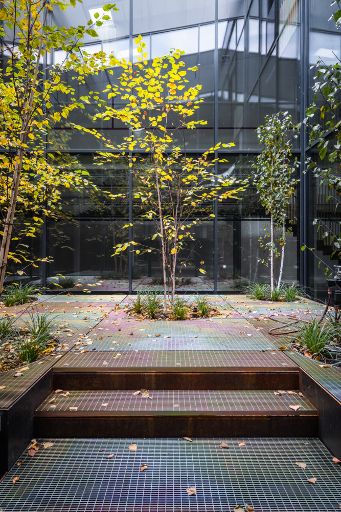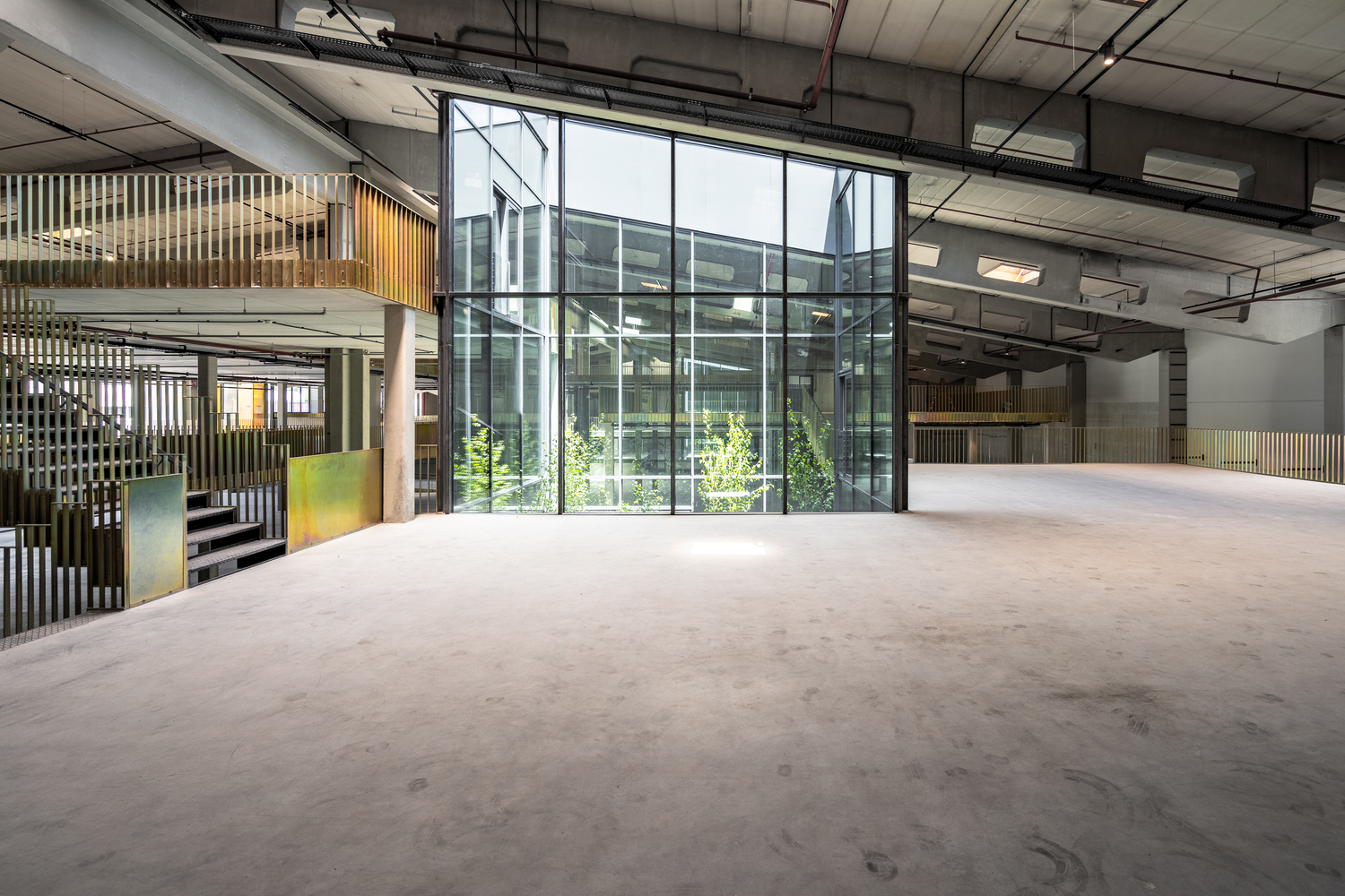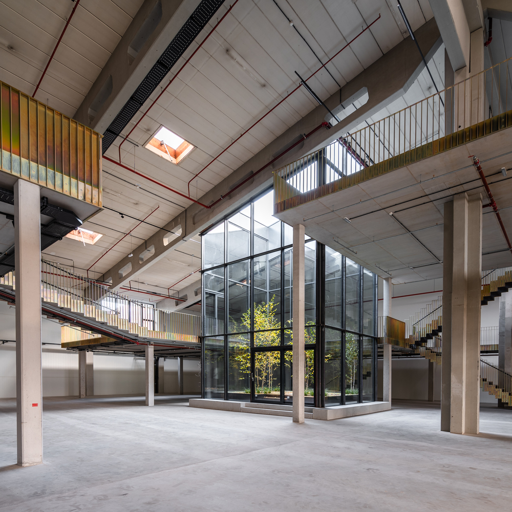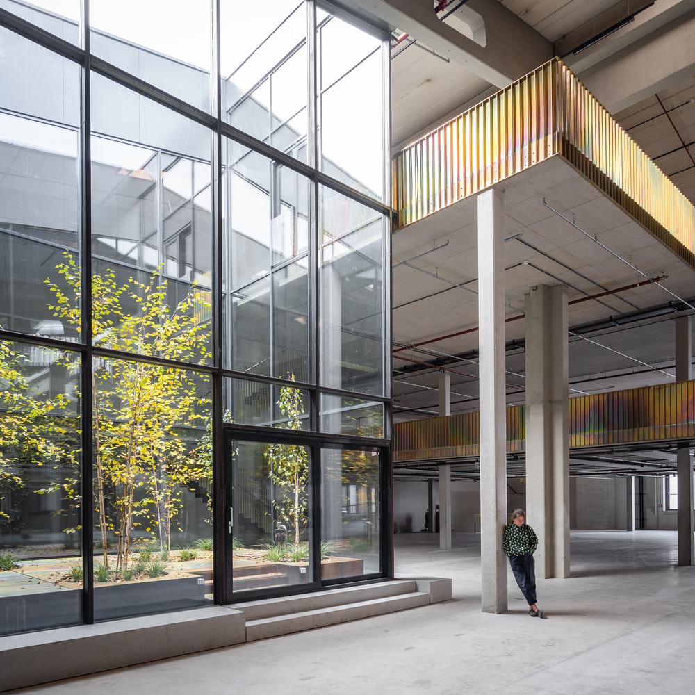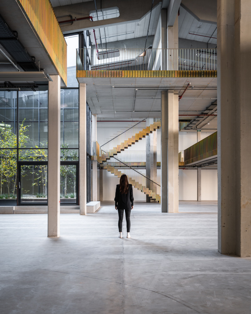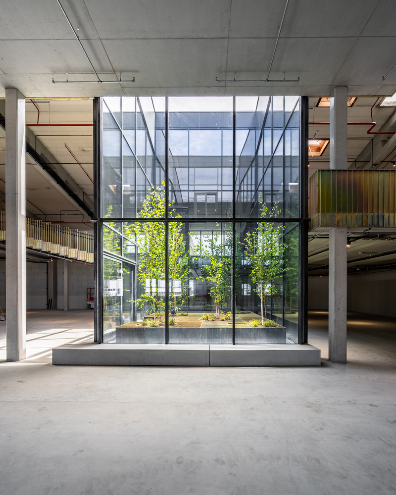 Once the halls have been emptied, their full potential is revealed. Enormous room heights, raw materials, and large column grids become visible. Compared to a classic office building, these parameters create incredible flexibility for use - and great scope for exciting architecture. The depths of the hall combined with small façade areas create a difficult lighting situation, which is responded to with minimally invasive architectural interventions. Generous atriums cut into the existing roof bring daylight and a real outdoor space into the center of the warehouse.