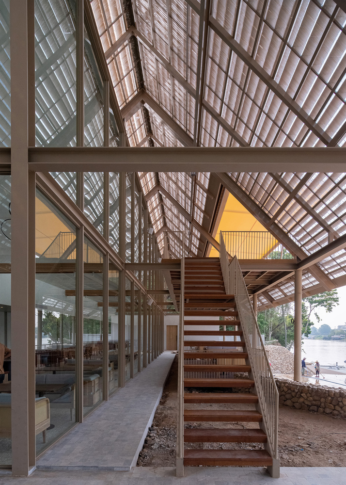 As for the building, the designers tried to lower the roof of the building to not be higher than the surrounding tree line in order to blend in with the context, resulting in the balcony area protruding from the roof line to be used as a dining area. Also to be an observation area along the Kwai Yai River, which can be seen all the way to the Bridge over the River Kwai. Expanding more about the roof, we used a translucent roofing material to bring in as much natural light as possible, but because the weather in Thailand is quite hot, we built slats on the roof to control the light coming in just enough. Our main structure will be steel and wood sourced from local suppliers. The original building is in the same location as the current building. We dismantled and kept some parts for use, such as The wooden pillars that were cut into pieces and made into an entrance to commemorate the building that was here before.