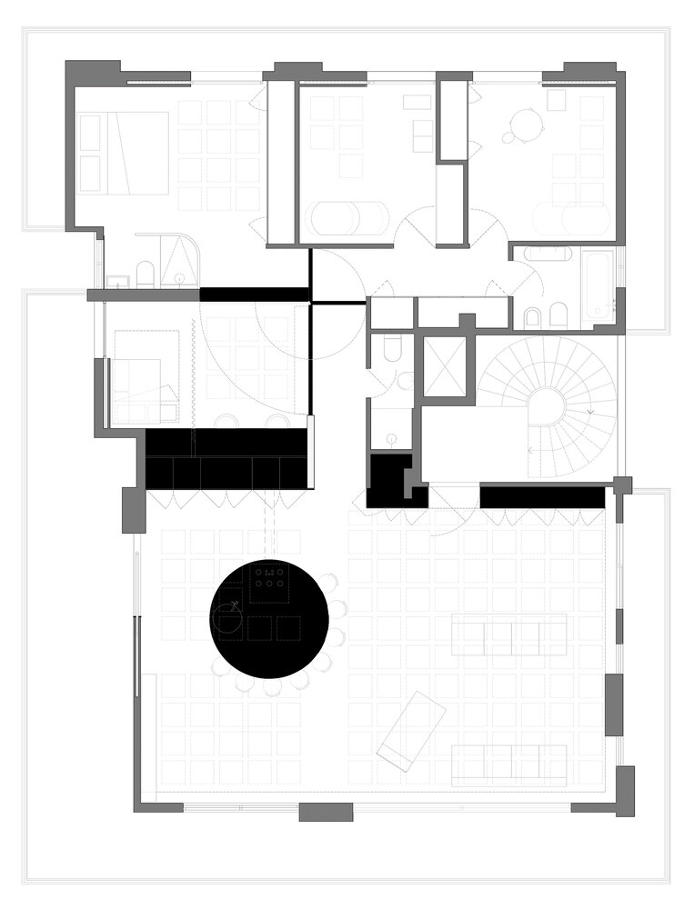 • Pilotis가 제공하는 유연성은 1층 주택에 영감을 줬다. 클라이언트는 최대한의 유연성과 개방성을 갖춘 집을 요구했다. 우리의 설계는 이 프로그램에 대한 대응으로 아파트를 그 뼈대까지 해체하여 외부 껍질과 와플 천장을 드러내고 세 개의 중간 규모 기능적 오브제를 도입했다. 원형 주방 섬은 작업대와 식사 테이블의 결합으로 사교적인 요리와 집합을 유도한다. 깔끔한 저장 블록에는 부엌 식료품 저장실, 망토, 옷장 및 유틸리티가 포함되어 있다. 십자가는 대규모 회전판 두 장과 중심을 중심으로 회전하는 두 개의 피벗 문으로 이루어진 복도 분할로 인접한 방들에 유연성을 제공한다.