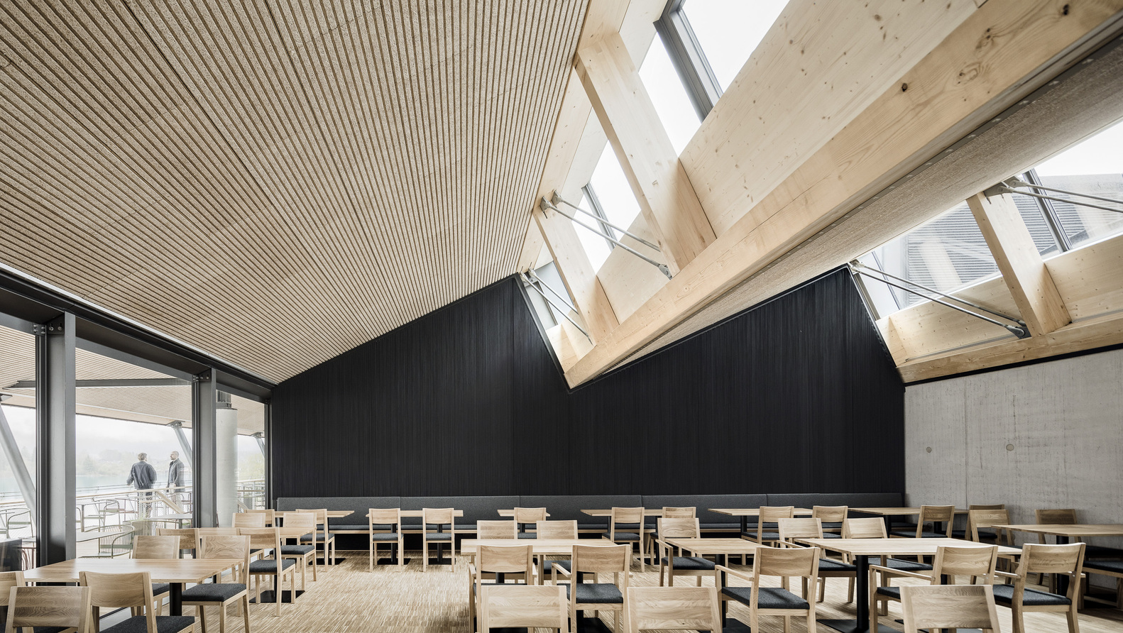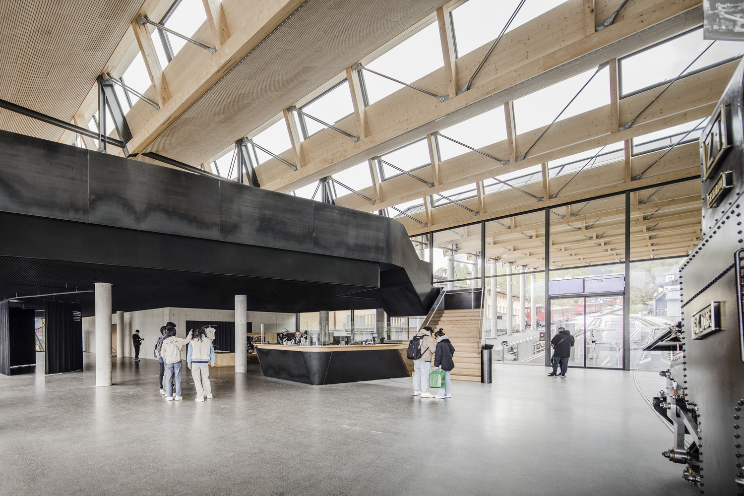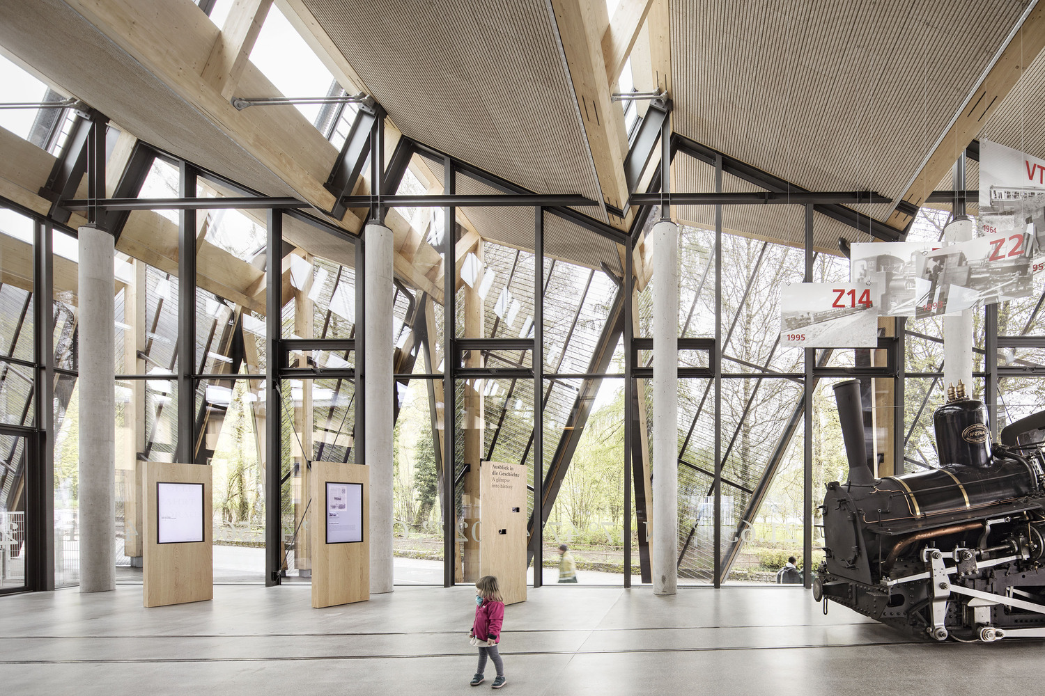 In the main building, the various public functional areas such as the entrance hall with ticketing, exhibition, shop, restaurant, and event area were arranged in an open hall. This was strongly opened to the surroundings by circumferential glazing in the facades and in the shed roof, thus creating a reference to the lake and the mountains.