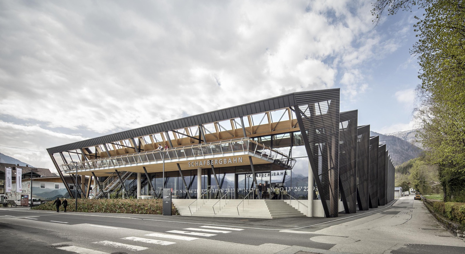 The valley station of the cogwheel railway is located at the foot of the Schafberg directly on Lake Wolfgang. It consists of a two-story main building and a single story outbuilding. Together with the existing buildings of the workshops, they enclose the station area in a courtyard-like manner. A shed roof stretches over the two new buildings, which also creates the platform canopy and spatially connects the large form of the station.